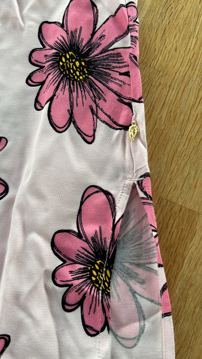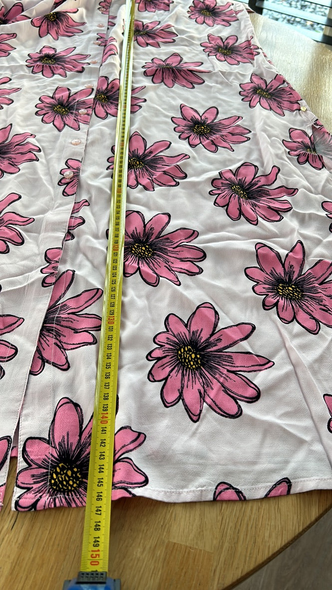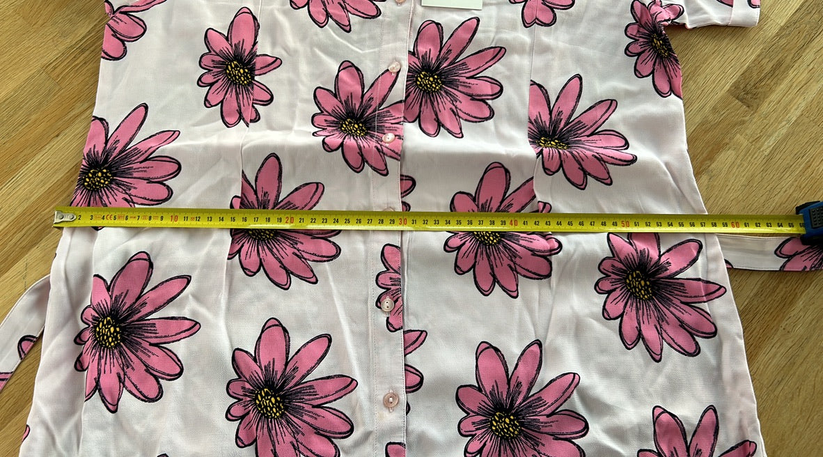 - Knoopjes tot onder, kraagje, korte mouwen, knooplint rond de taille, gouden details