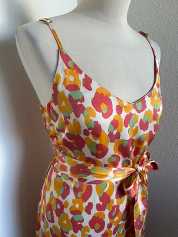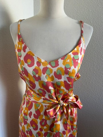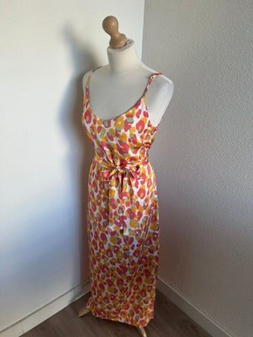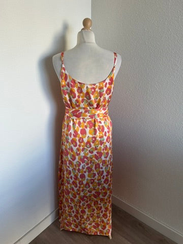 - Verstelbare spaghetti bandjes, v-hals, lamg model met splitjes onderin de rok, knooplint rond het middel, gouden details
