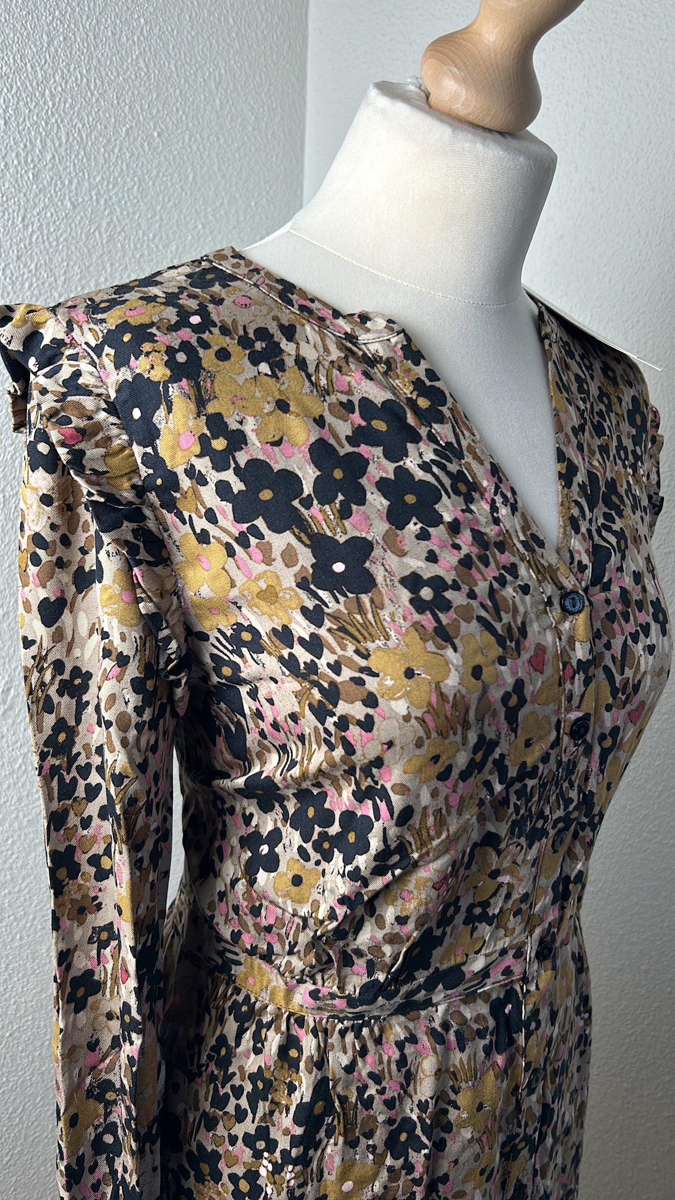 - Knoopjes tot onder, v-hals, lange mouwen, gouden details