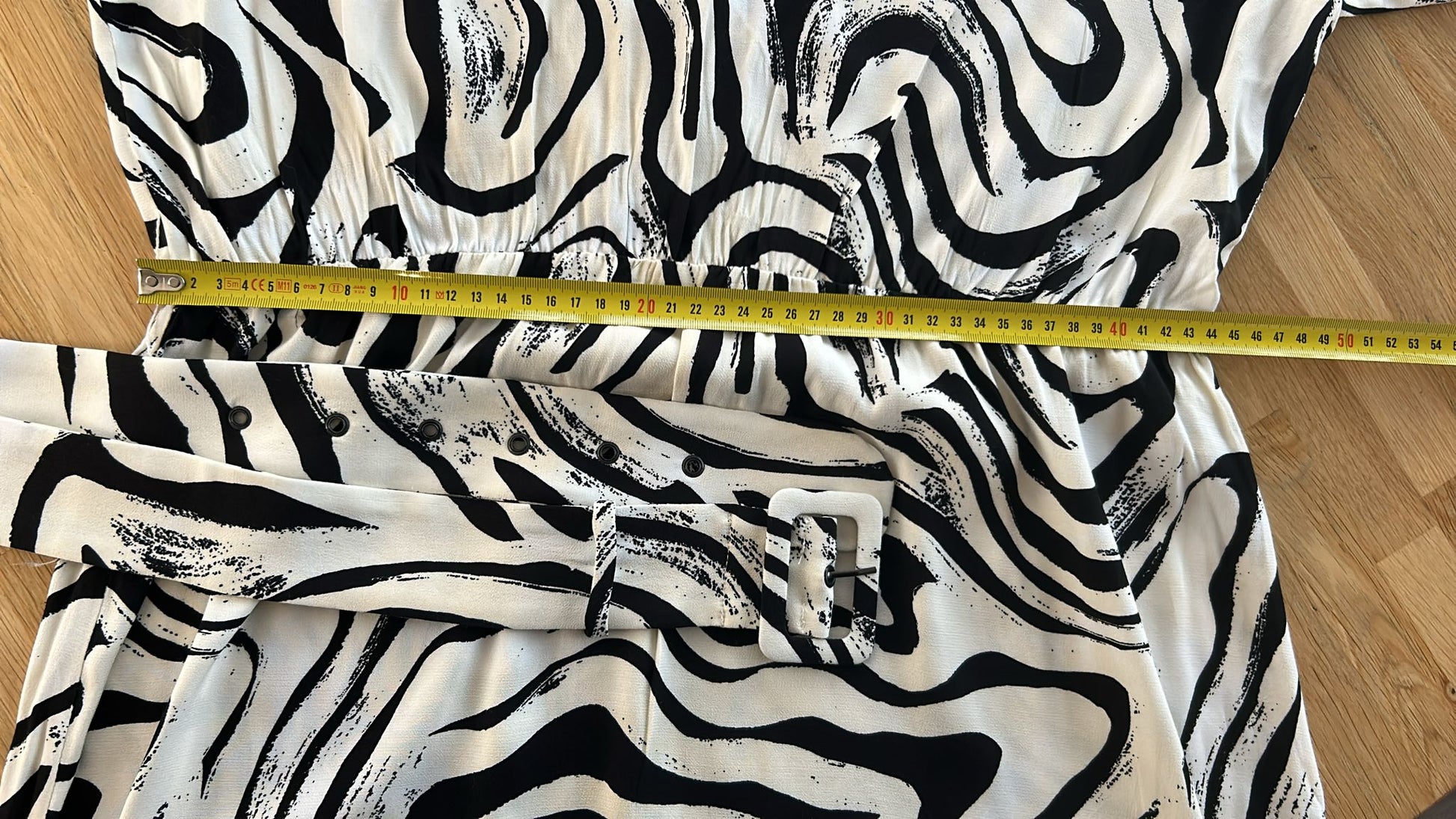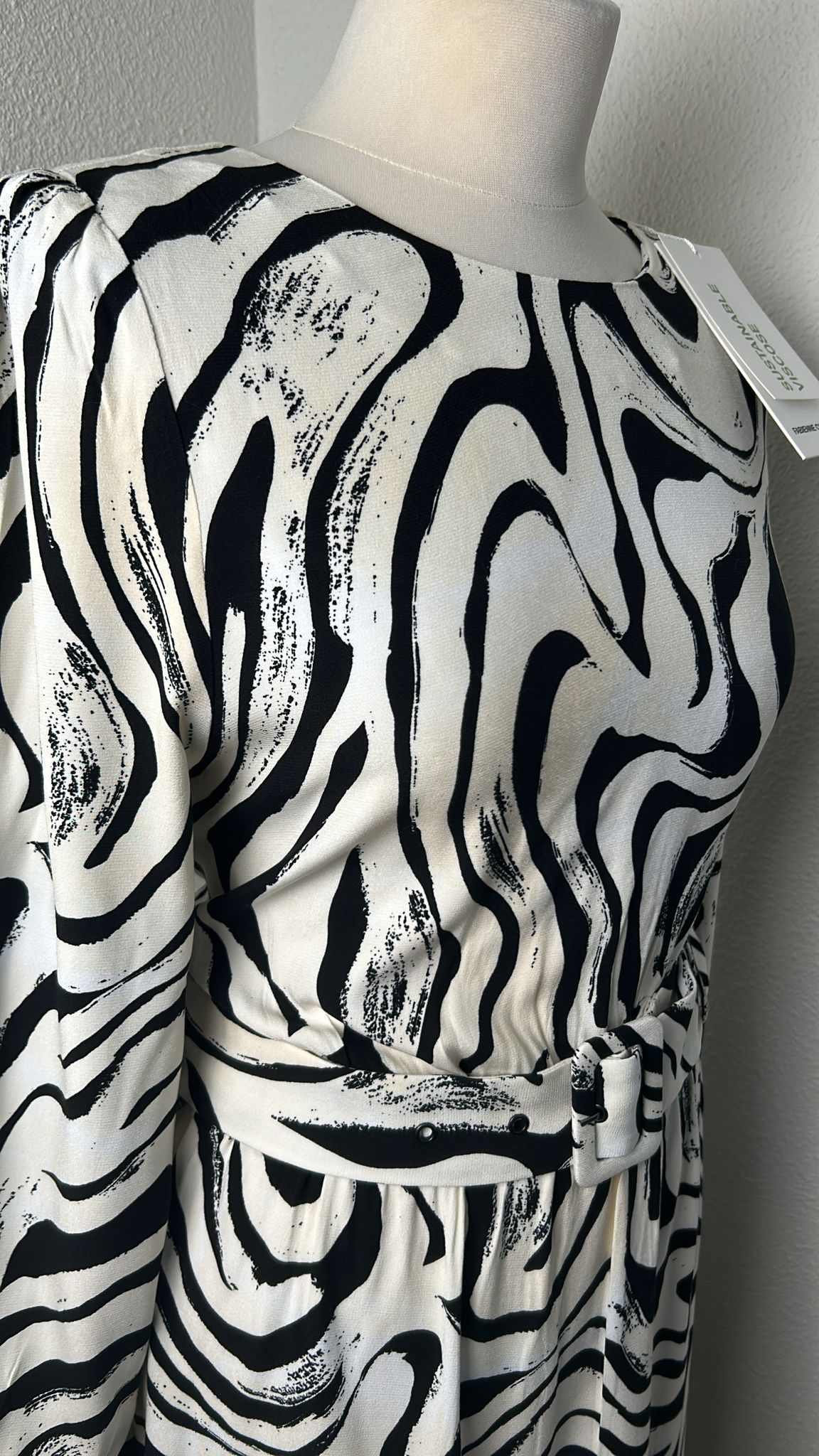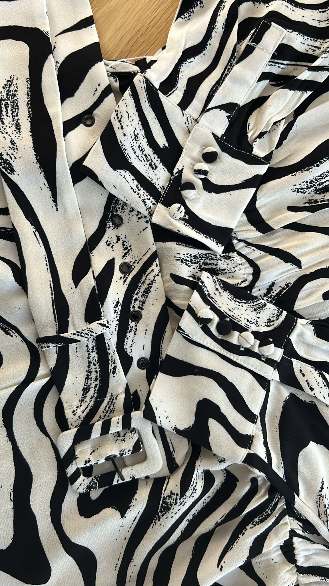 - Boothals, nek detail met knoopje, riem rond de elastische taille, lange mouwen