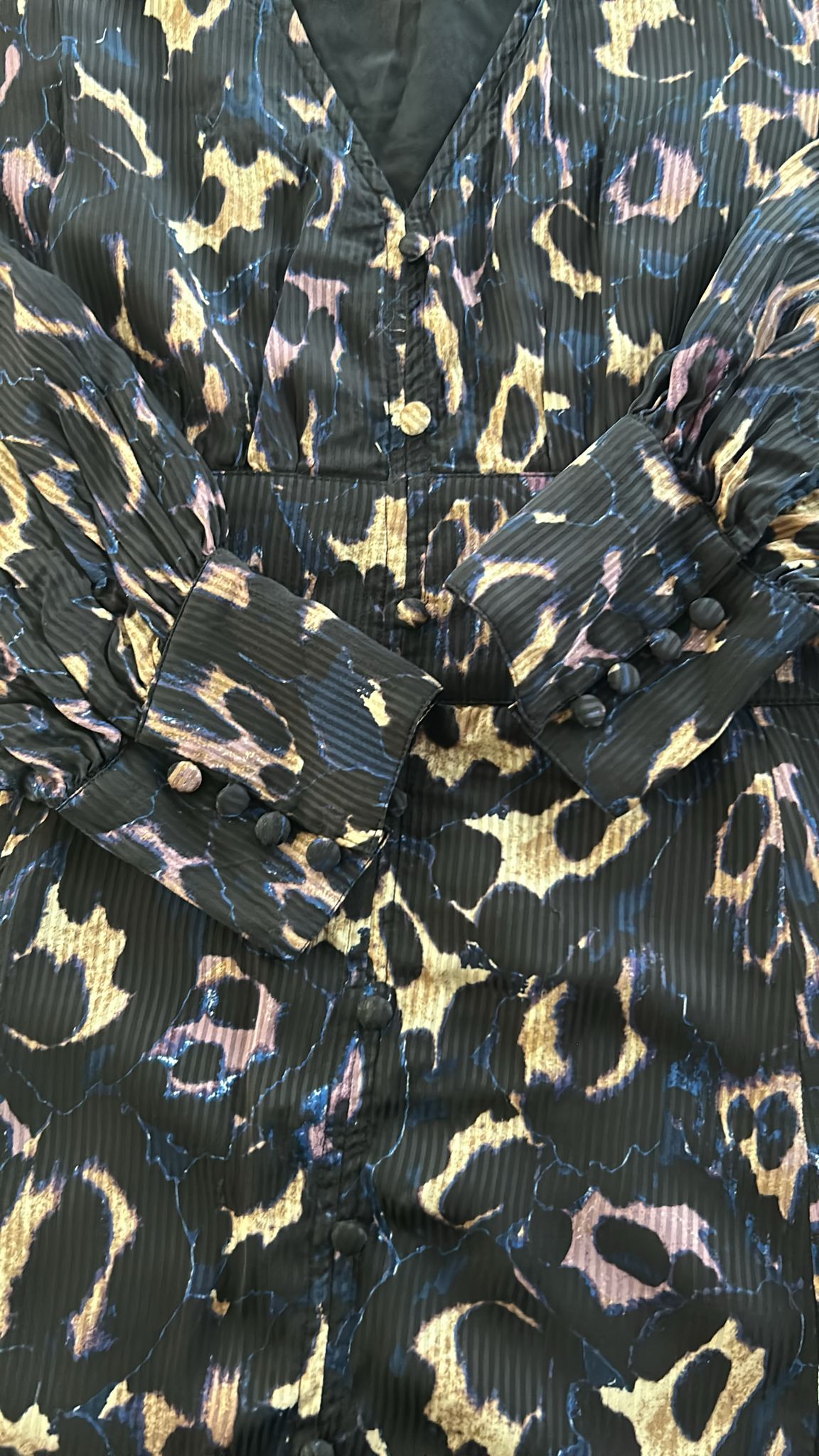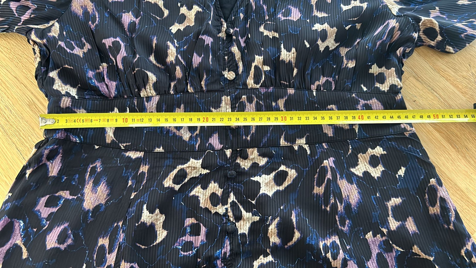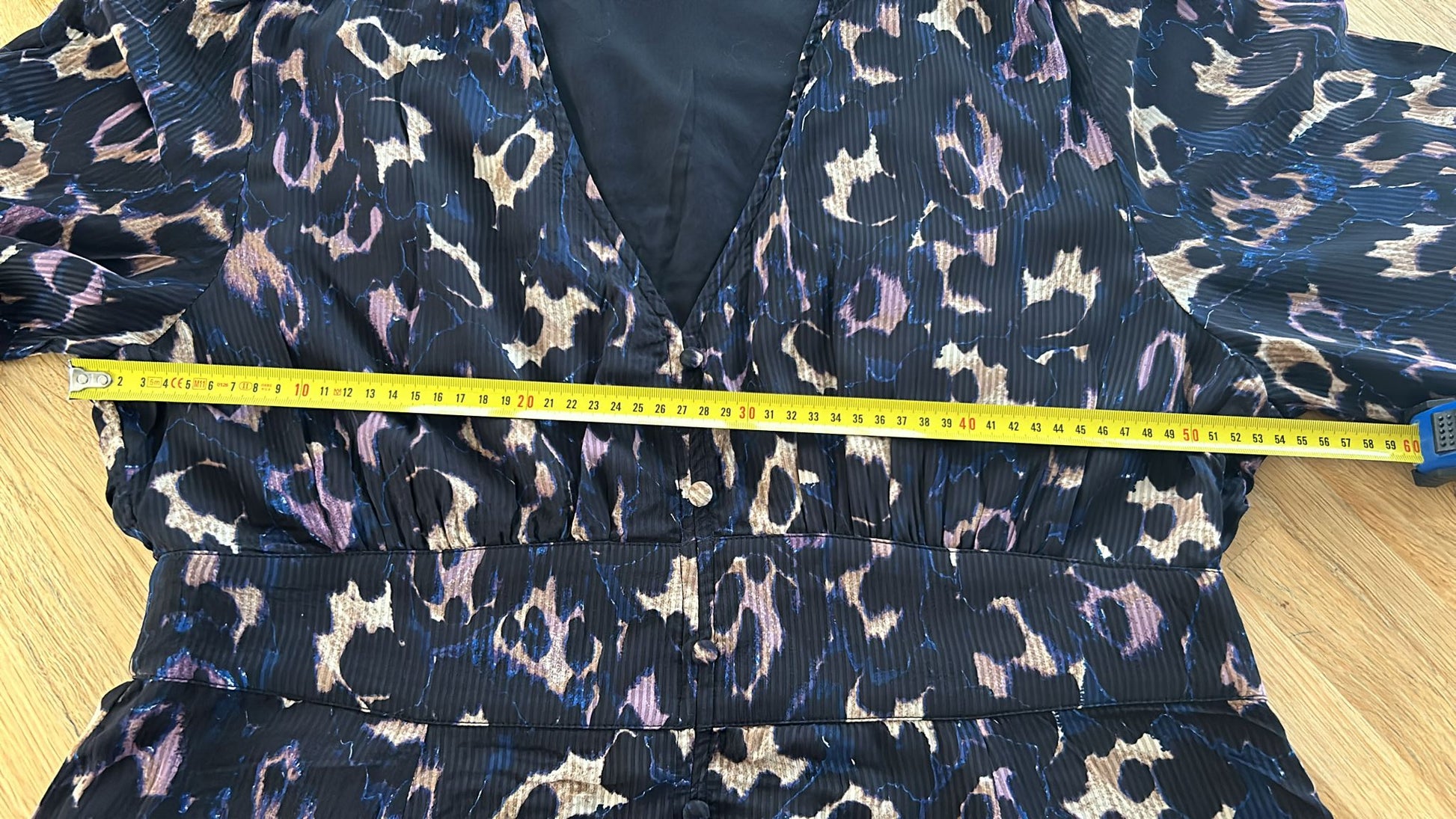 - V-hals, stoffen knoopjes tot onder, tailleband, rits in de zij, lange mouwen