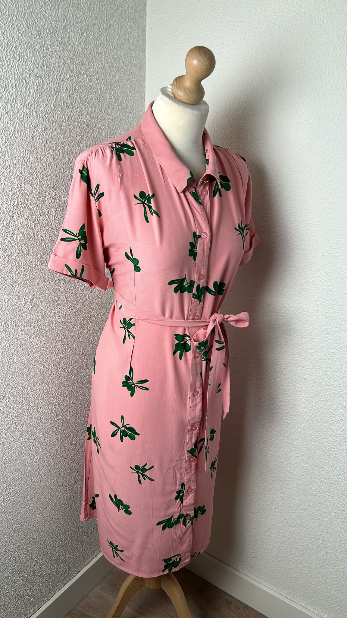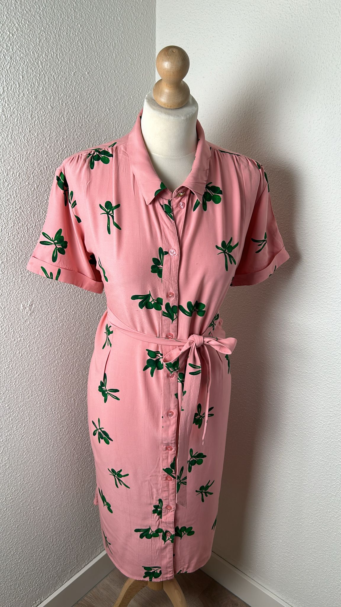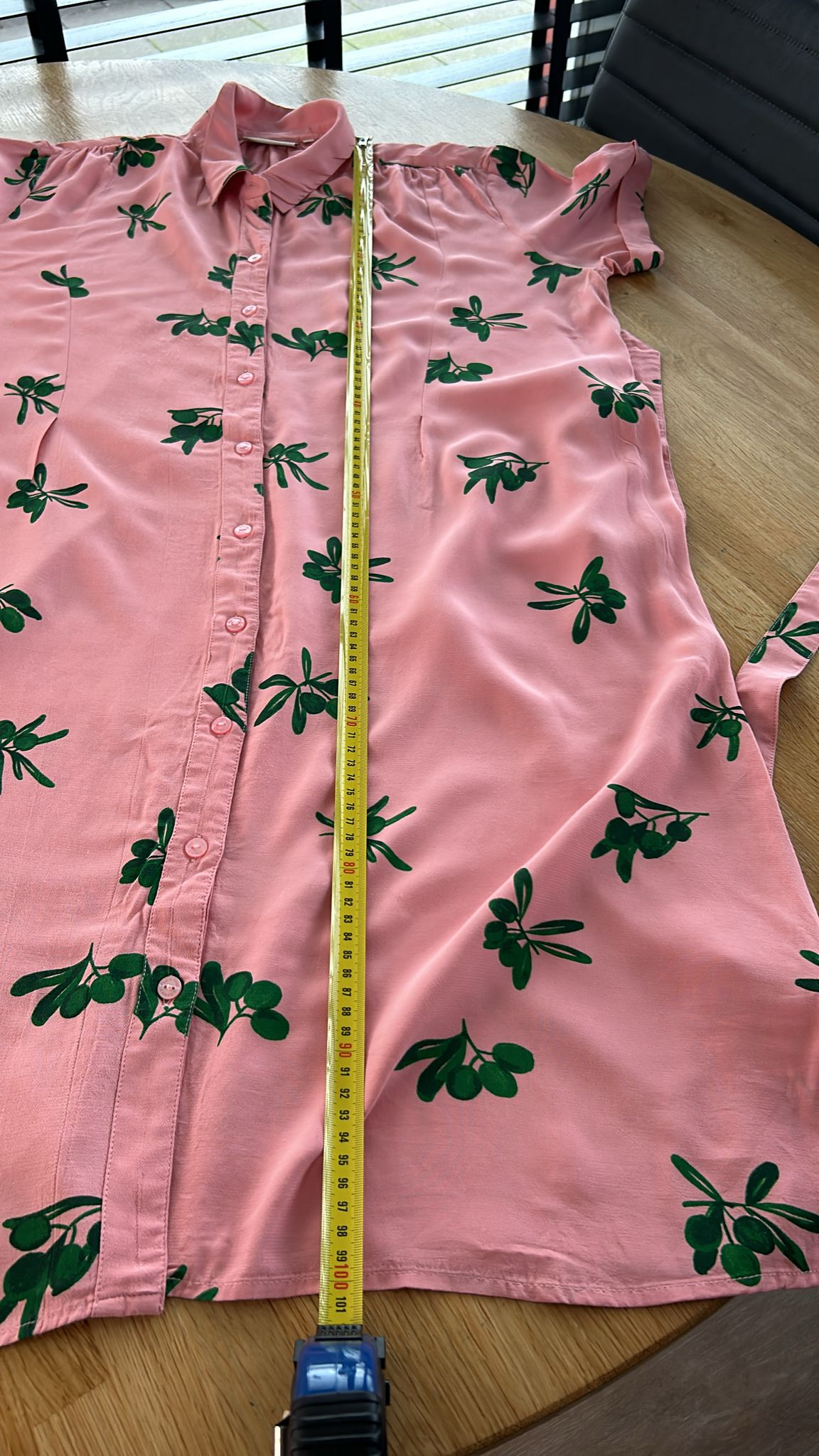 - Knoopjes tot onder, korte mouwen, steekzakken, riempje, gouden details