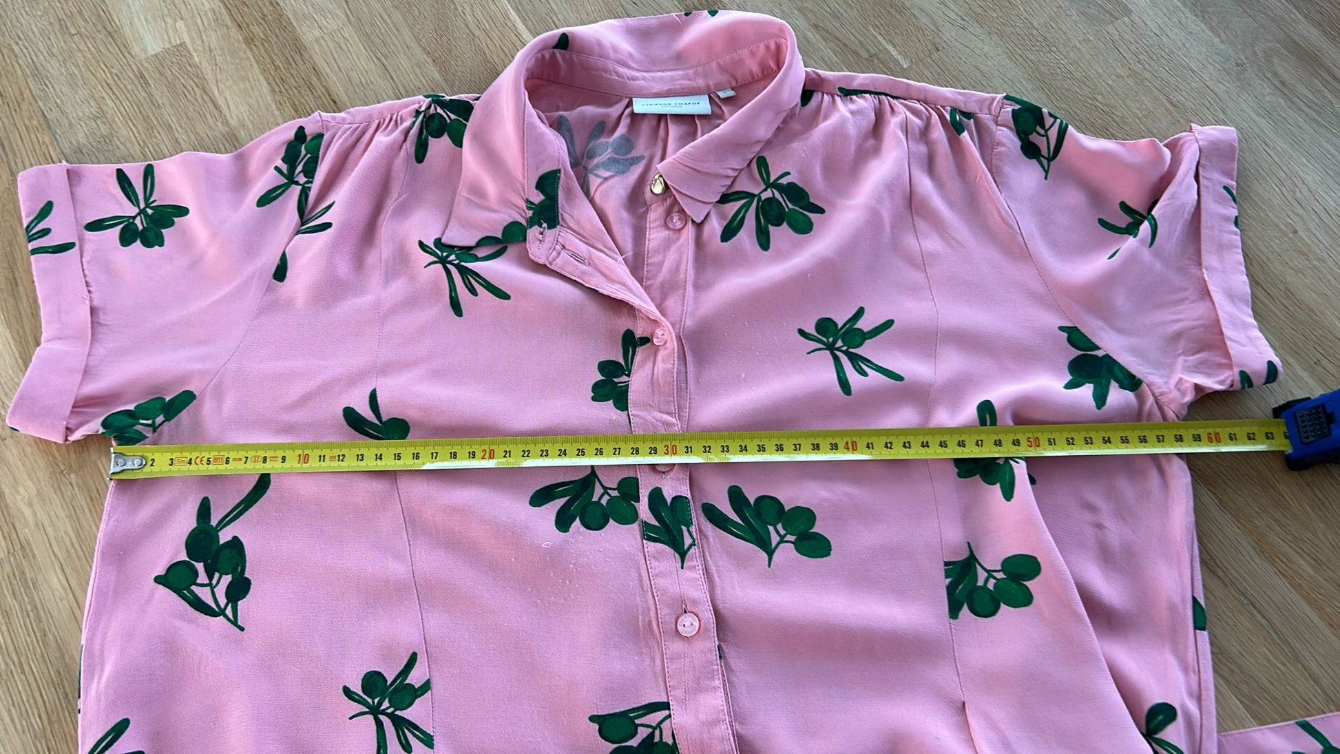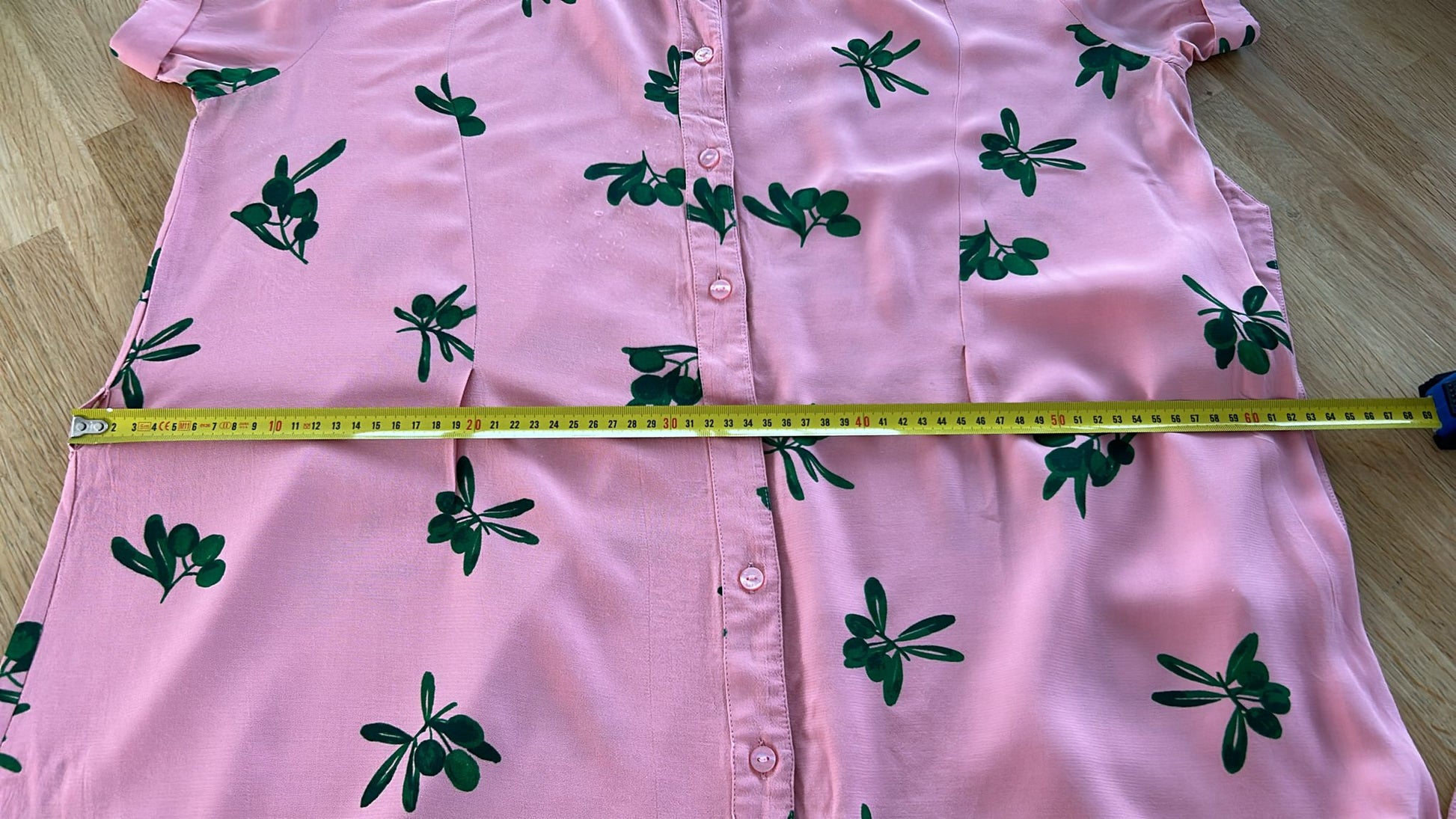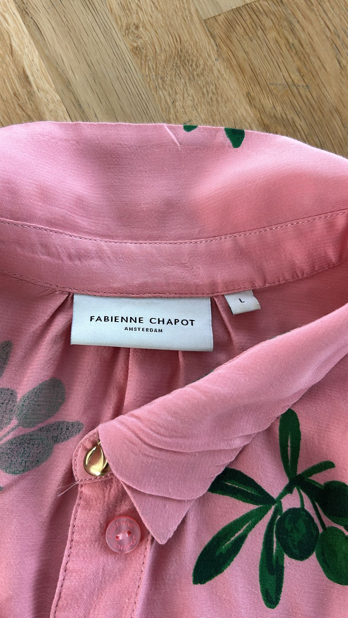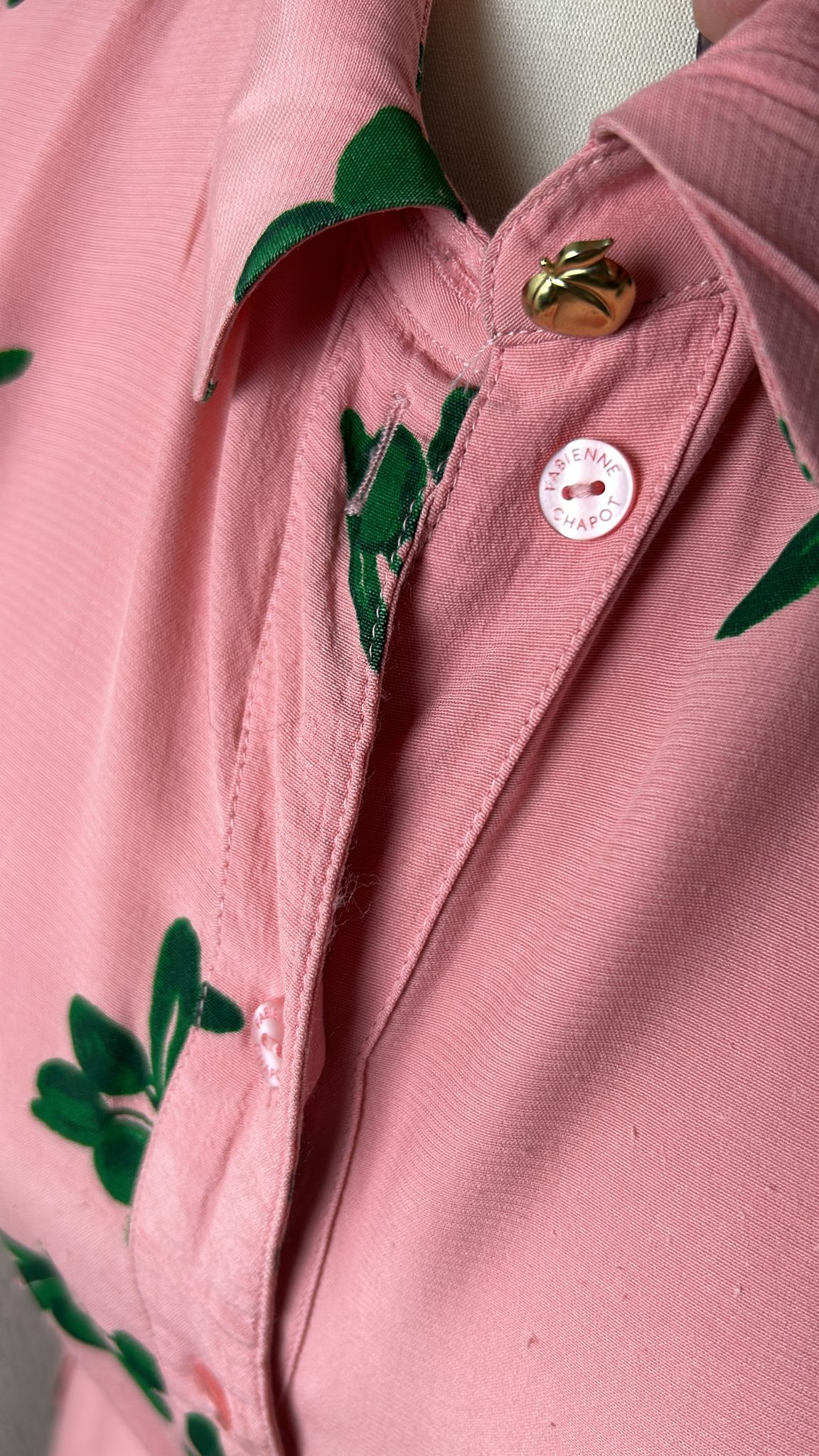 - Knoopjes tot onder, korte mouwen, steekzakken, riempje, gouden details