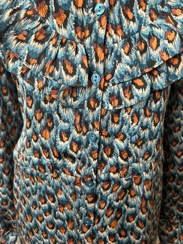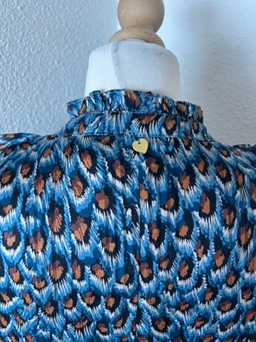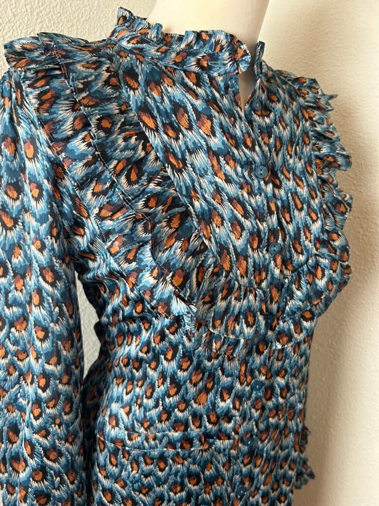 - Blousejurk met knoopjes tot onder, lange mouwen, kort kraagje, mooiw ruffle/rushes en tailleband