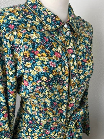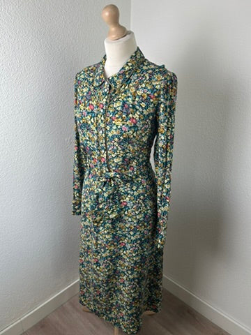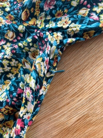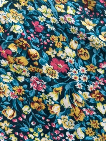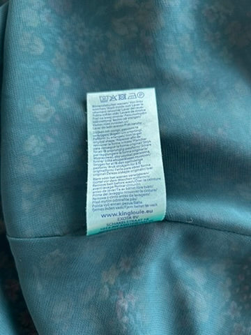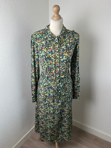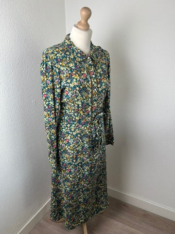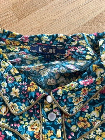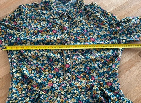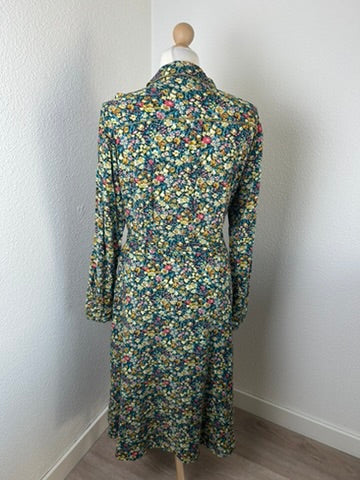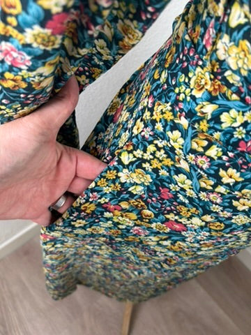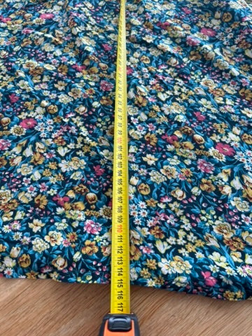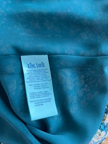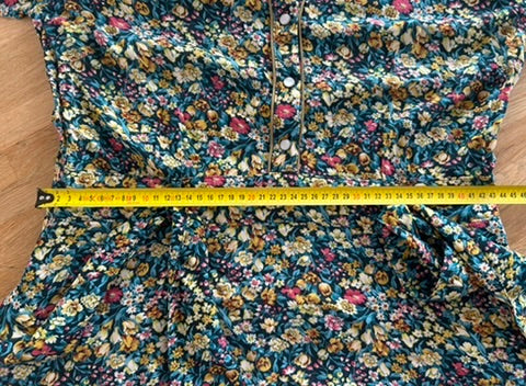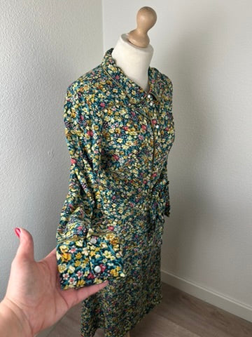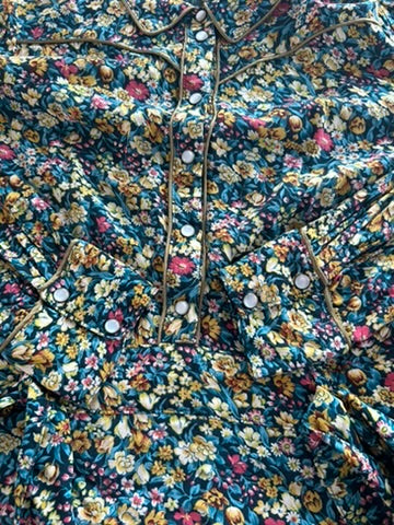 - Donkerblauw met gekleurde bloemen print in turquoise blauw wit roze rood en geel, mooie turquoise lijnen en parelmoer drukknopen