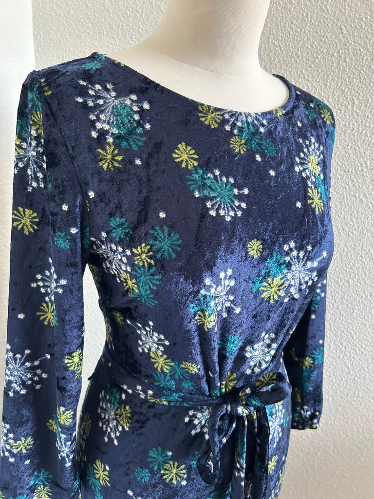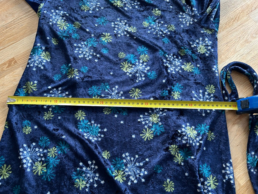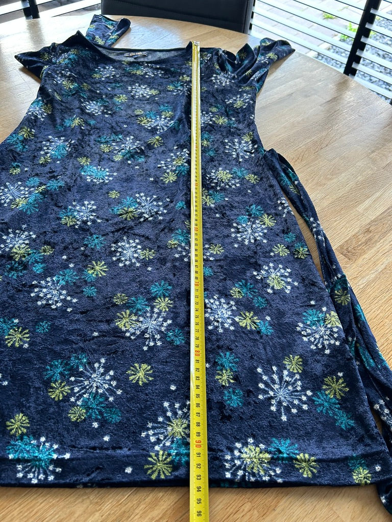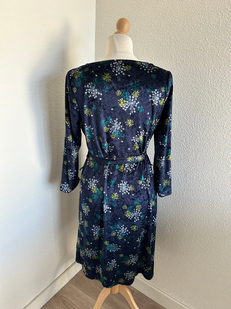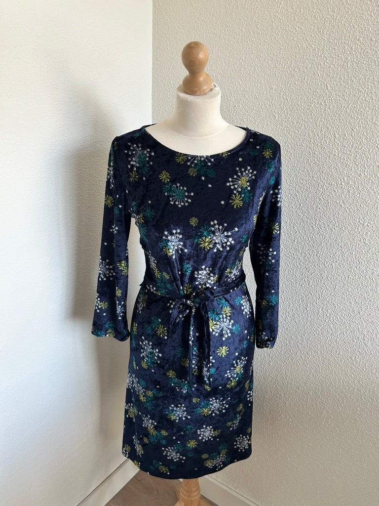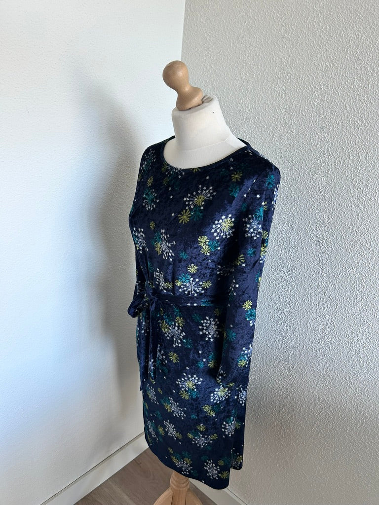 - Leuke jurk in donkerblauw/marine met bloemen/vuurwerk retro print in wit geel en blauw