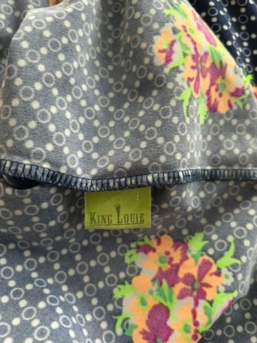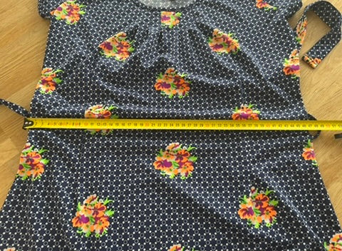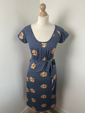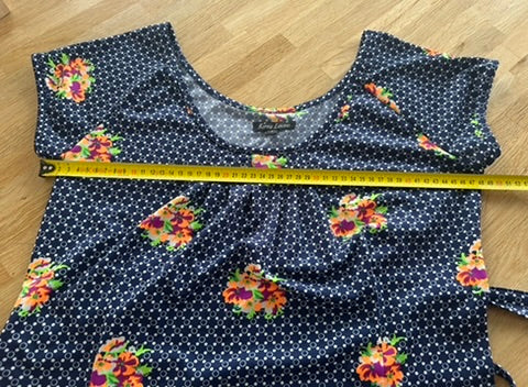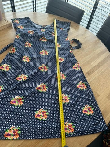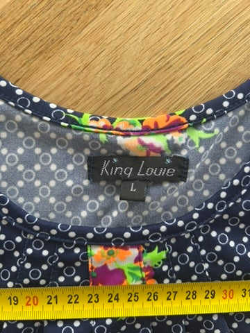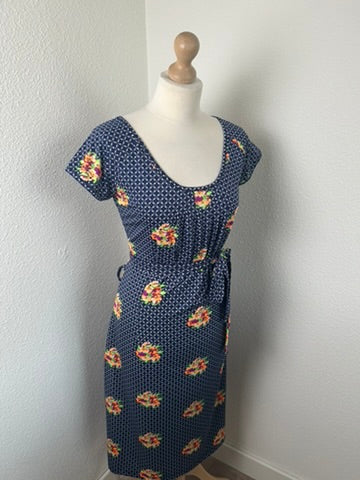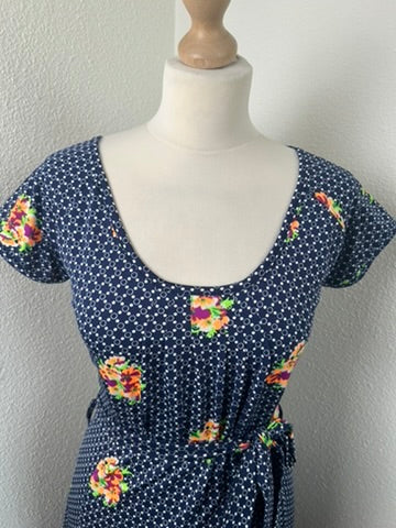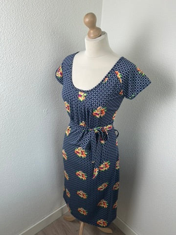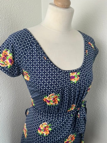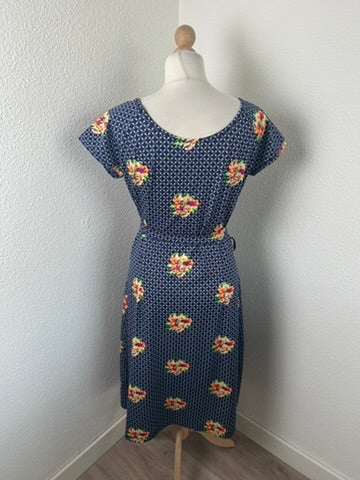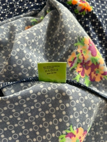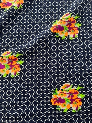 - Donker / marine blauw met witte print en bijna neon gekleurde bloemen in oranje wit geel en groen