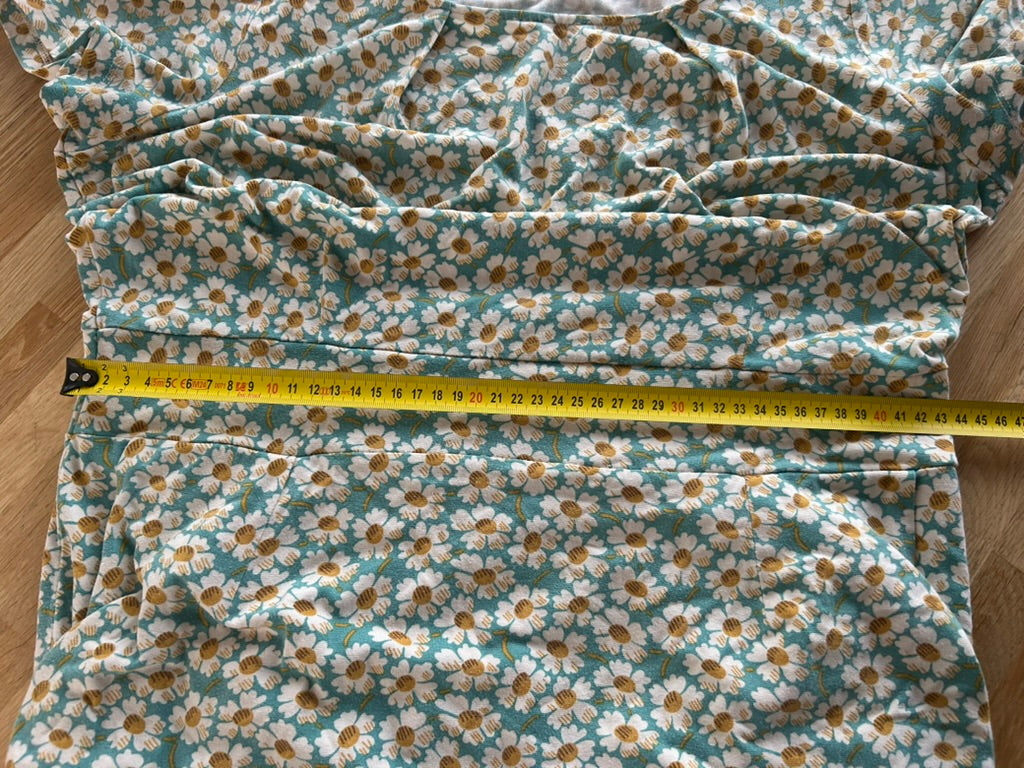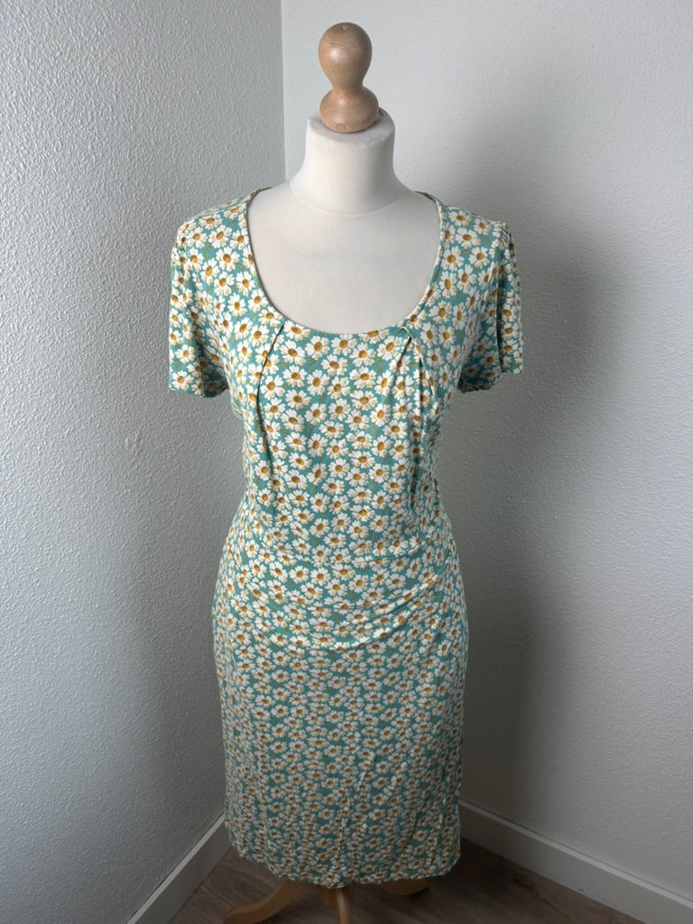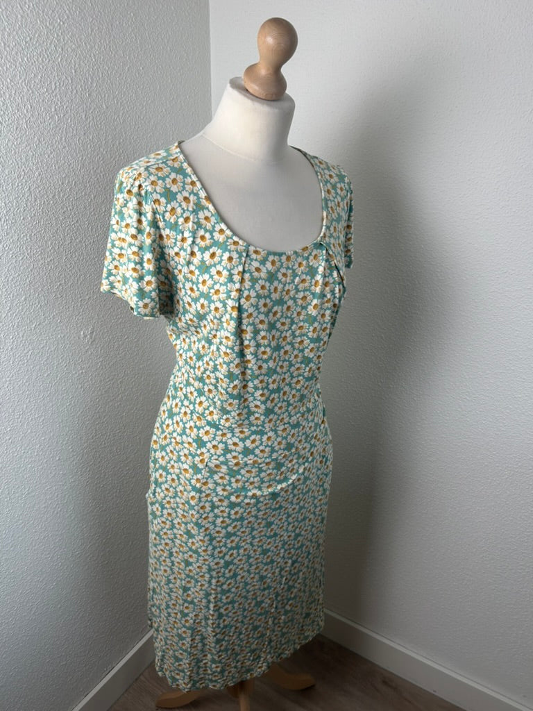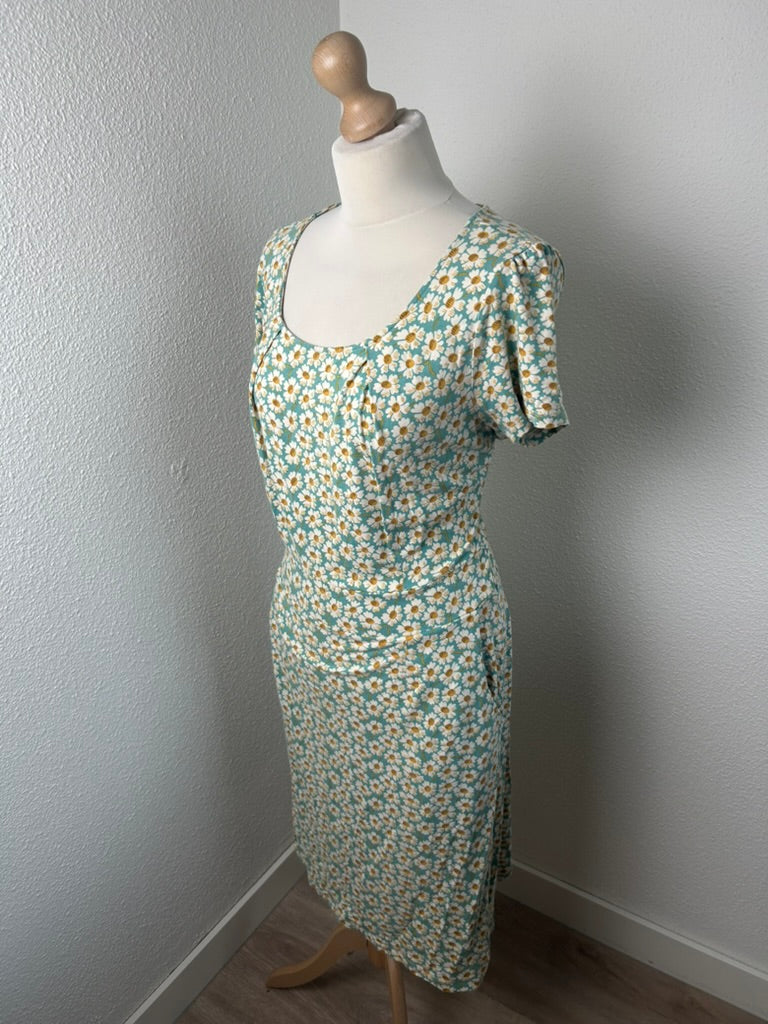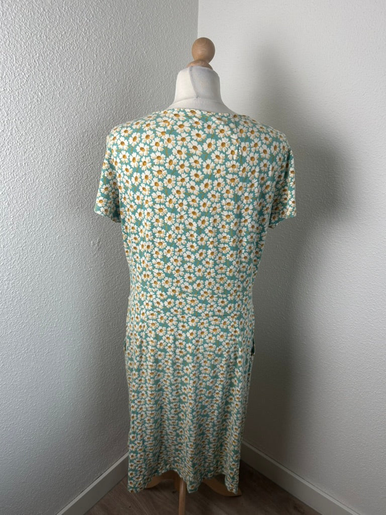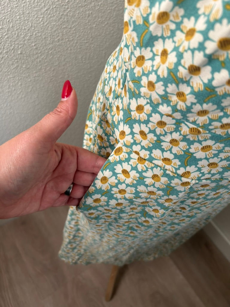 - Ronde halslijn, korte mouwen, brede tailleband en steekzakken