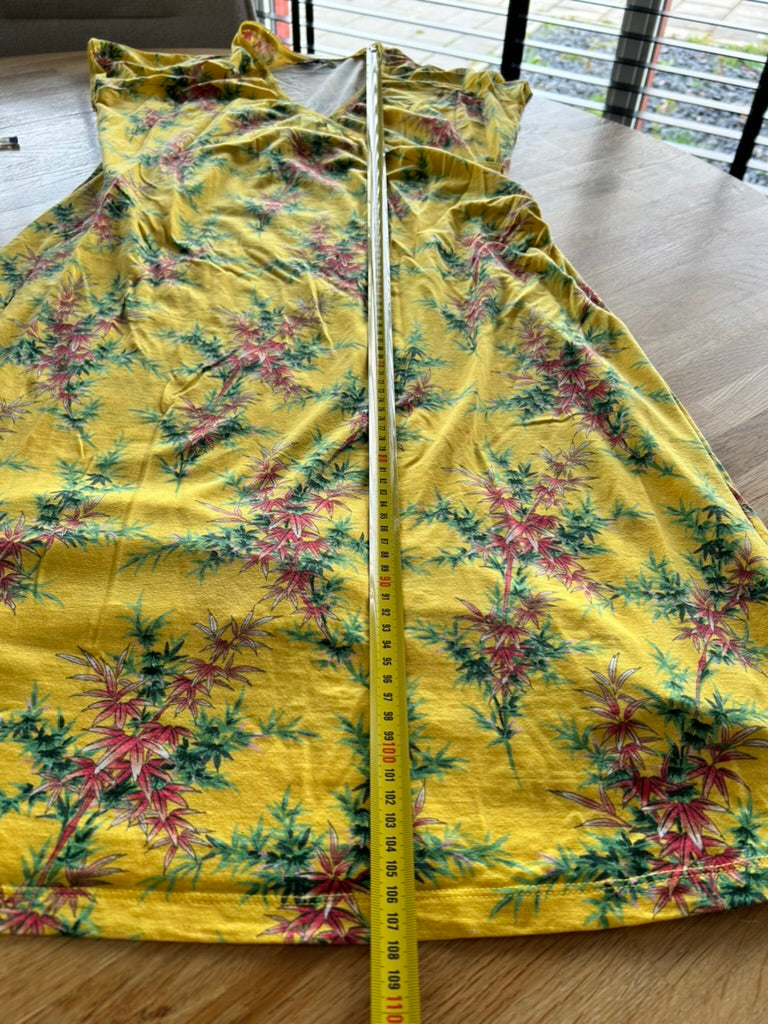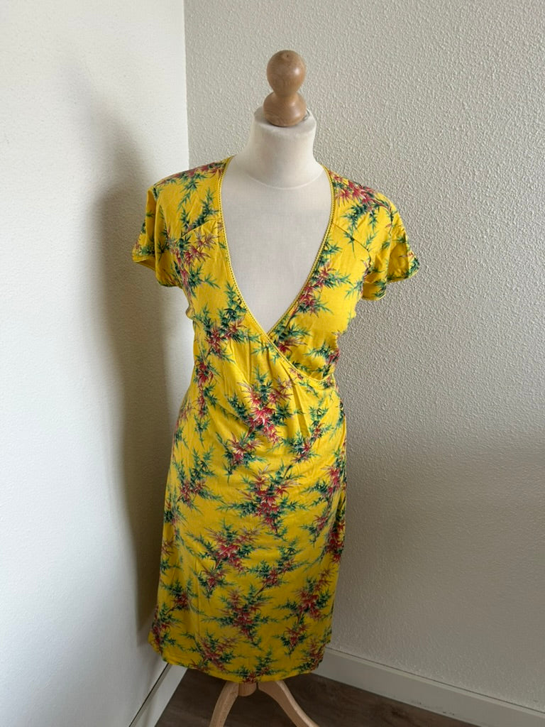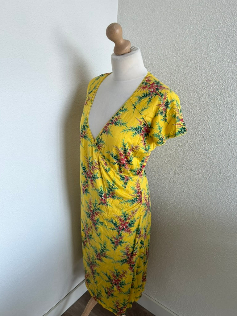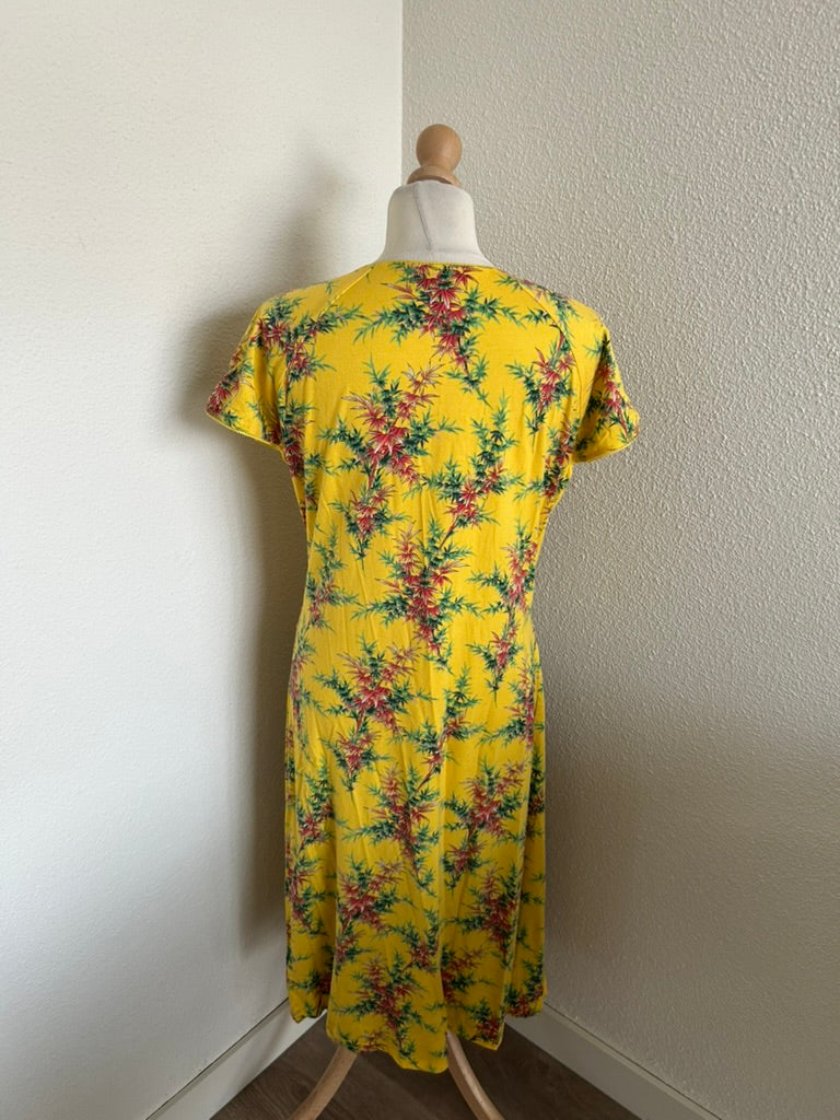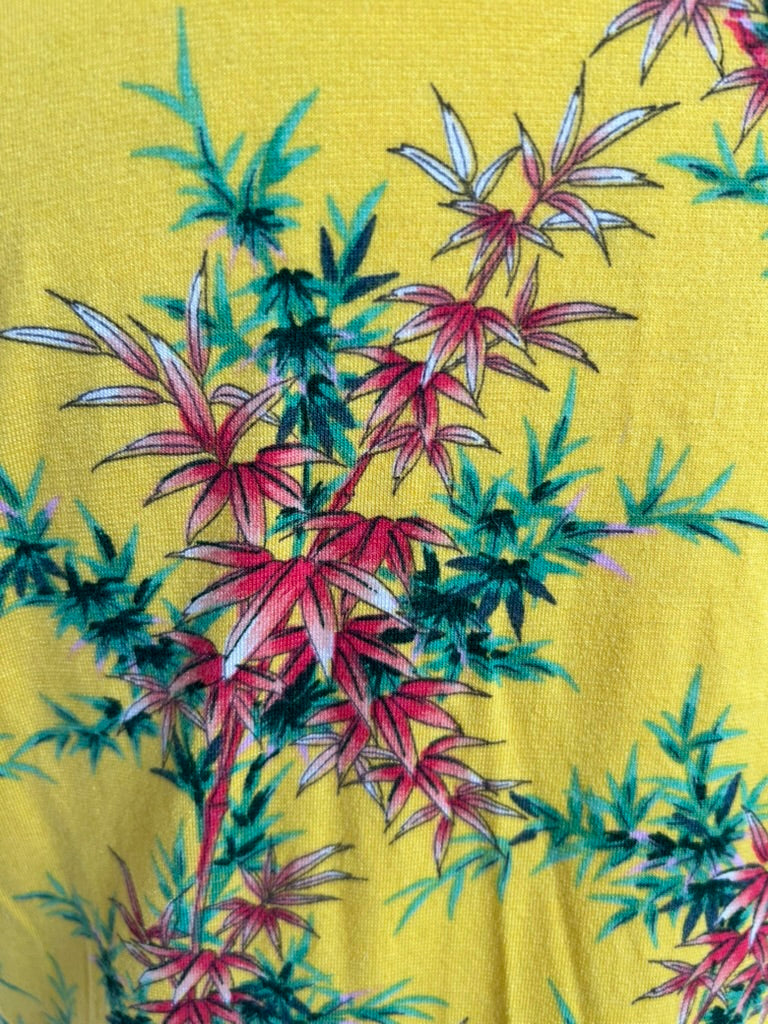 - Leuke jurk in geel met Japanse esdoorn/bladeren print in roze rood wit en groen