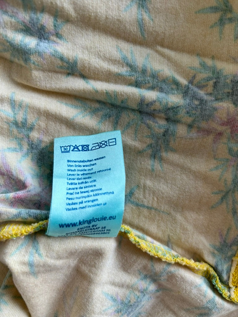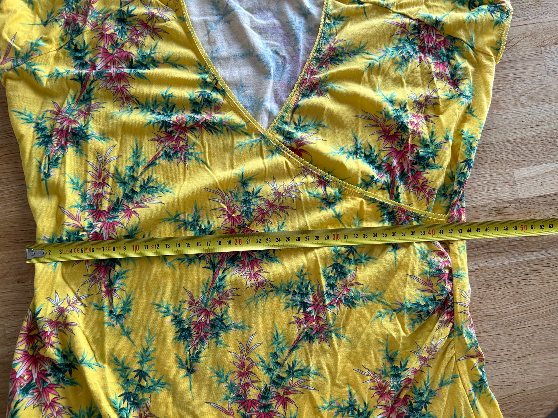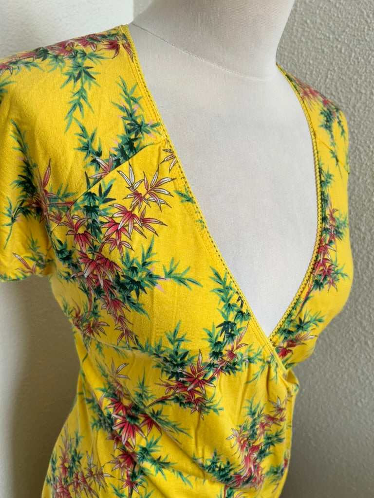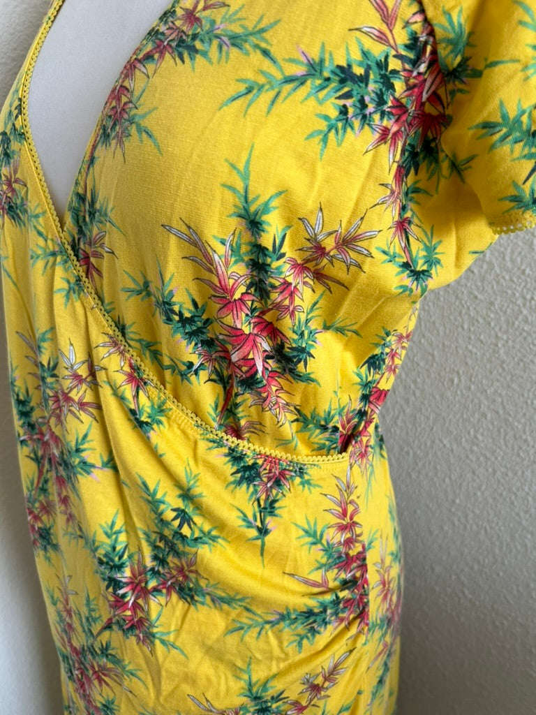 - Leuke jurk in geel met Japanse esdoorn/bladeren print in roze rood wit en groen