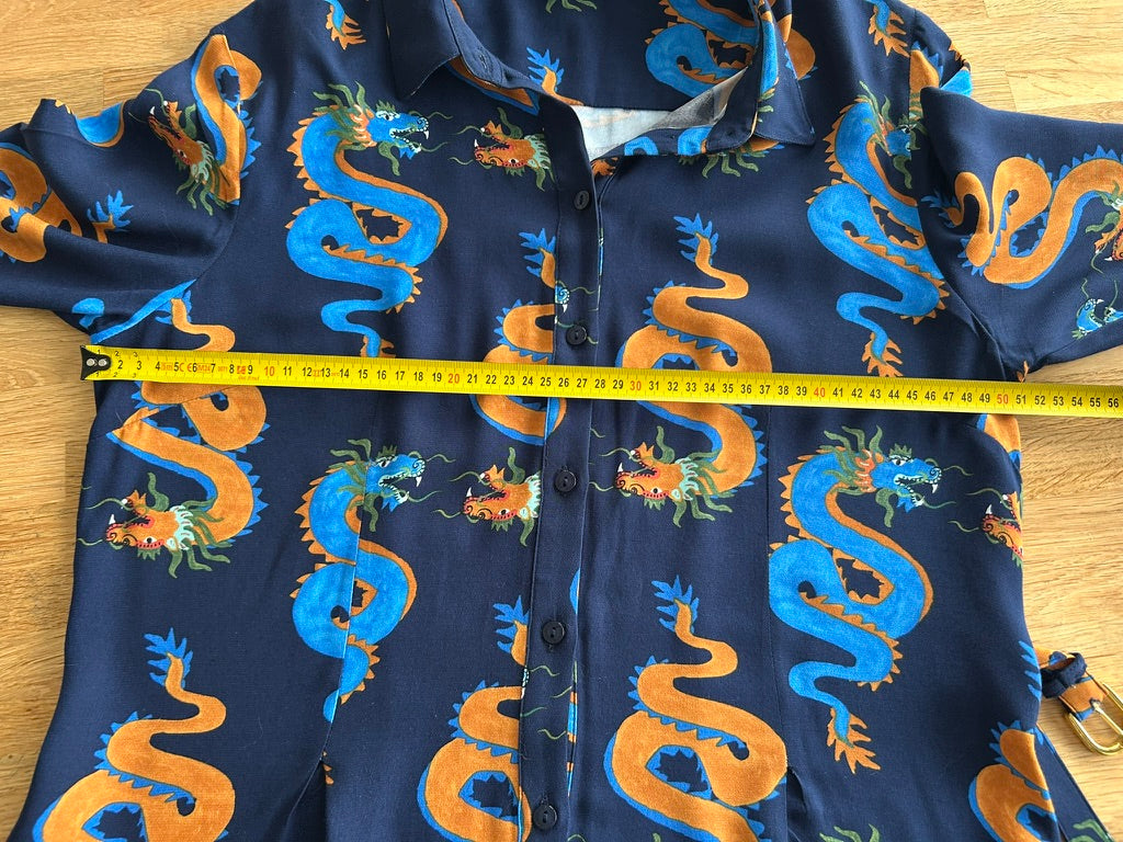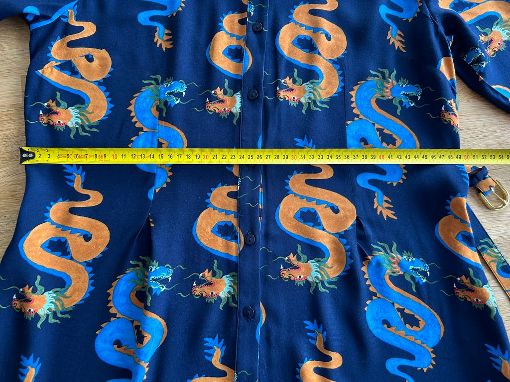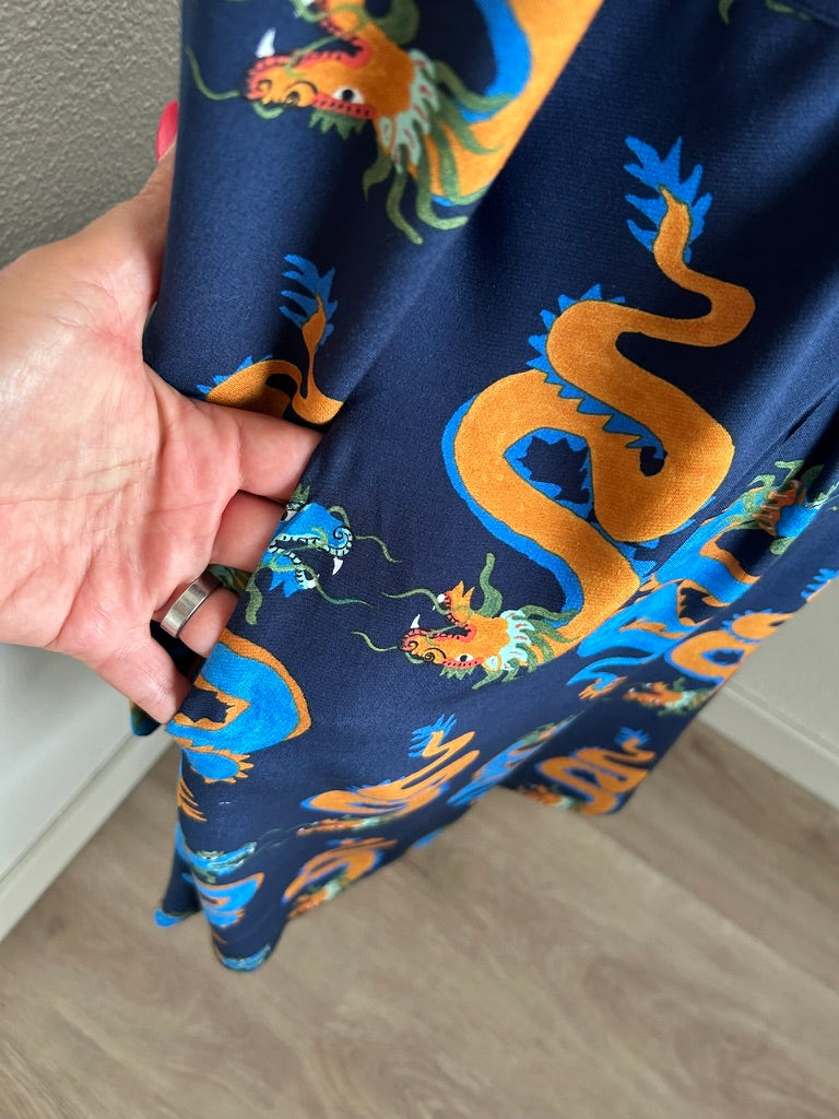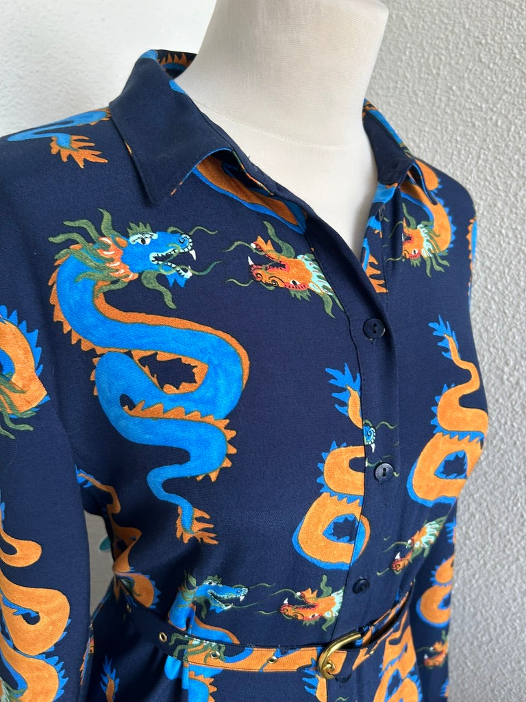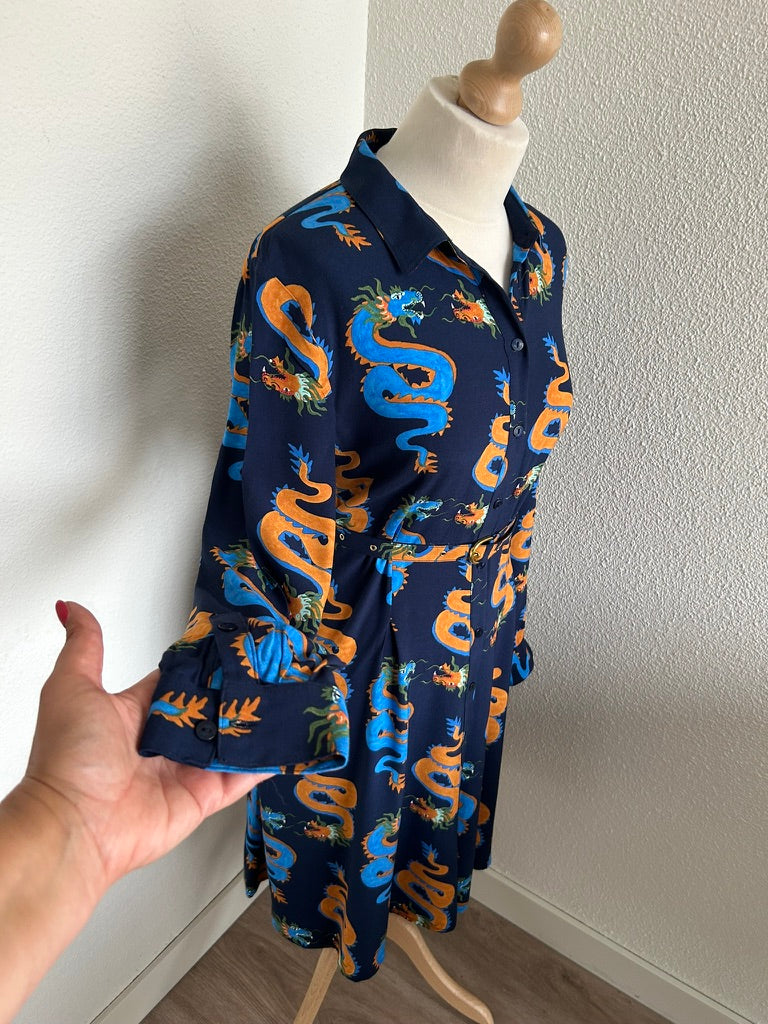 - Leuke retro jurk in donkerblauw, marine met oranje witte en blauwe draken print