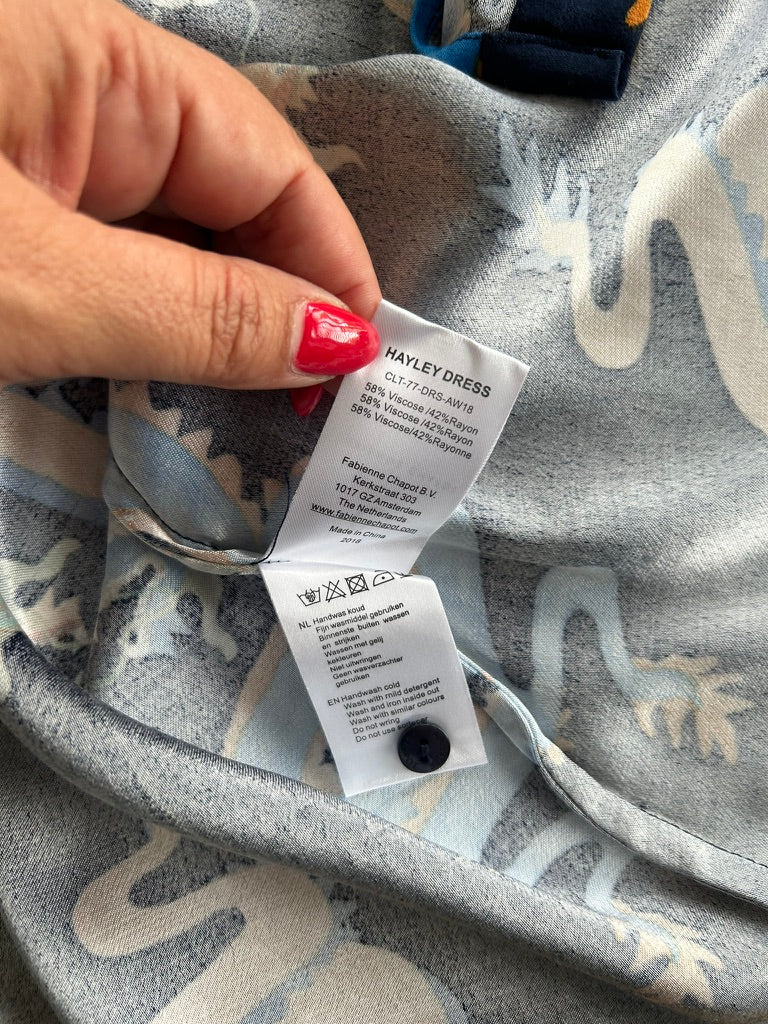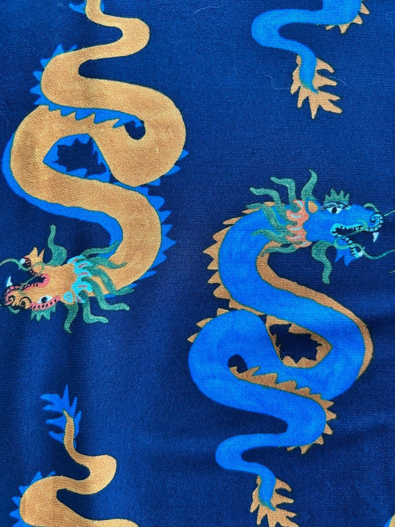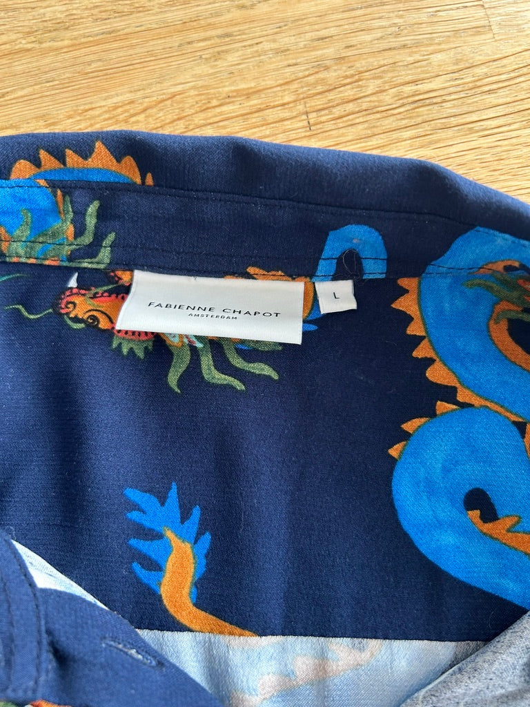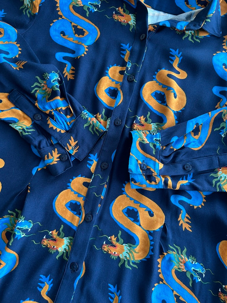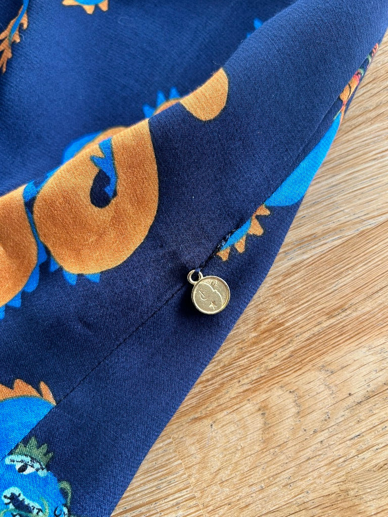 - Leuke retro jurk in donkerblauw, marine met oranje witte en blauwe draken print