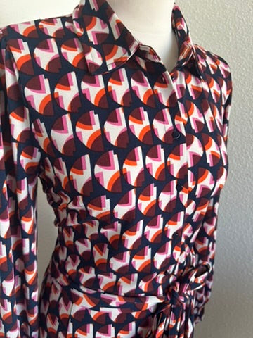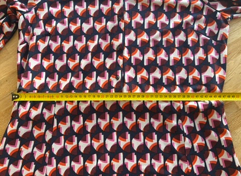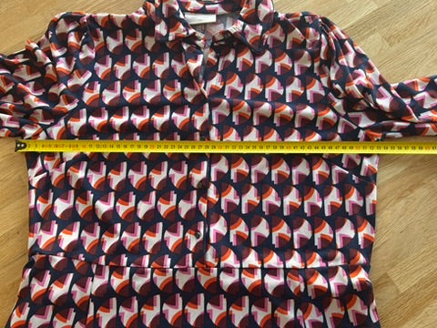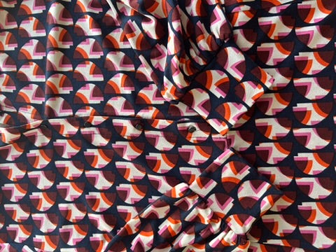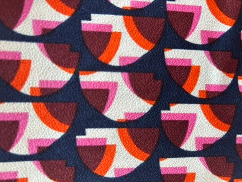 - Donkerblauw, marine met creme wit en roze, oranje, rode retro print