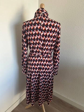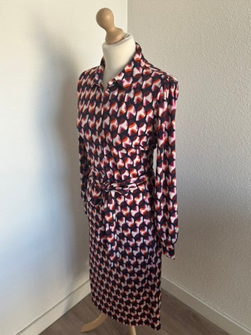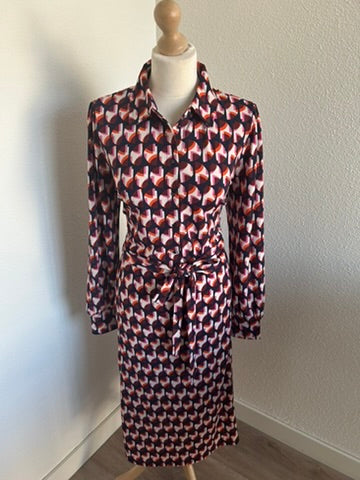 - Mooie halslijn met kraagje, retro knoopjes op de borst, lange mouwen, knooplint rond het middel, midi lengte
