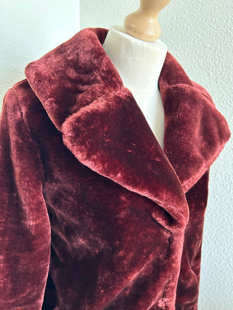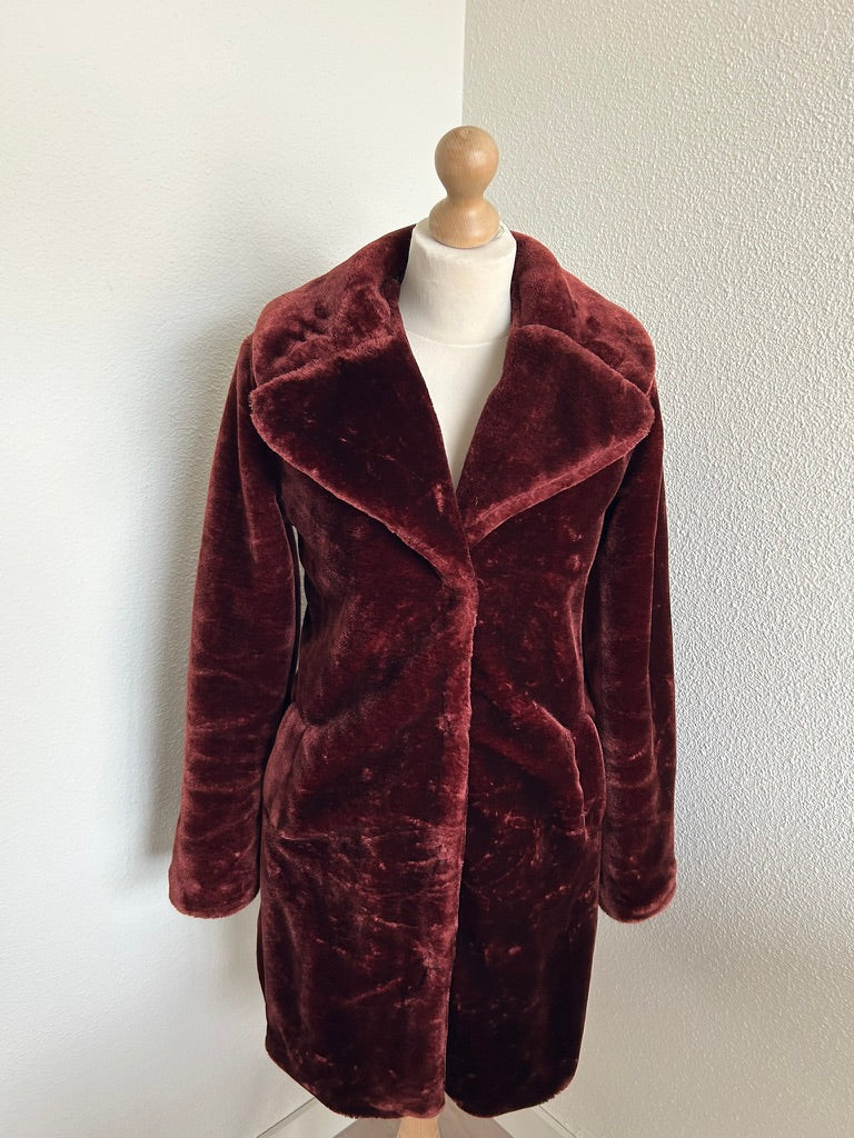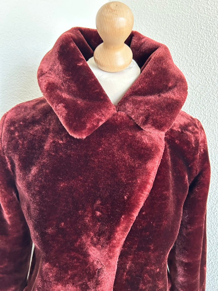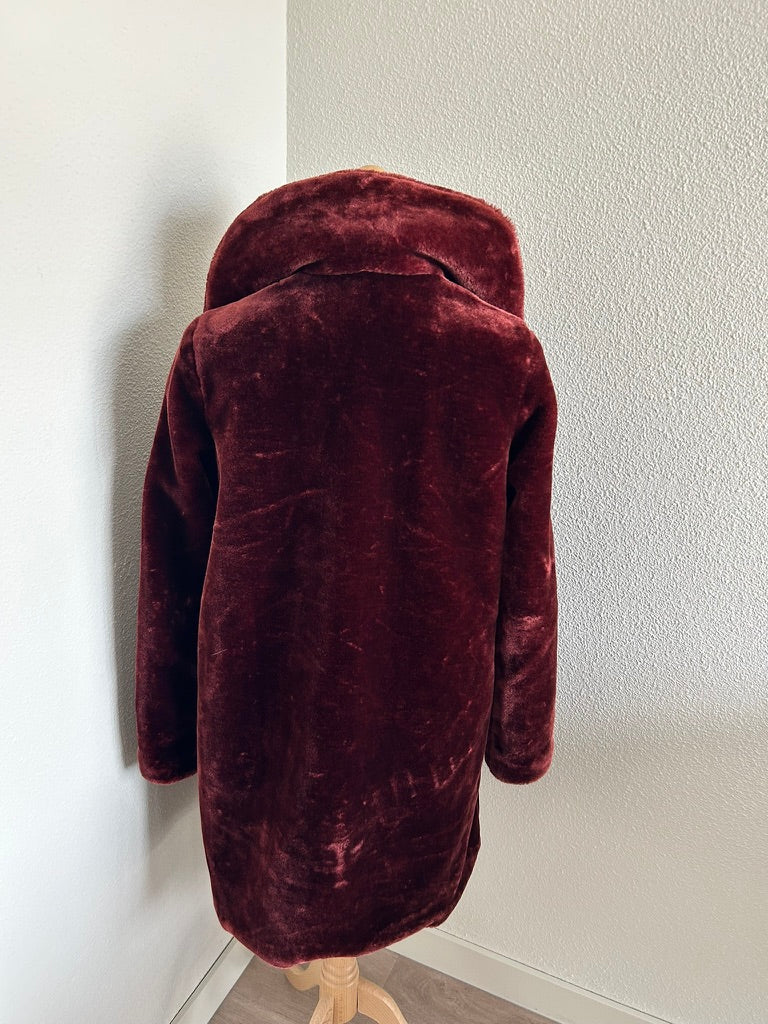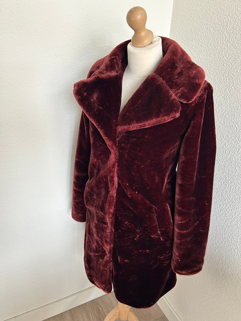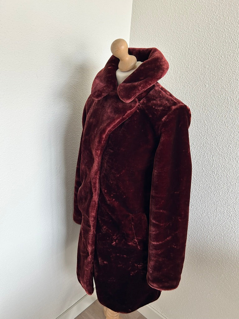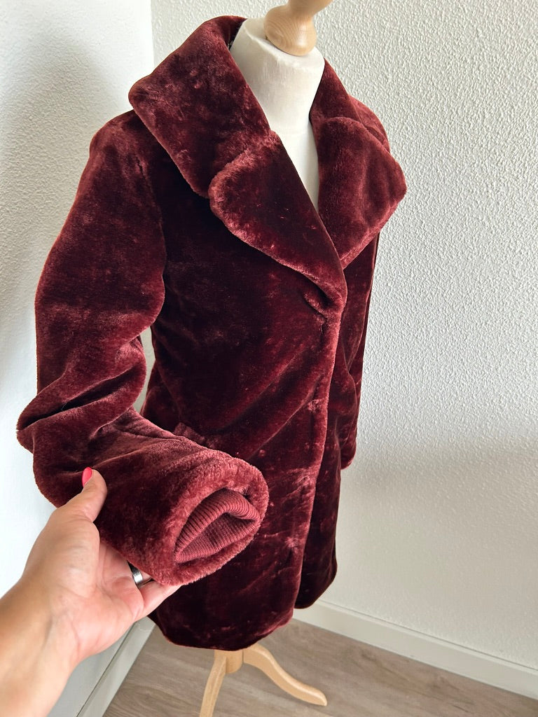 - Leuk retro fluffy jas in wijnrood/donkerrood met gladde intacte binnenvoering
