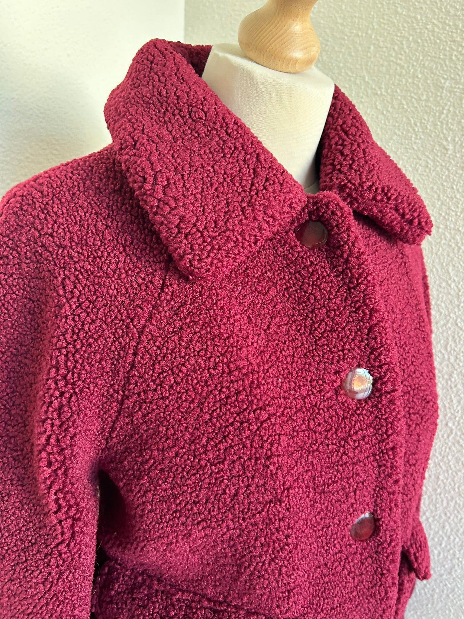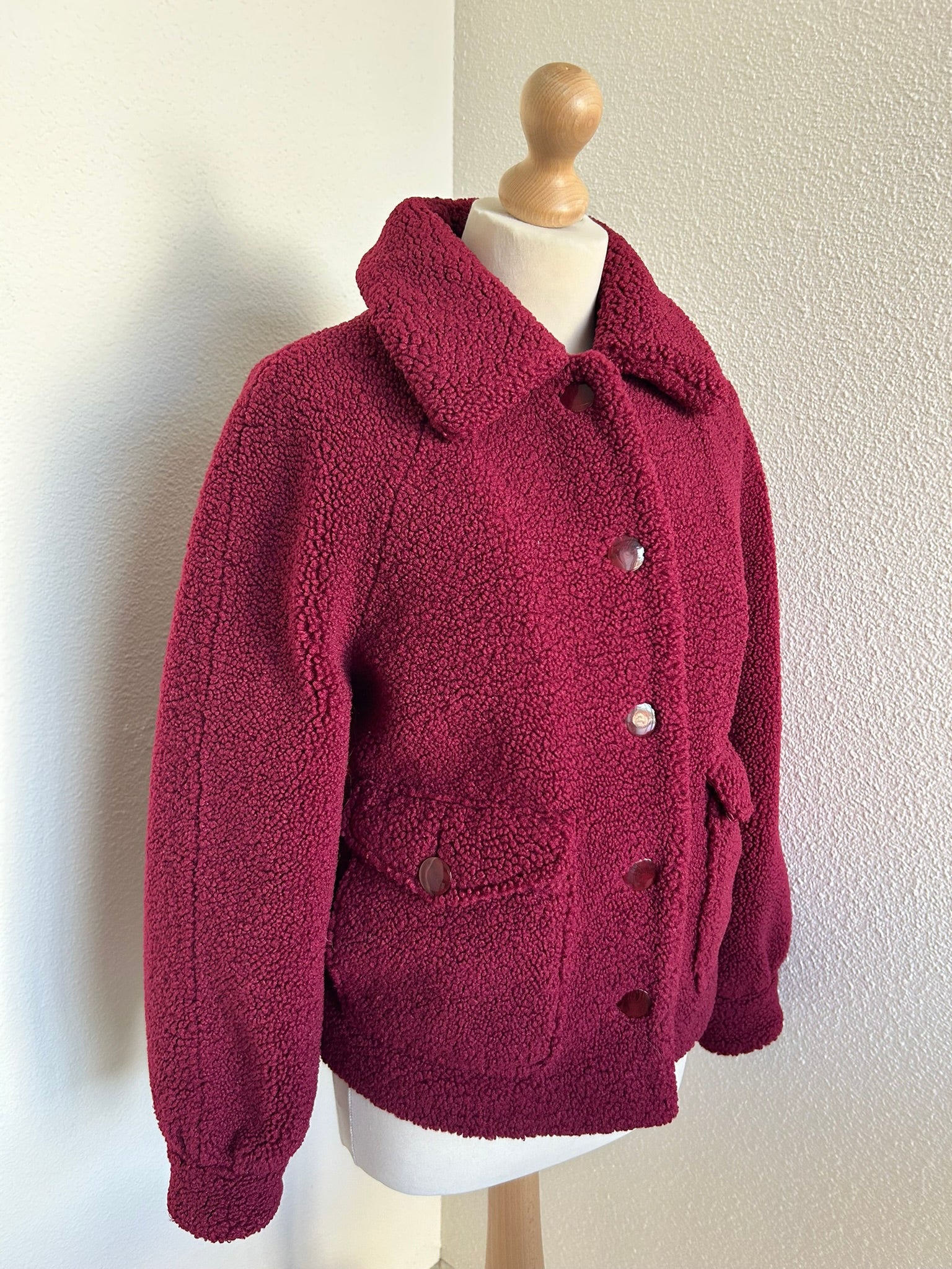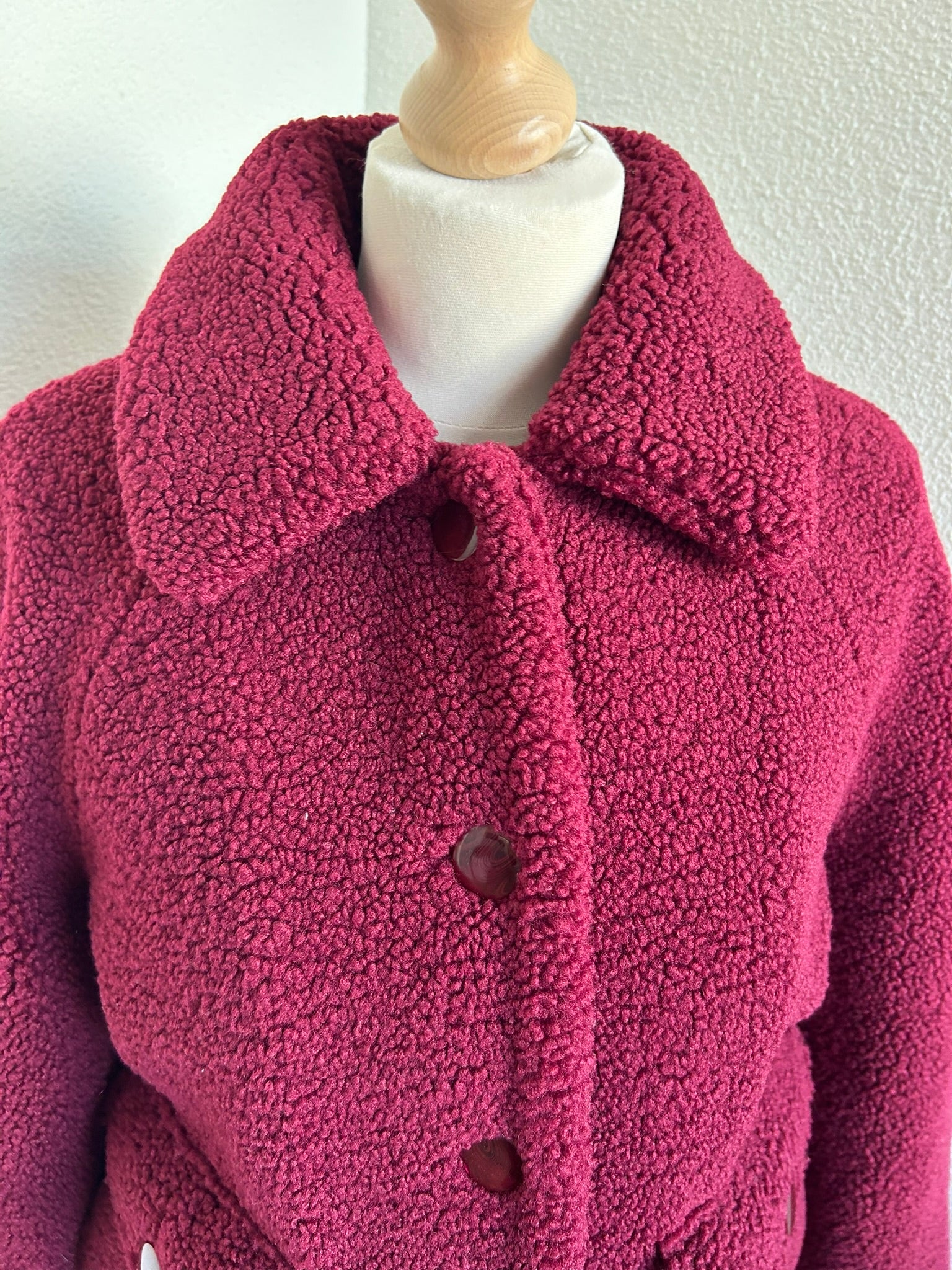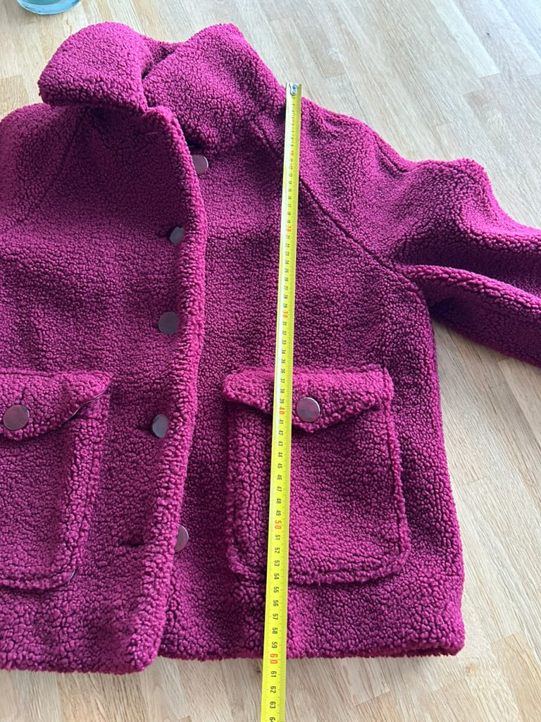 - Leuke Teddy fluffy jas in wijnrood/donkerrood met gave retro knopen en retro gladde intacte voering
