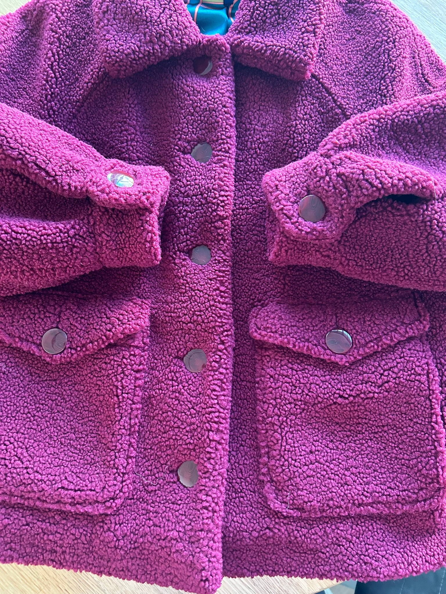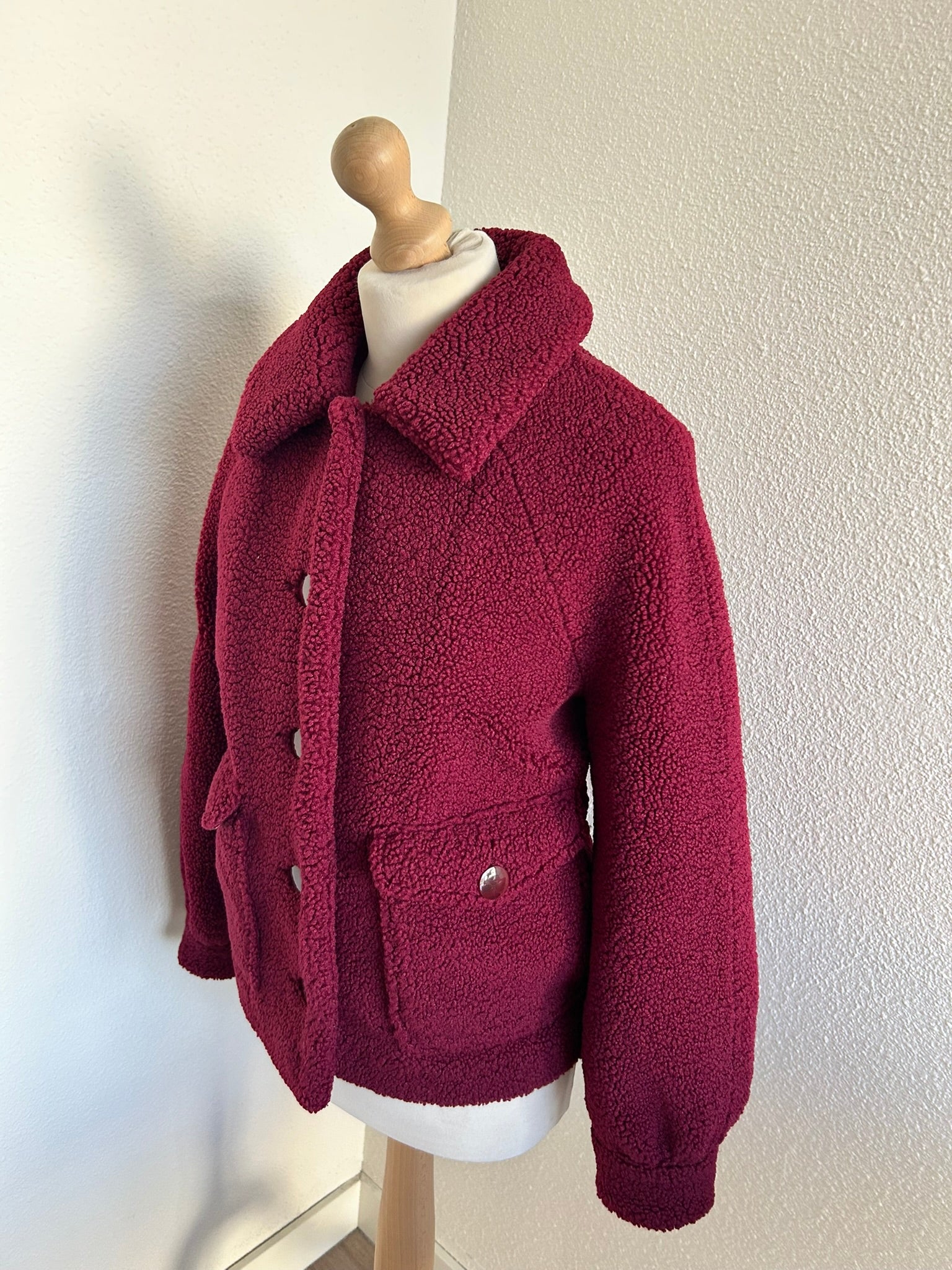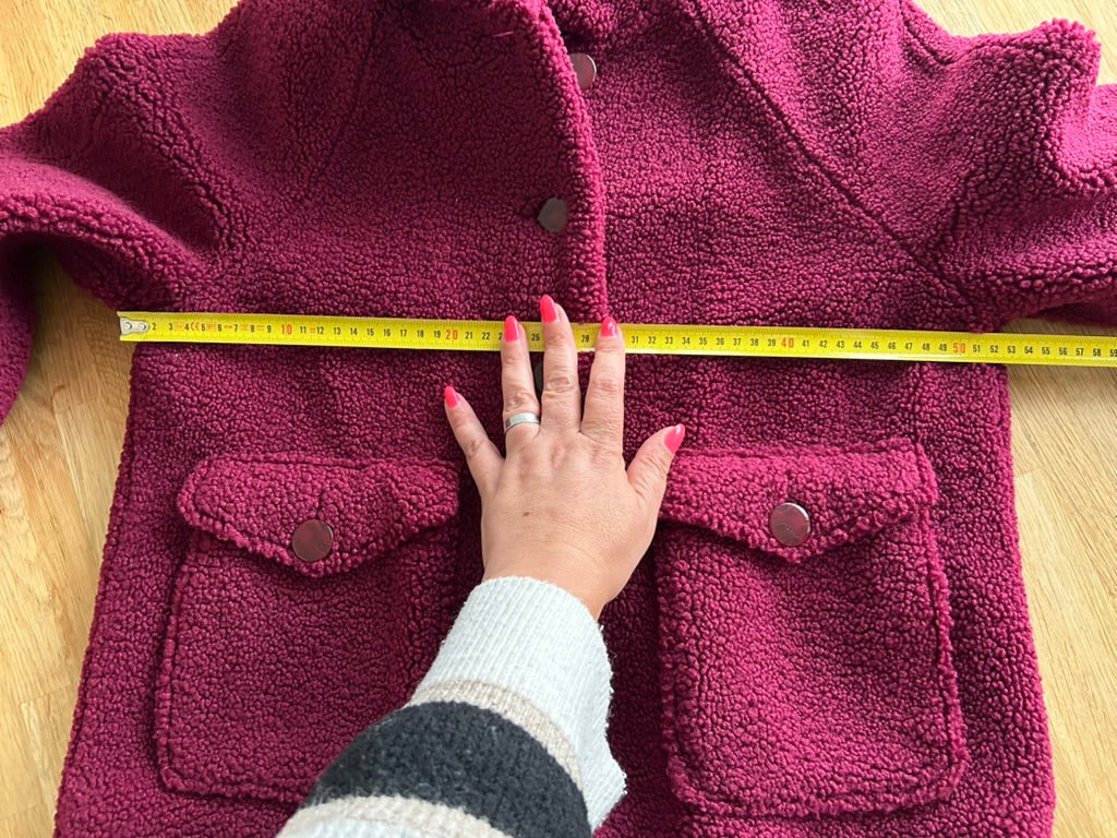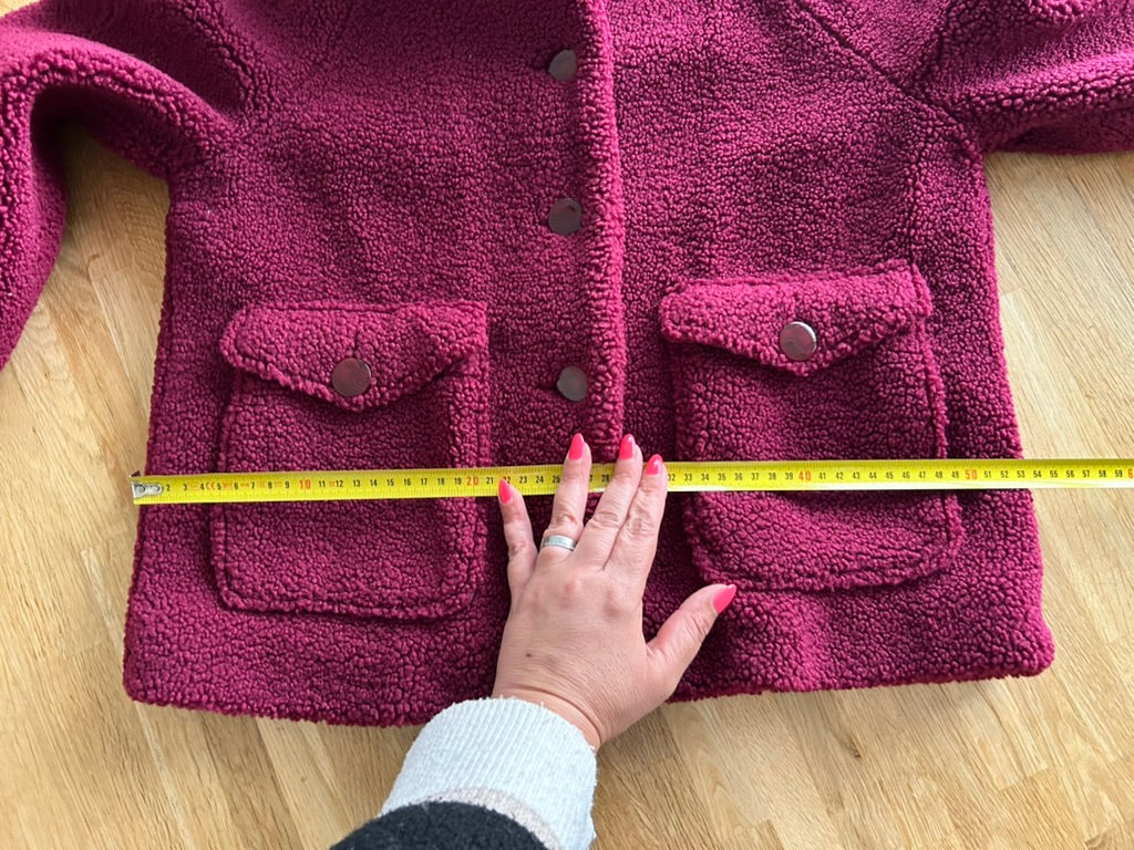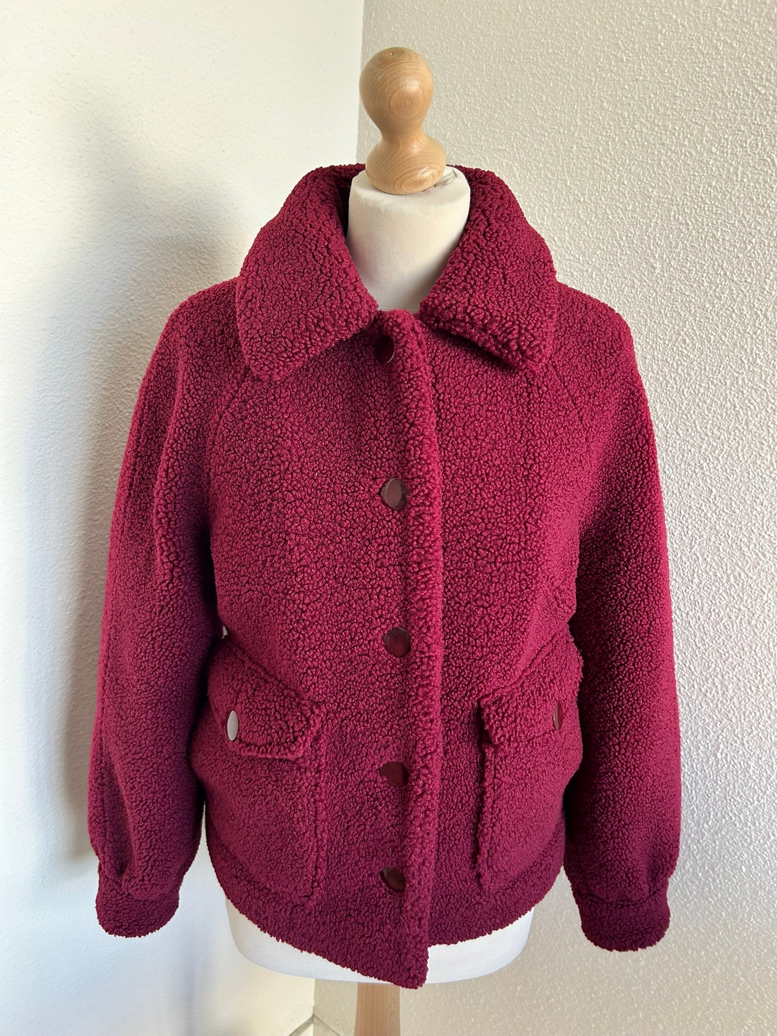 - Leuke Teddy fluffy jas in wijnrood/donkerrood met gave retro knopen en retro gladde intacte voering