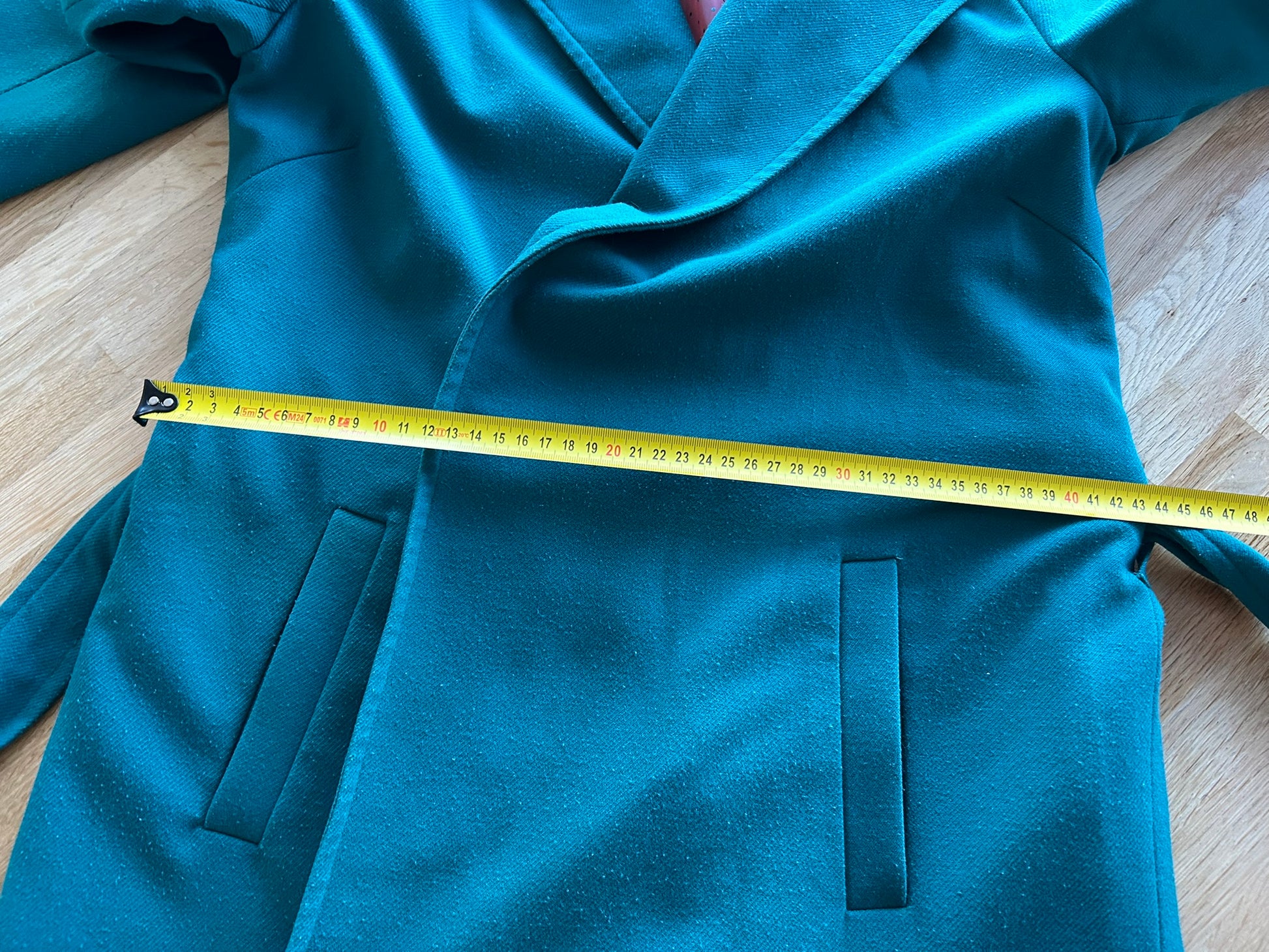 - Mooie halslijn met kraagje, knooplint rond het middel, steekzakken, middellang model
