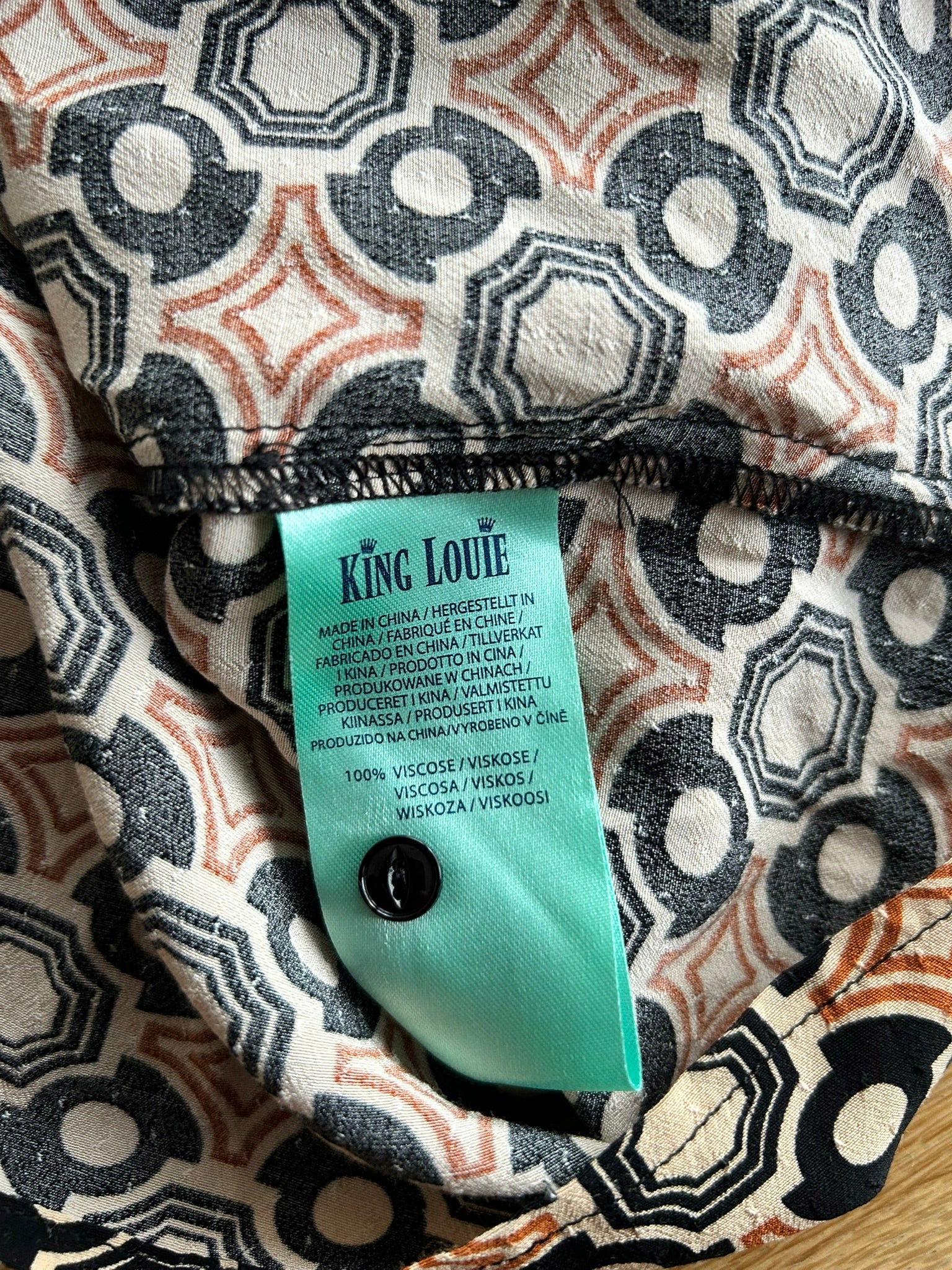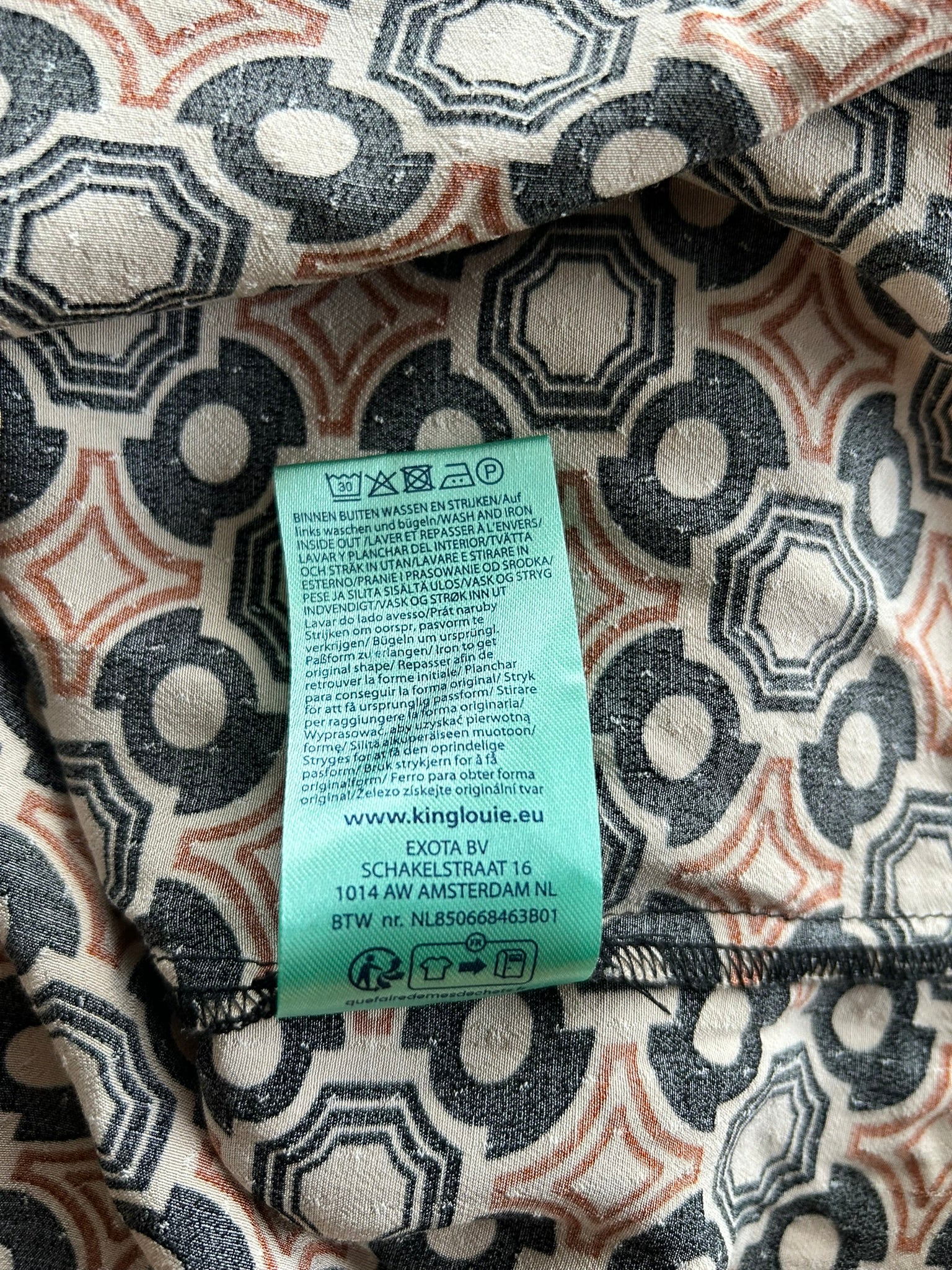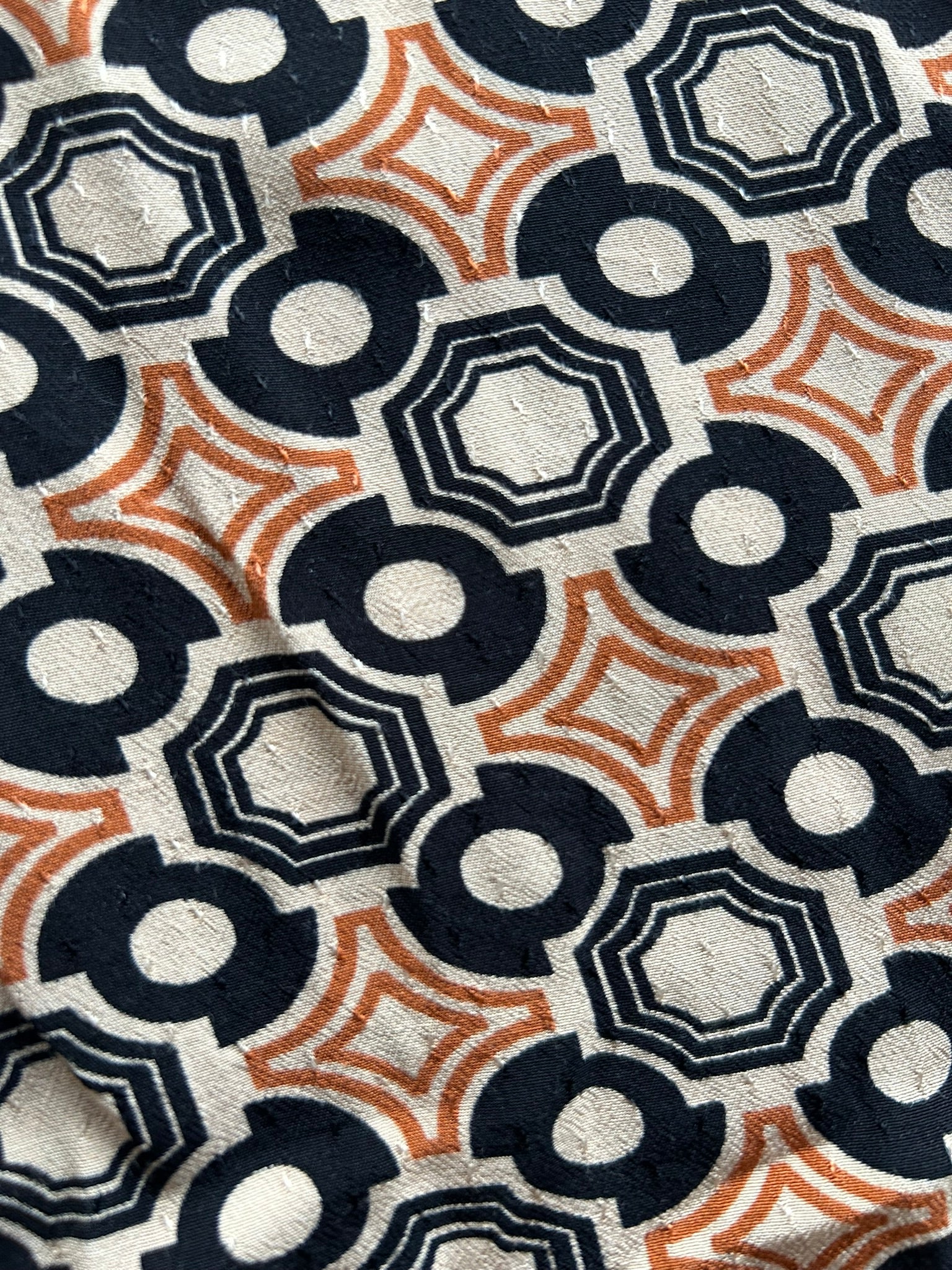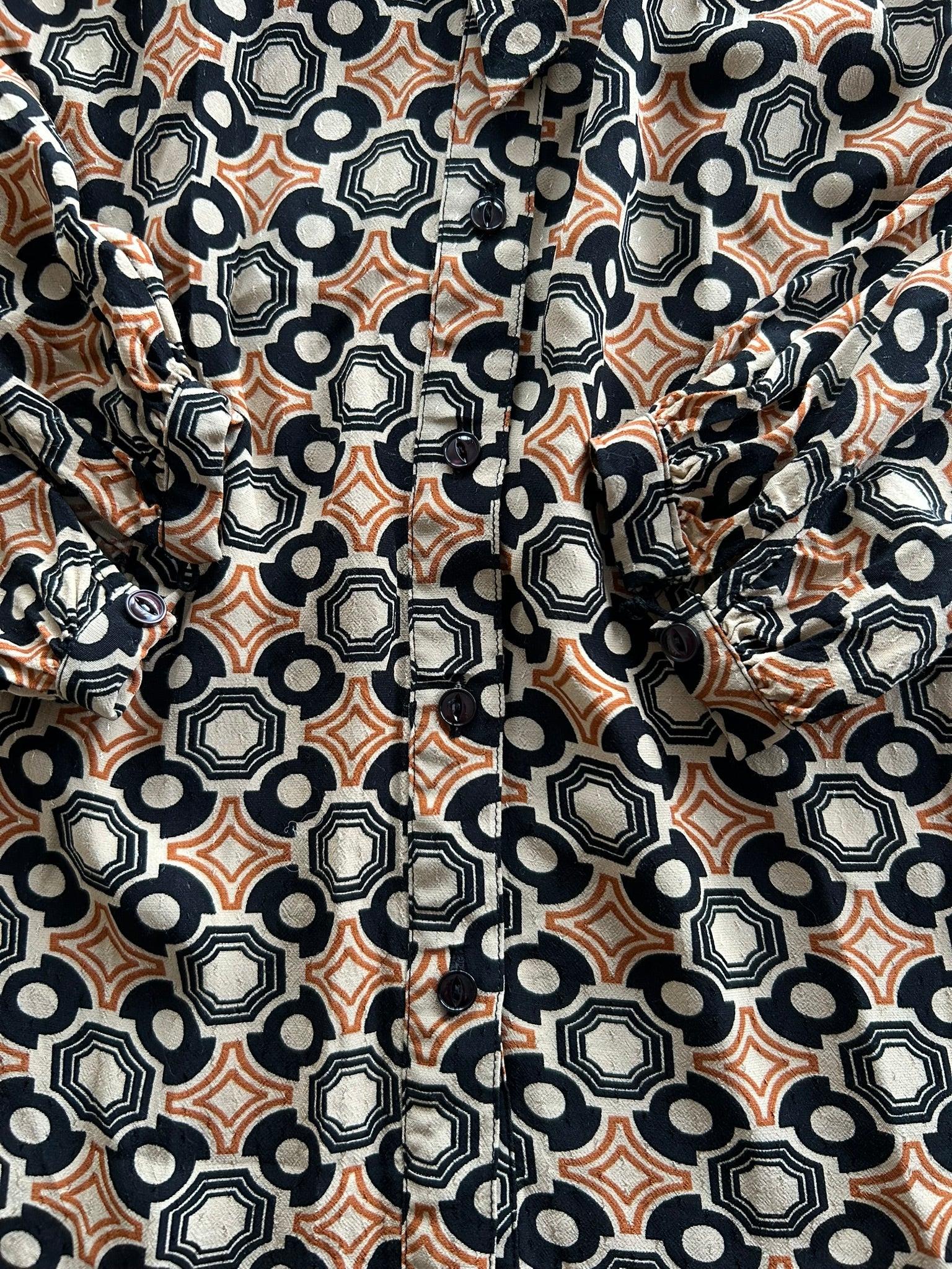 - Zwart met beige/creme, wit, koraal-oranje retro print
