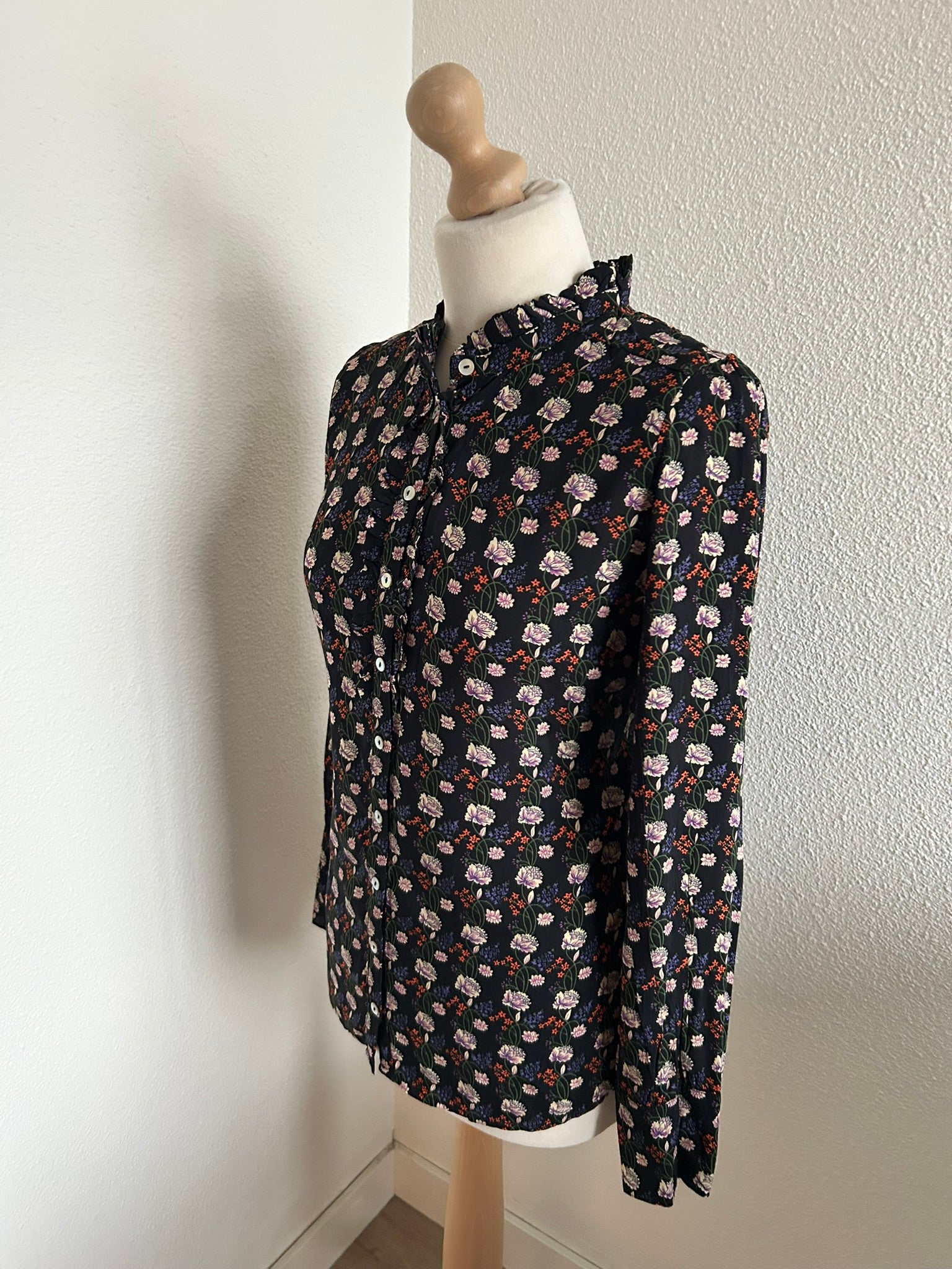 - Leuke halslijn met kort kraagje voorzien van ruffle/rusches, lange mouwen, glanzende knoopjes
