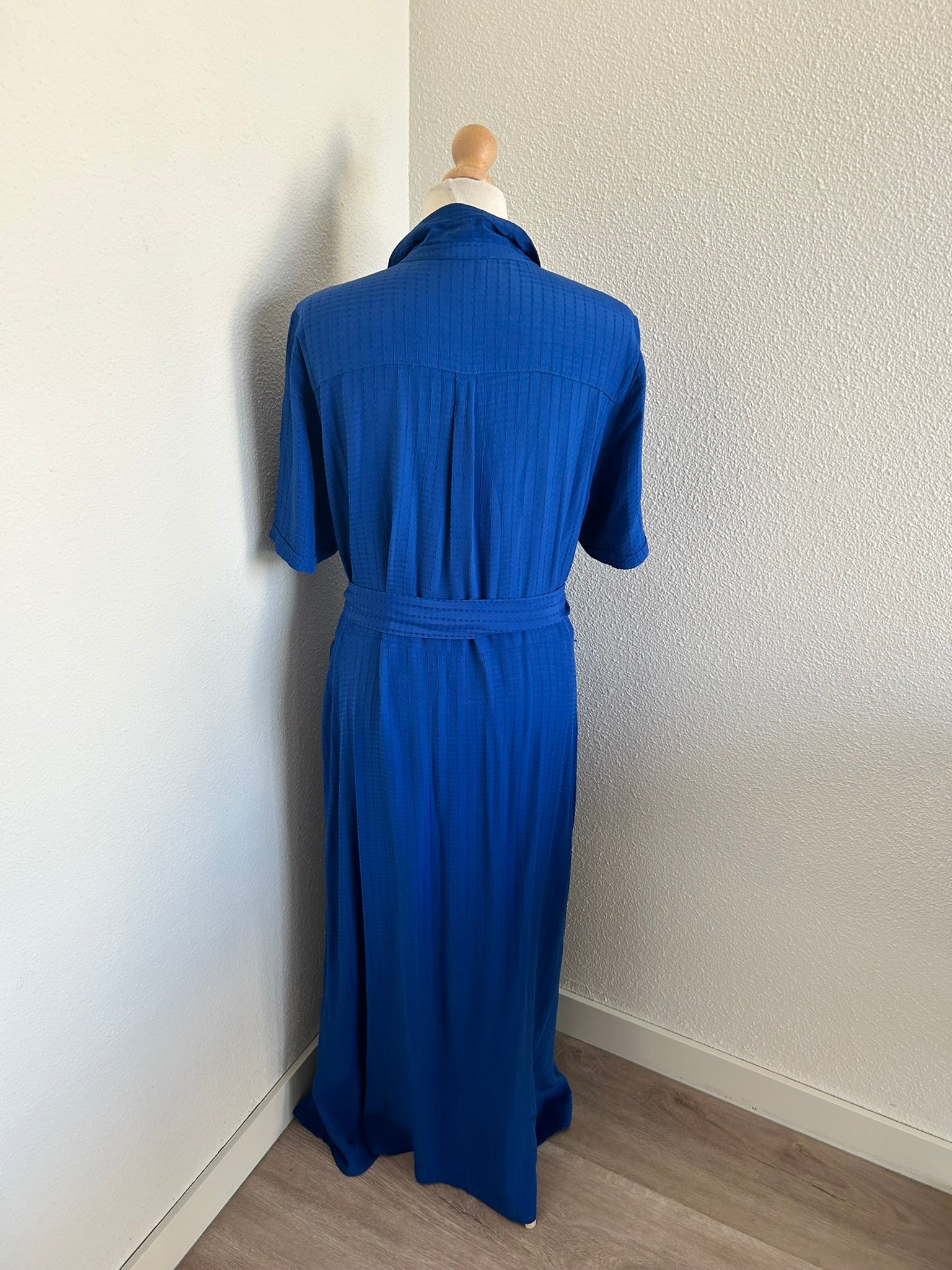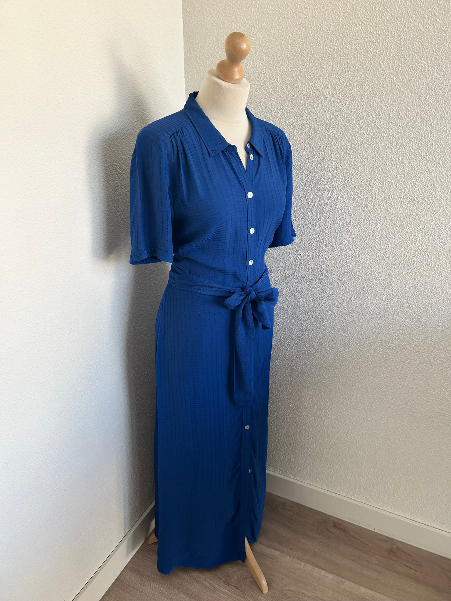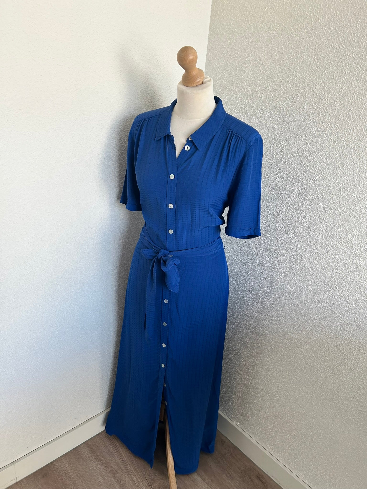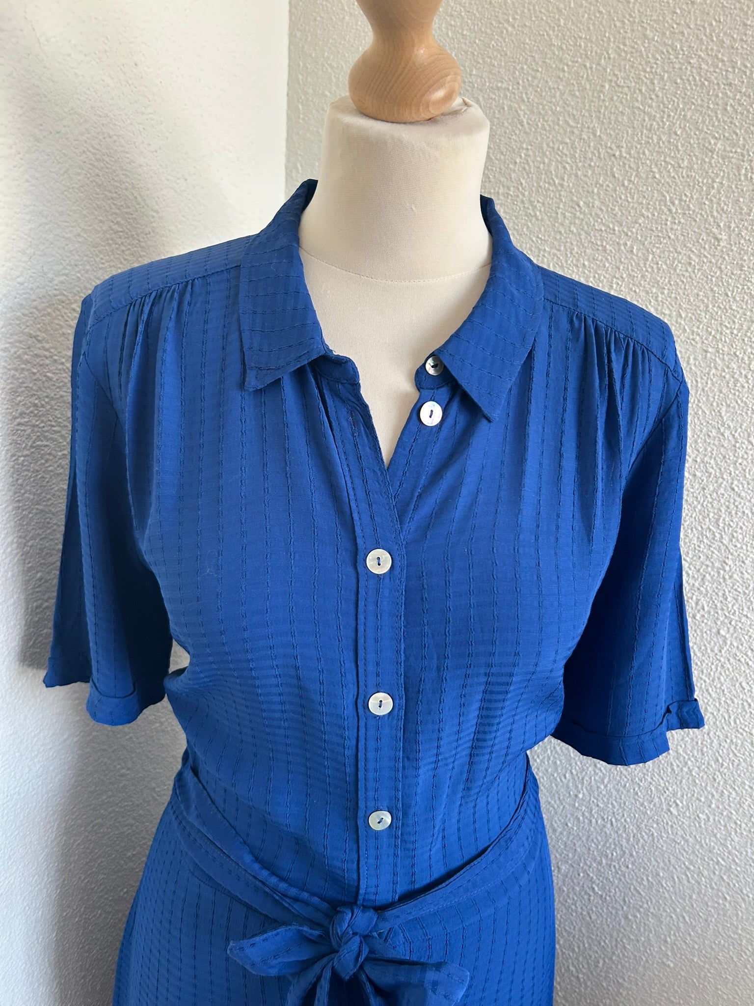 - Mooie halslijn met kraagje en retro knoopjes tot onder, korte mouwen, getailleerd door knooplint, steekzakken, midi / kuit lengte