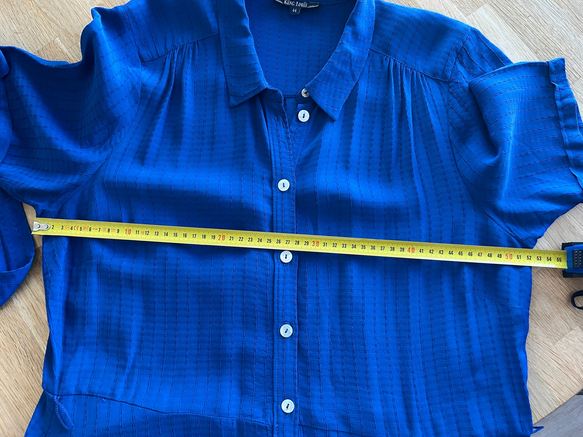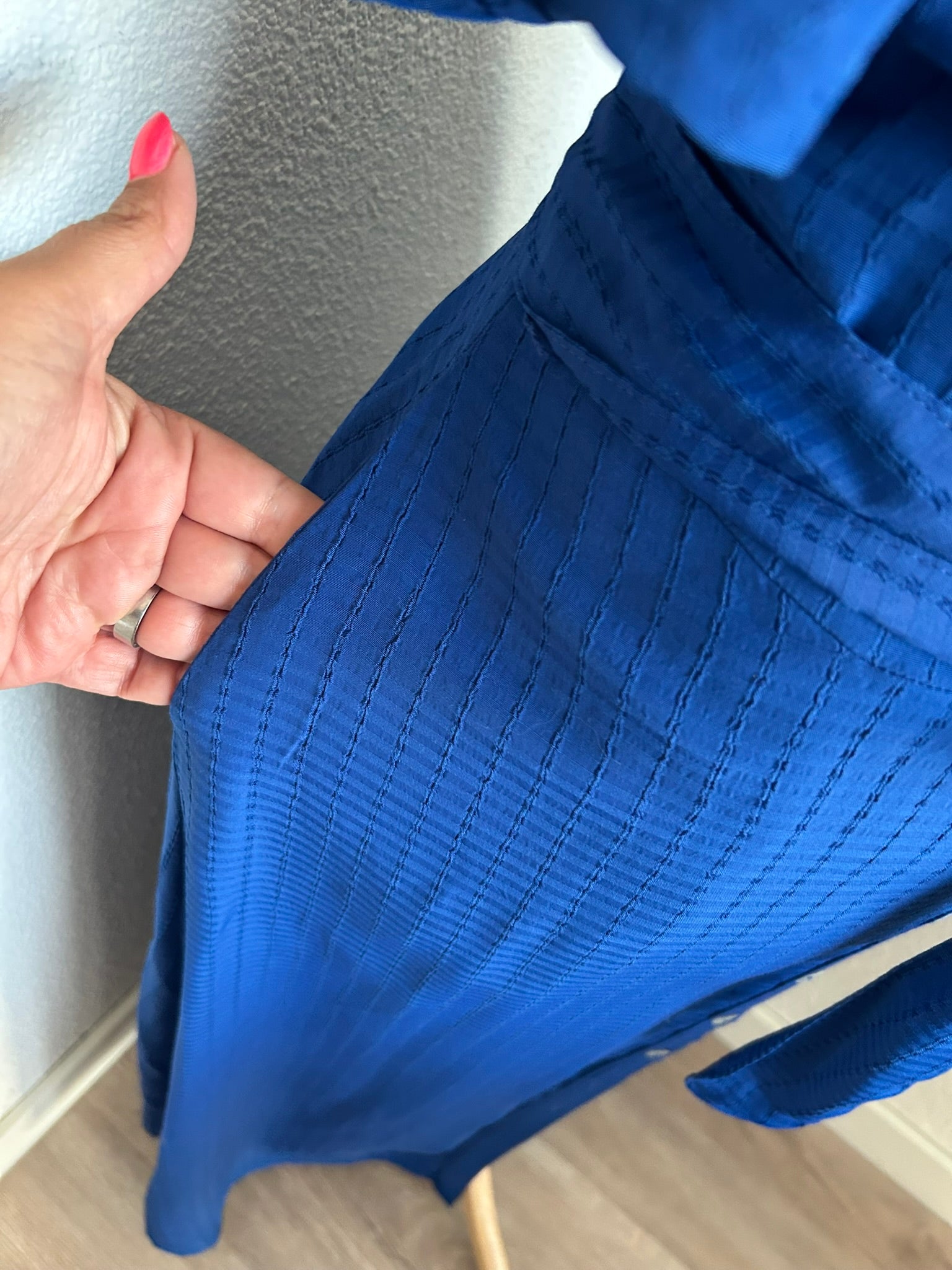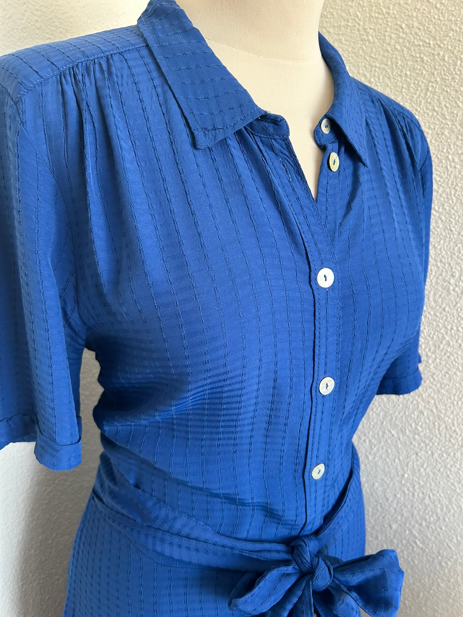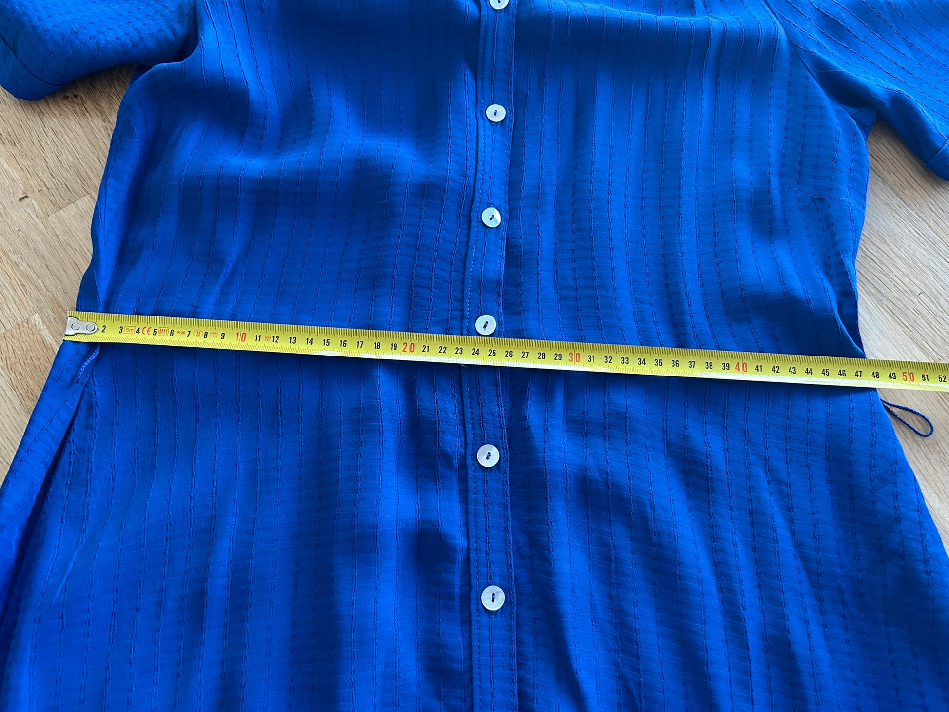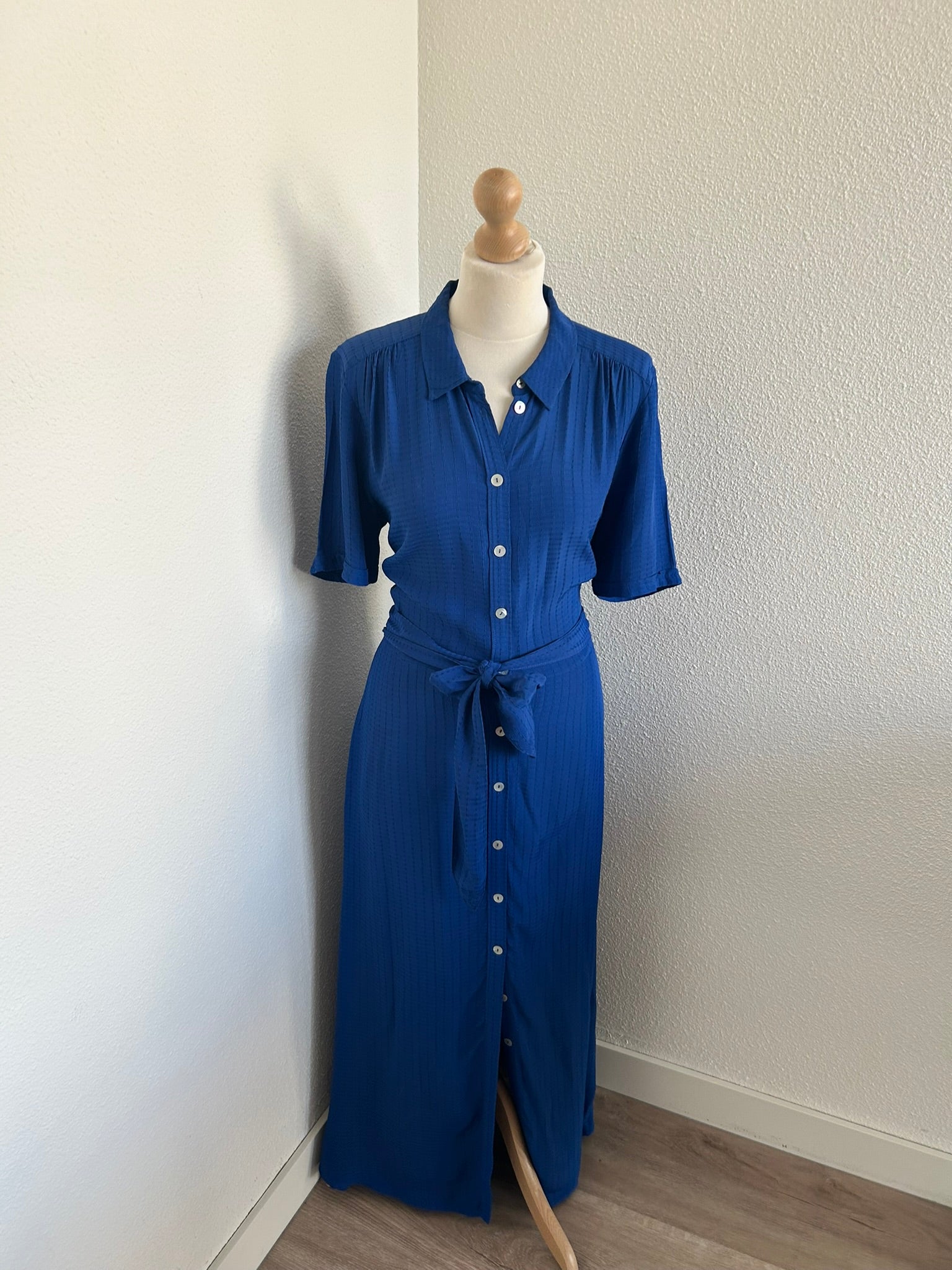 - Mooie halslijn met kraagje en retro knoopjes tot onder, korte mouwen, getailleerd door knooplint, steekzakken, midi / kuit lengte