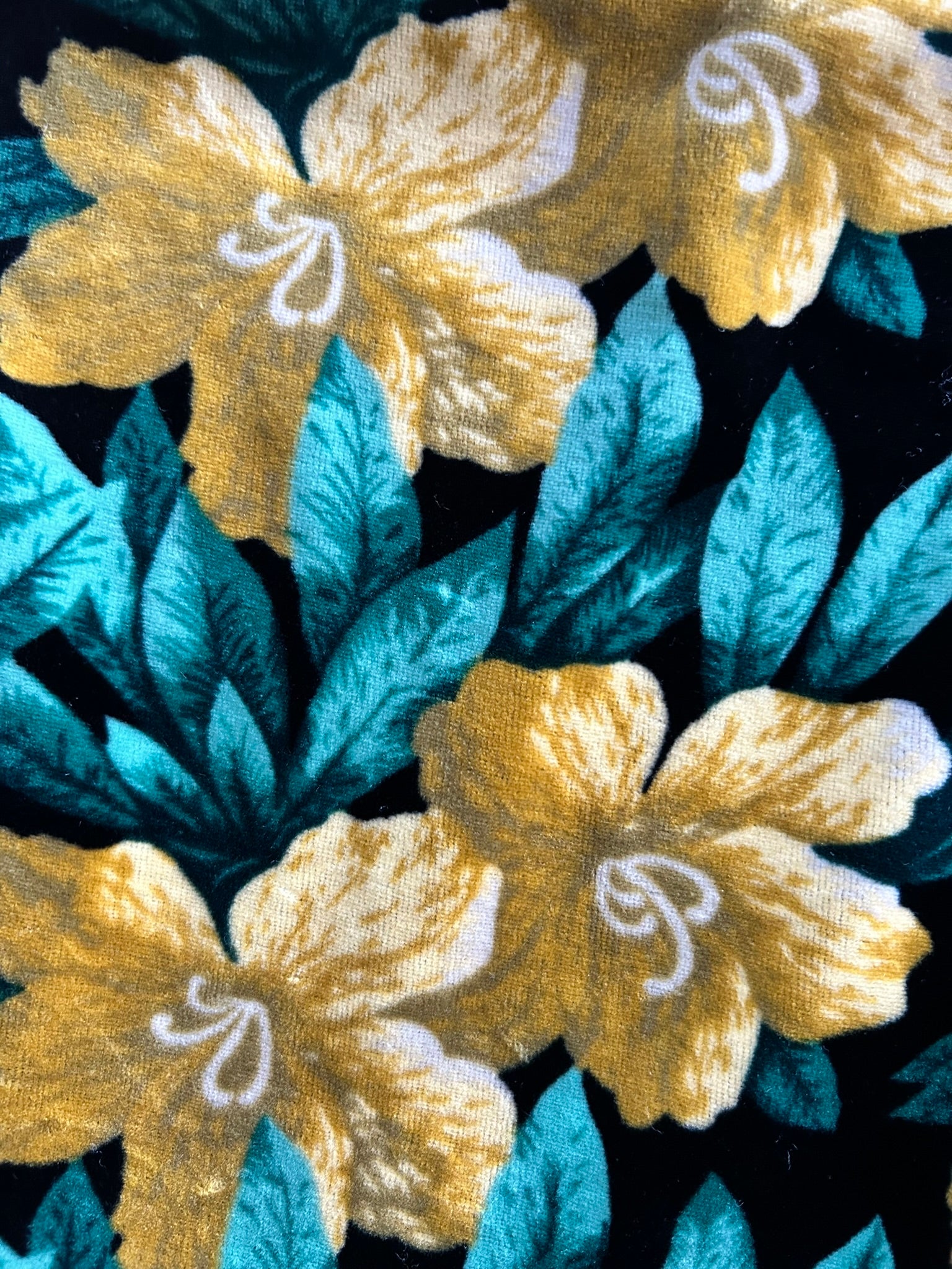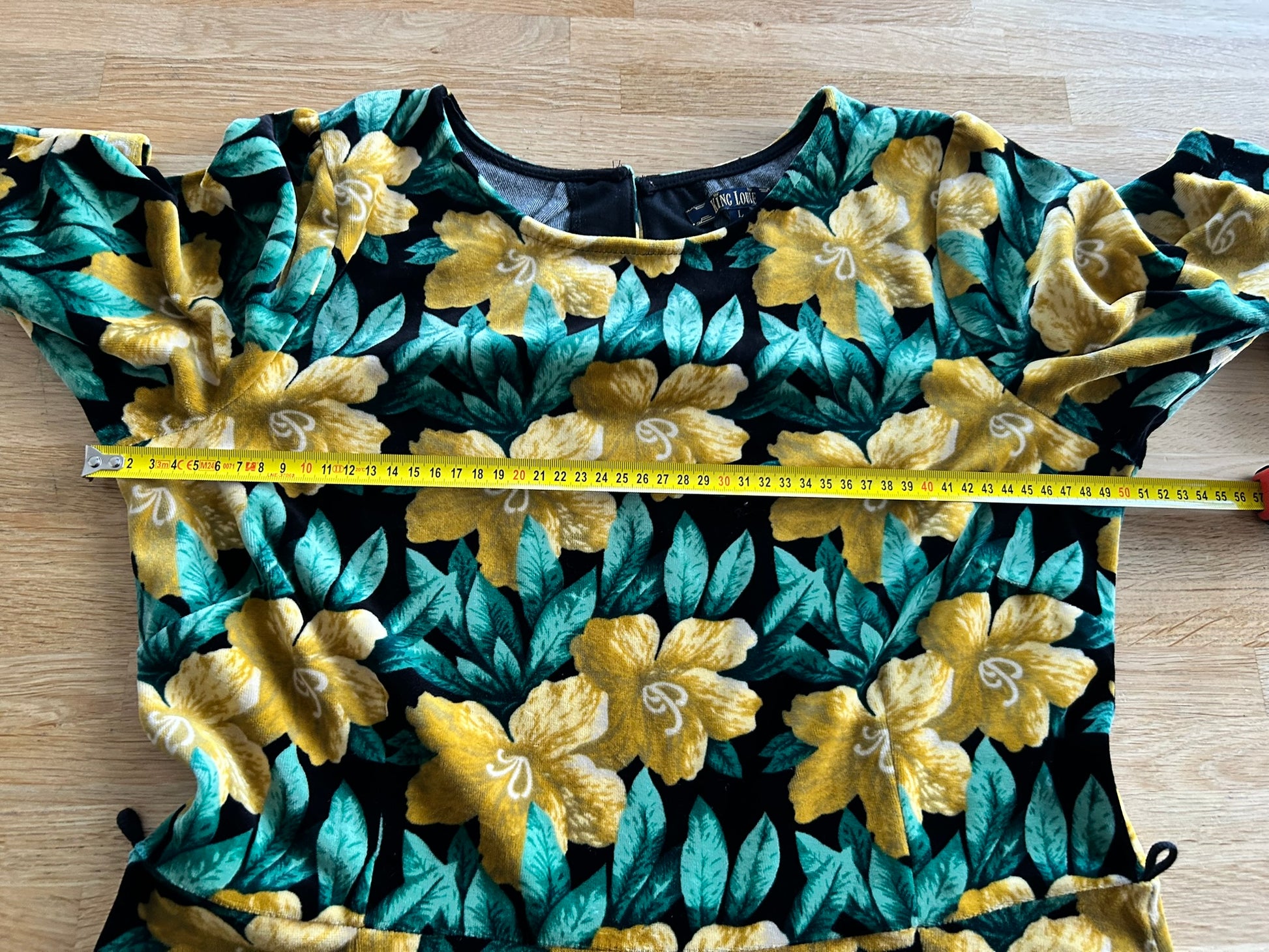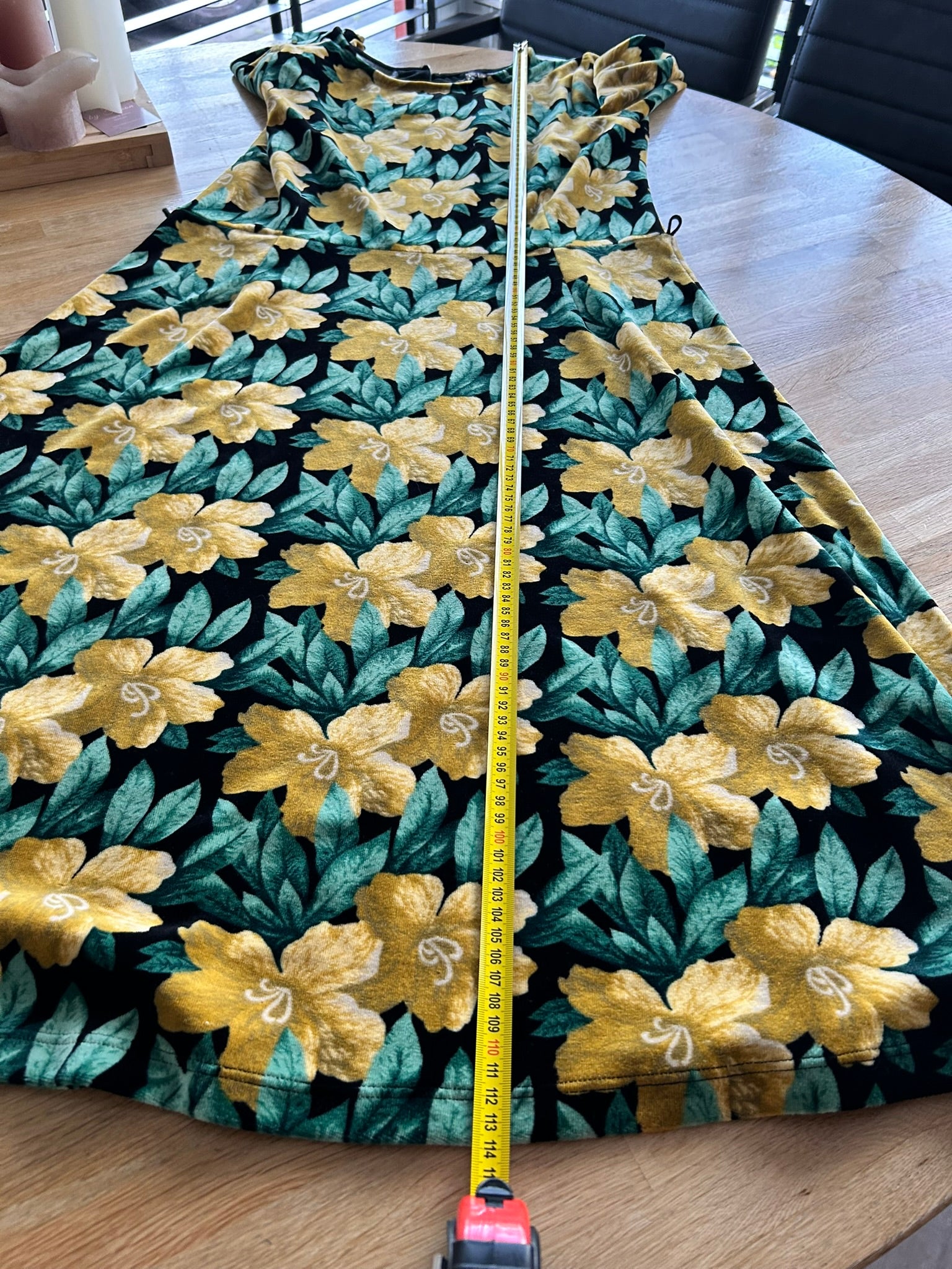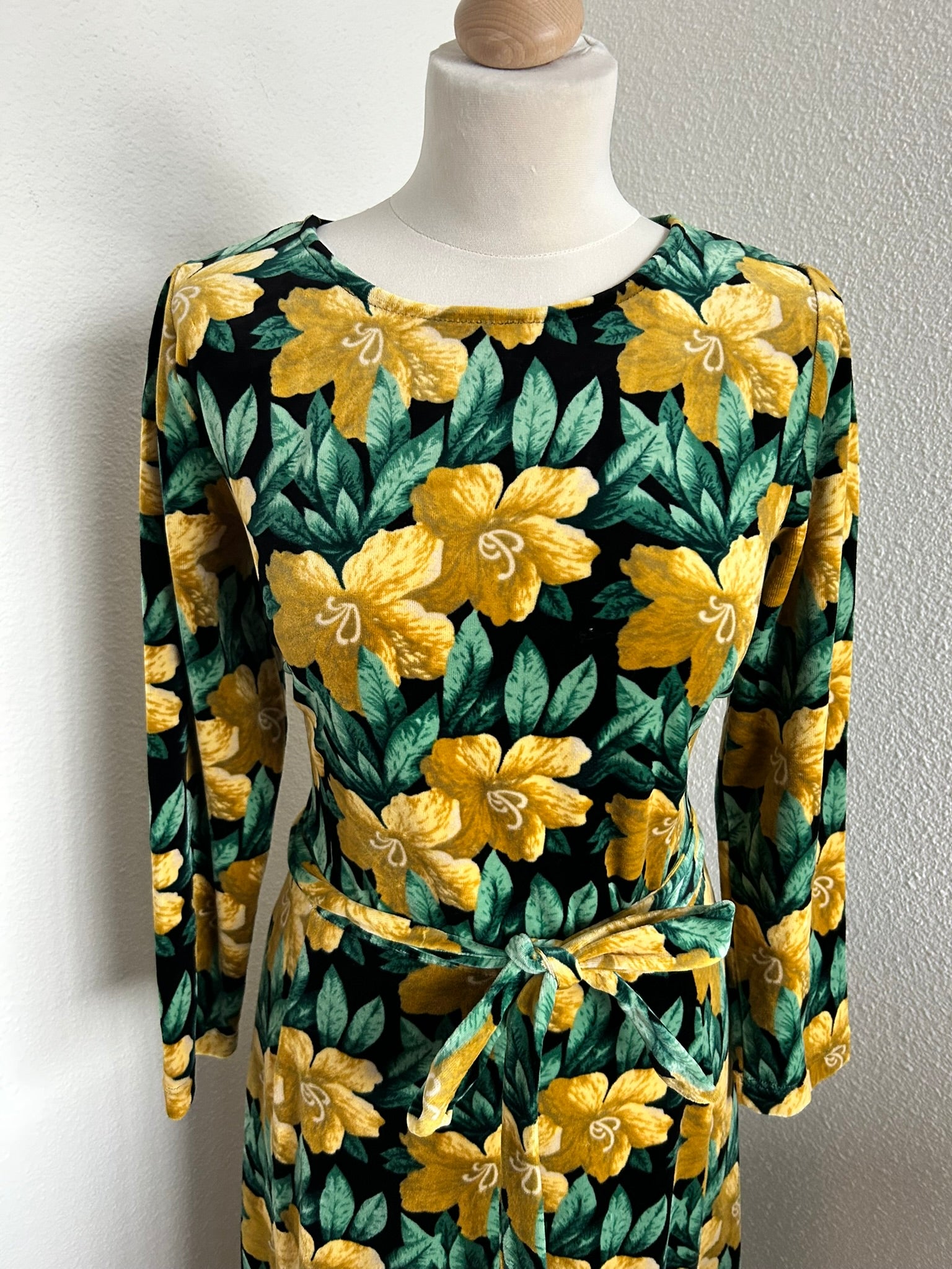 - Leuke najaars jurk in retro goud gele en groene bloemen print op zwarte ondergrond