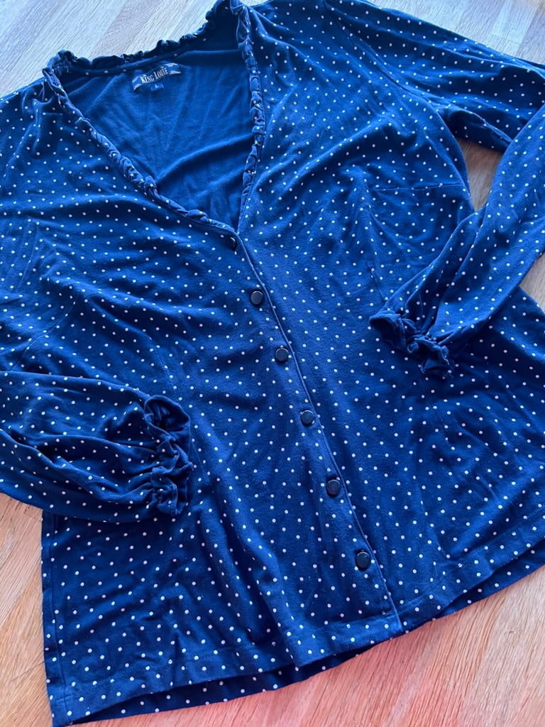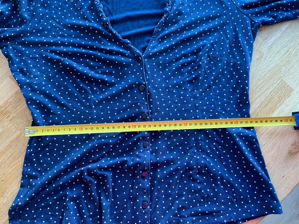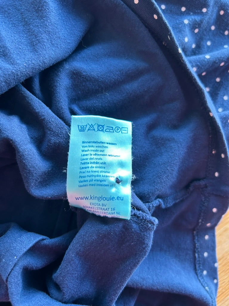 - Donkerblauw/marine blauw met witte lieve stipjes en ruffle/rushes aan de hals