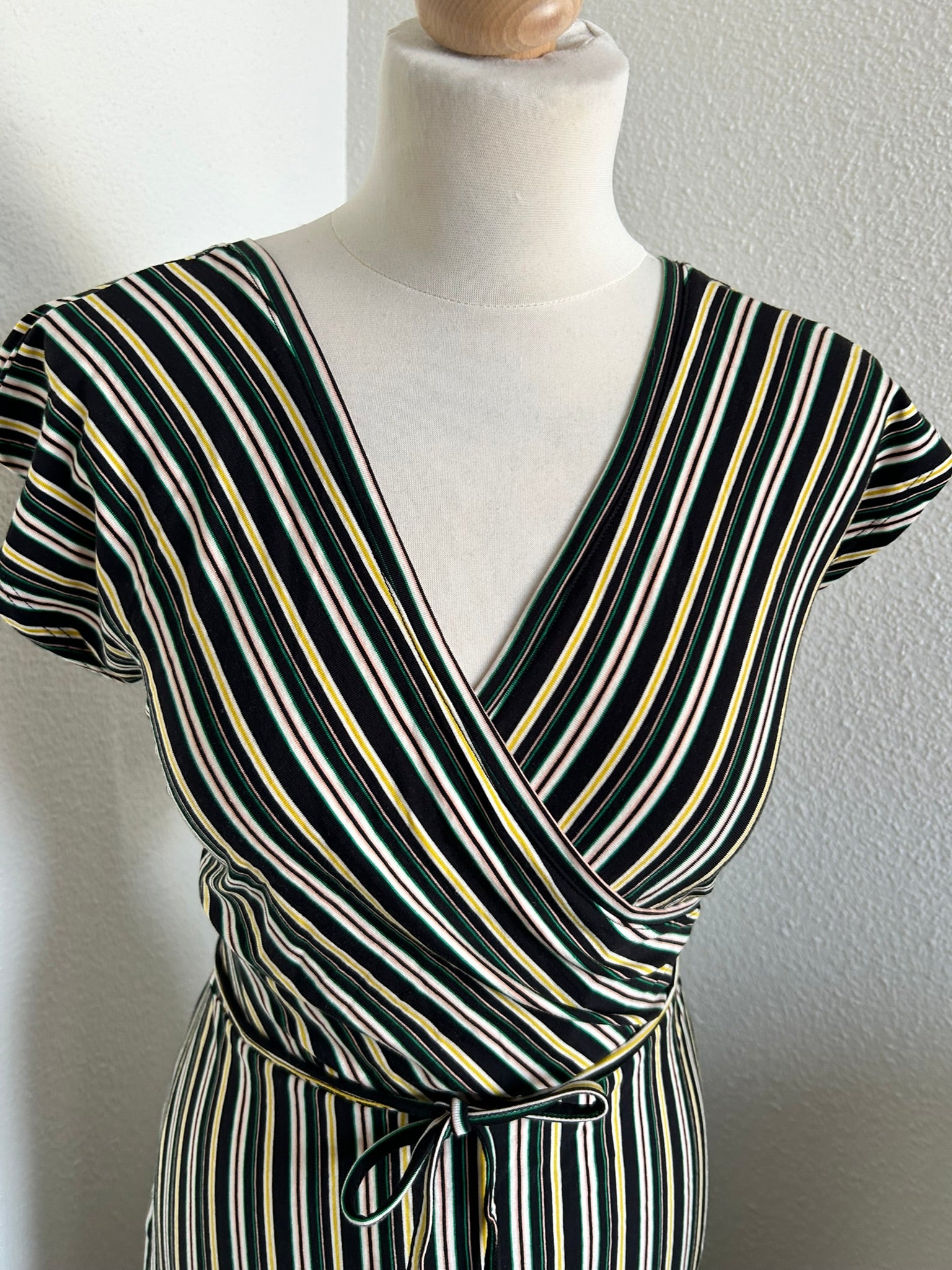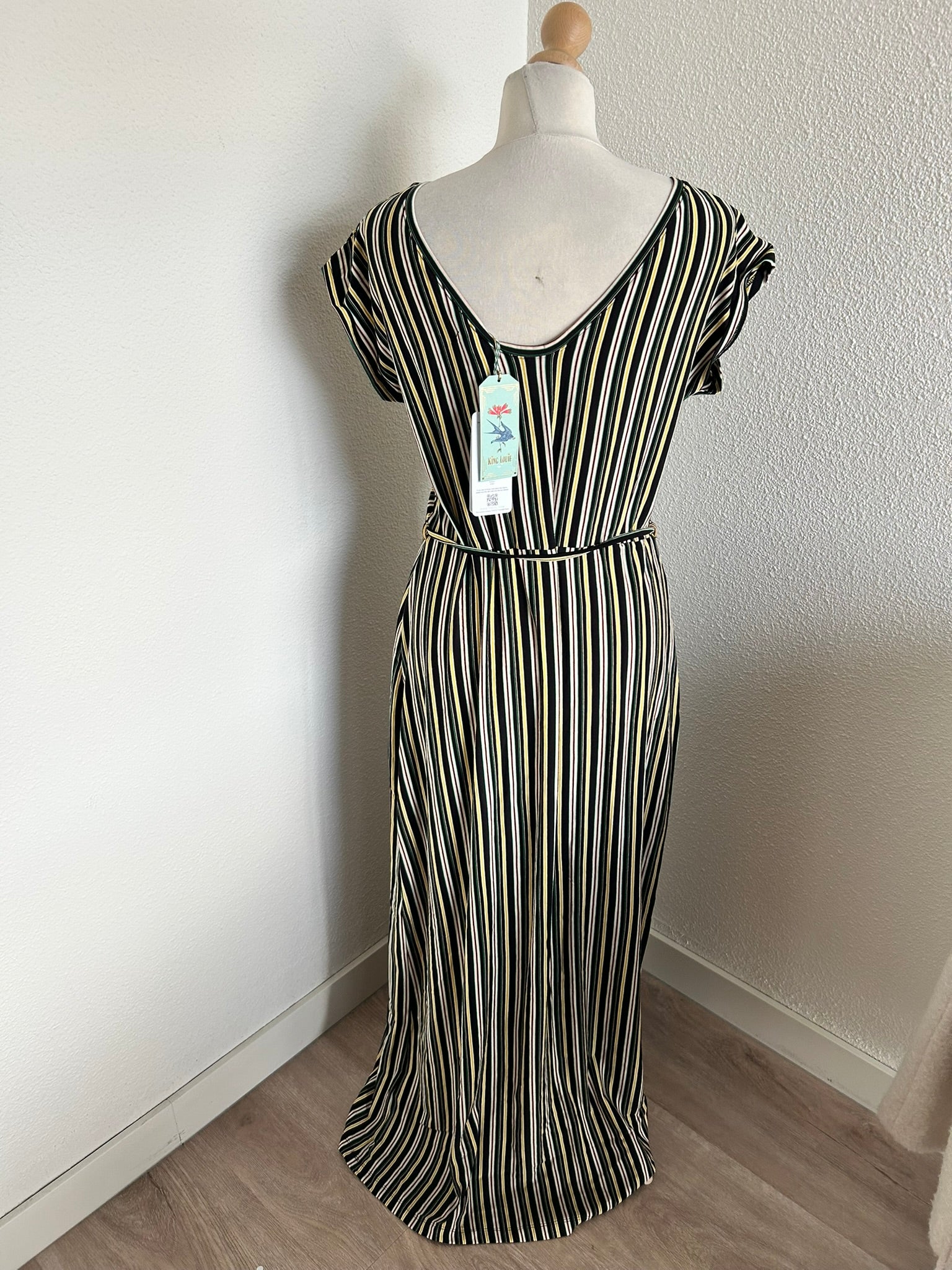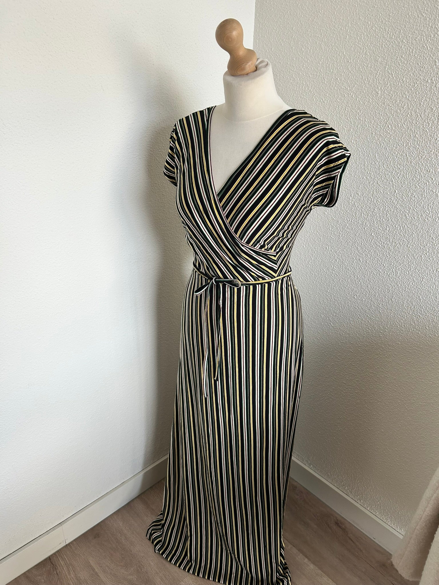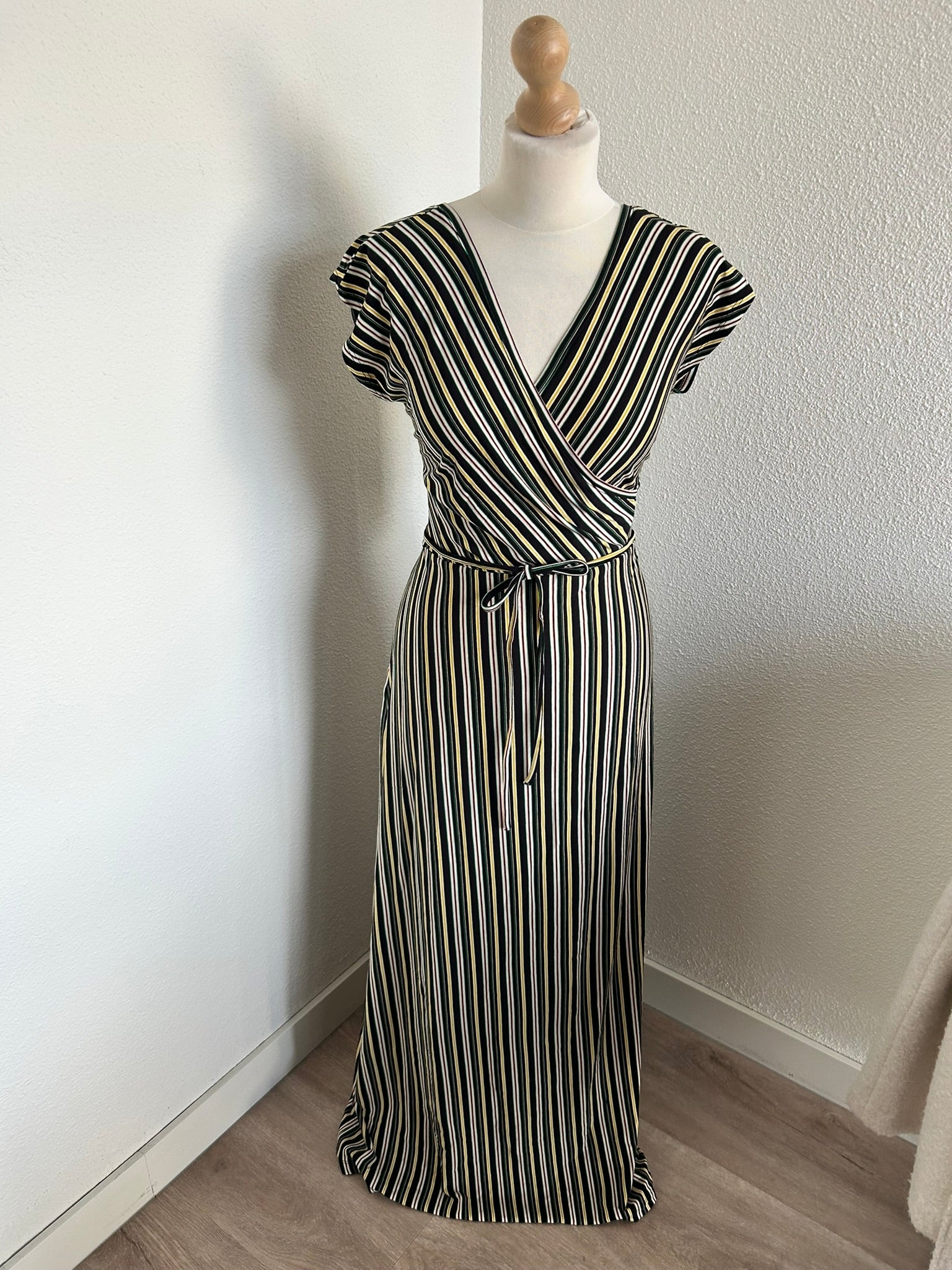 Mooie halslijn met overslag op de borst, korte mouwen, mooi rug lijn, getailleerd met knooplintje rond het middel, maxi lengte