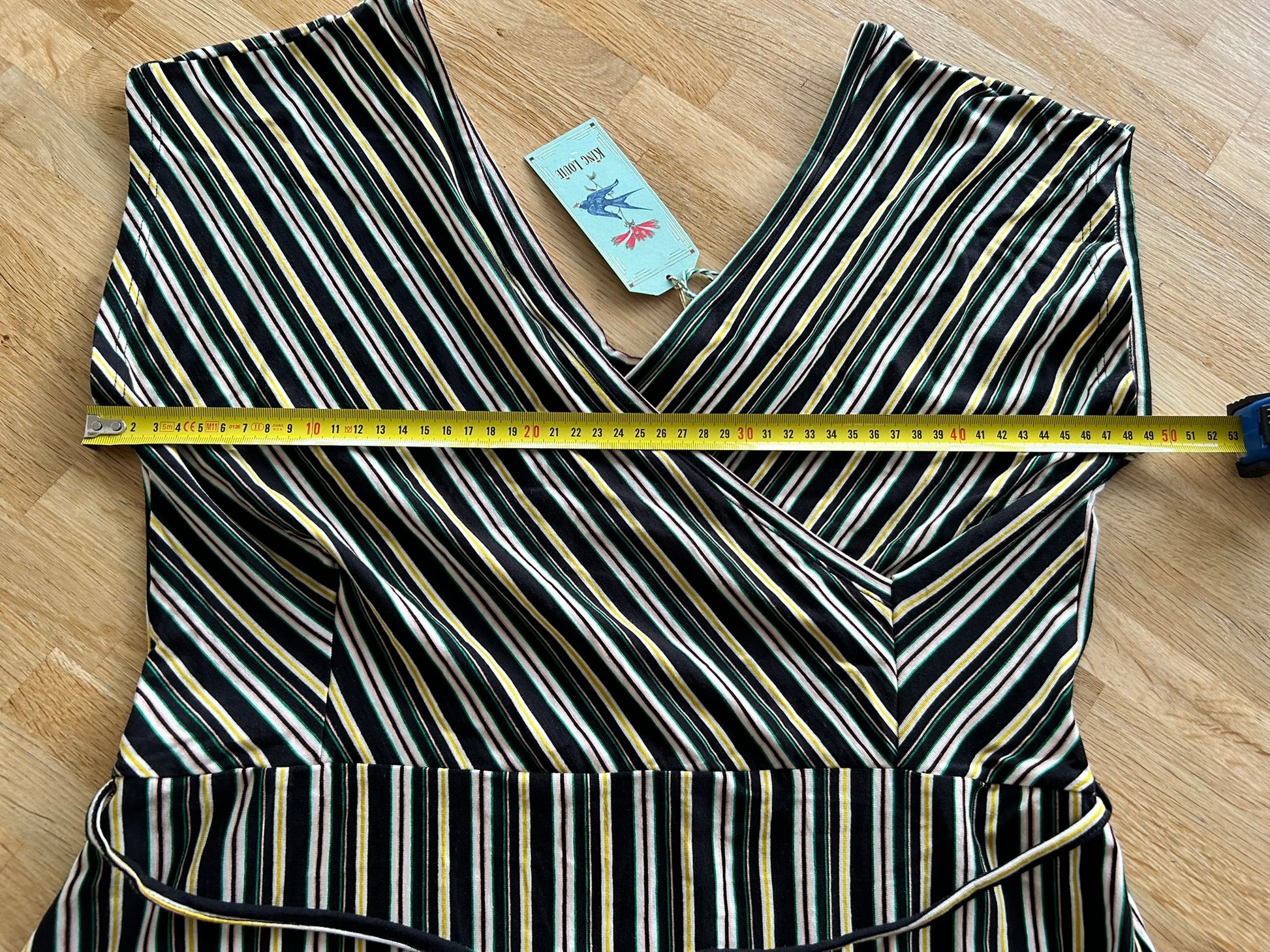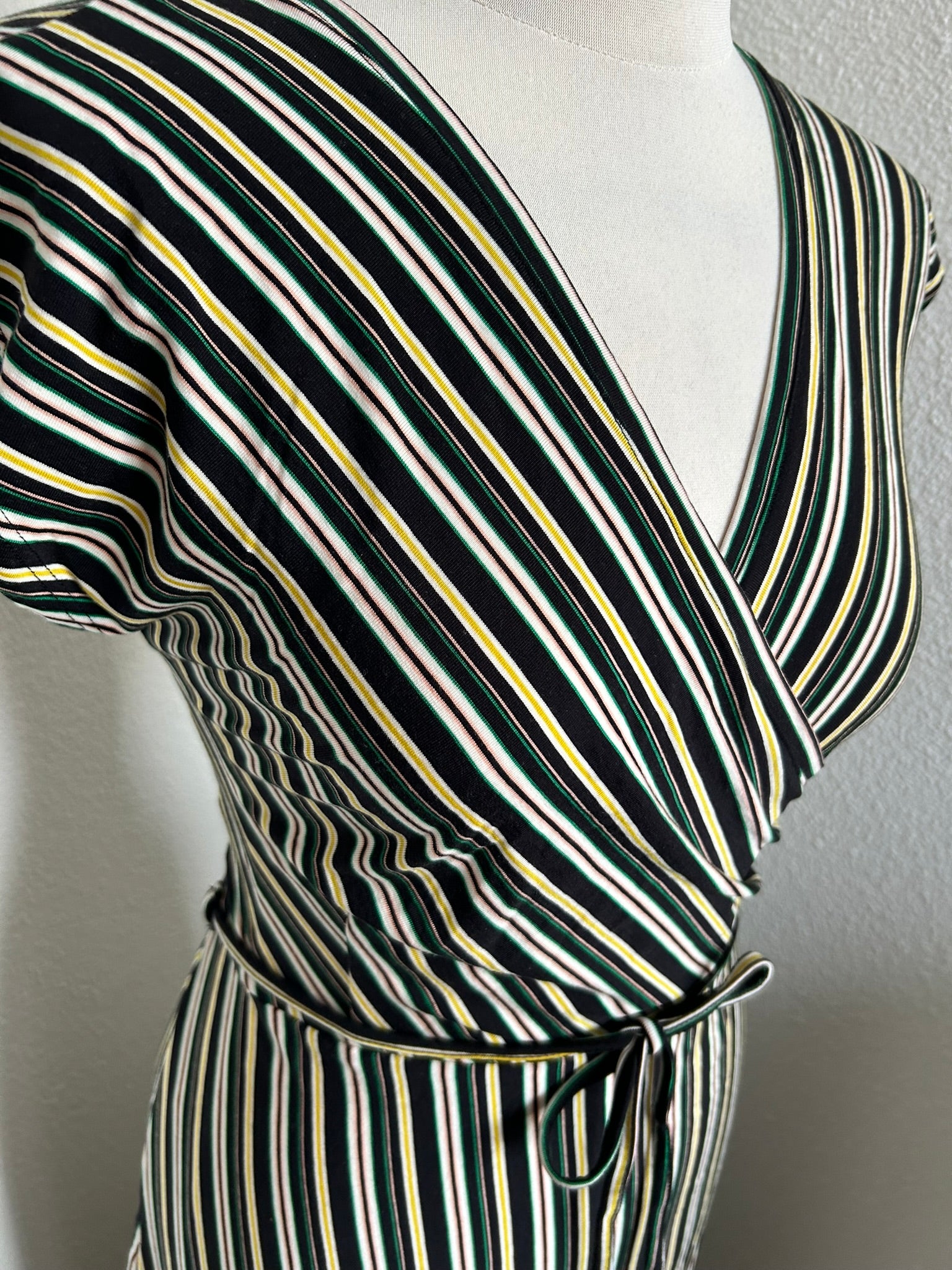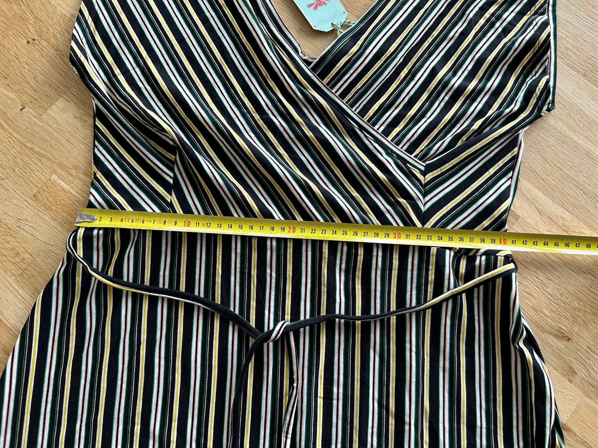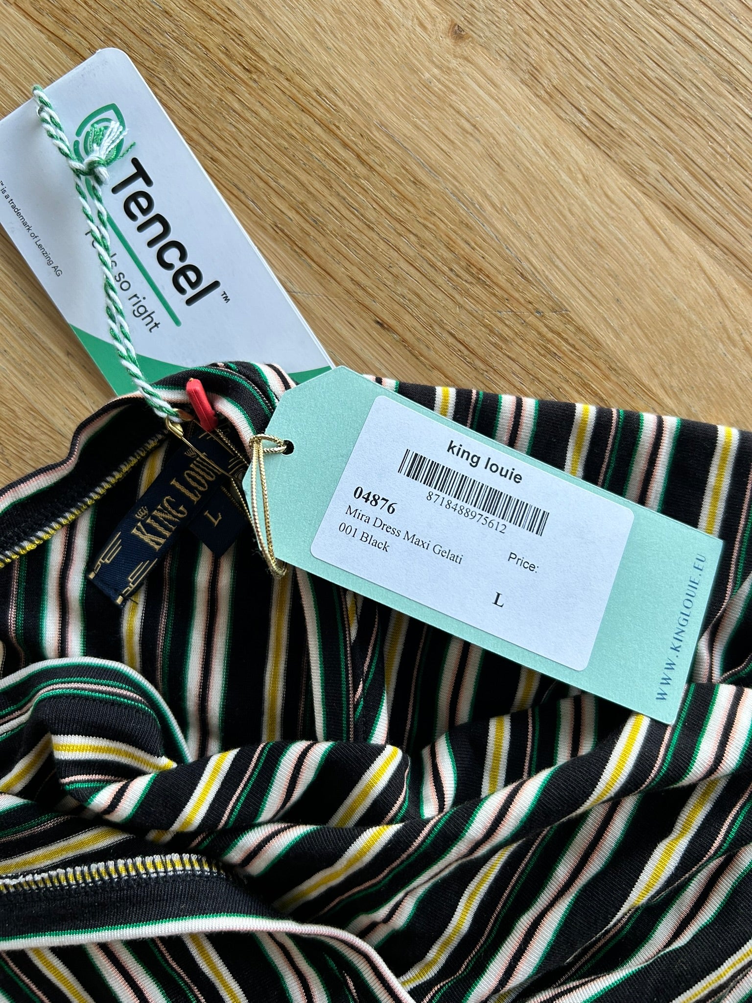 Mooie halslijn met overslag op de borst, korte mouwen, mooi rug lijn, getailleerd met knooplintje rond het middel, maxi lengte
