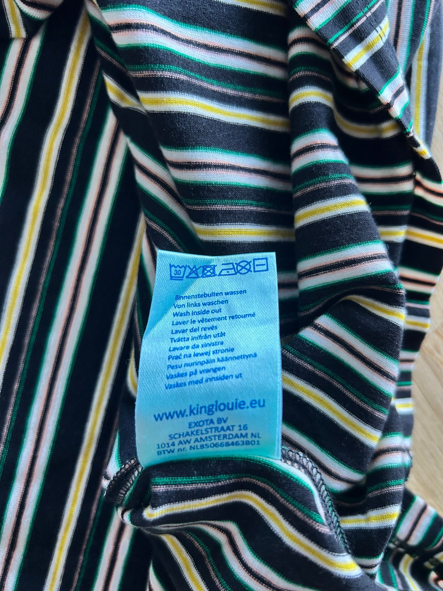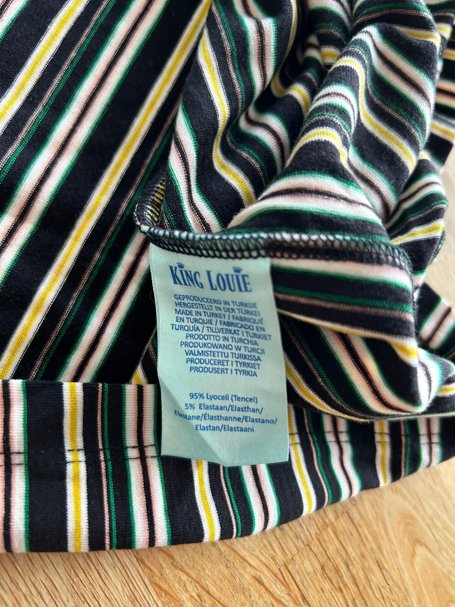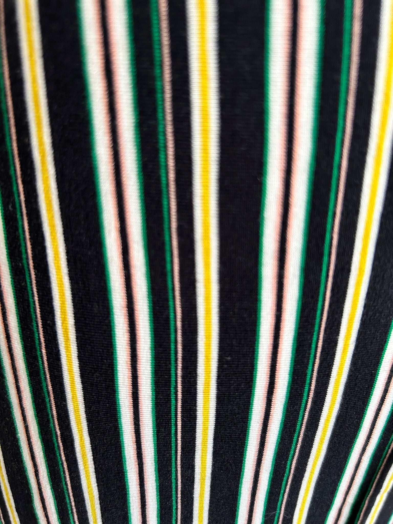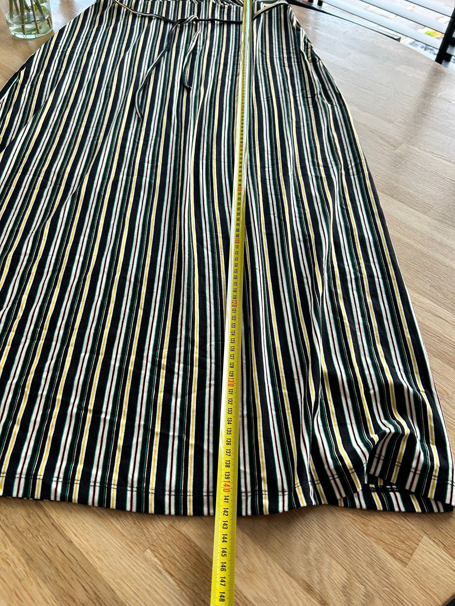 Mooie halslijn met overslag op de borst, korte mouwen, mooi rug lijn, getailleerd met knooplintje rond het middel, maxi lengte