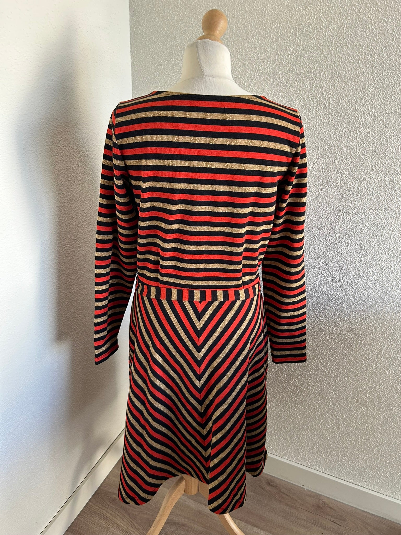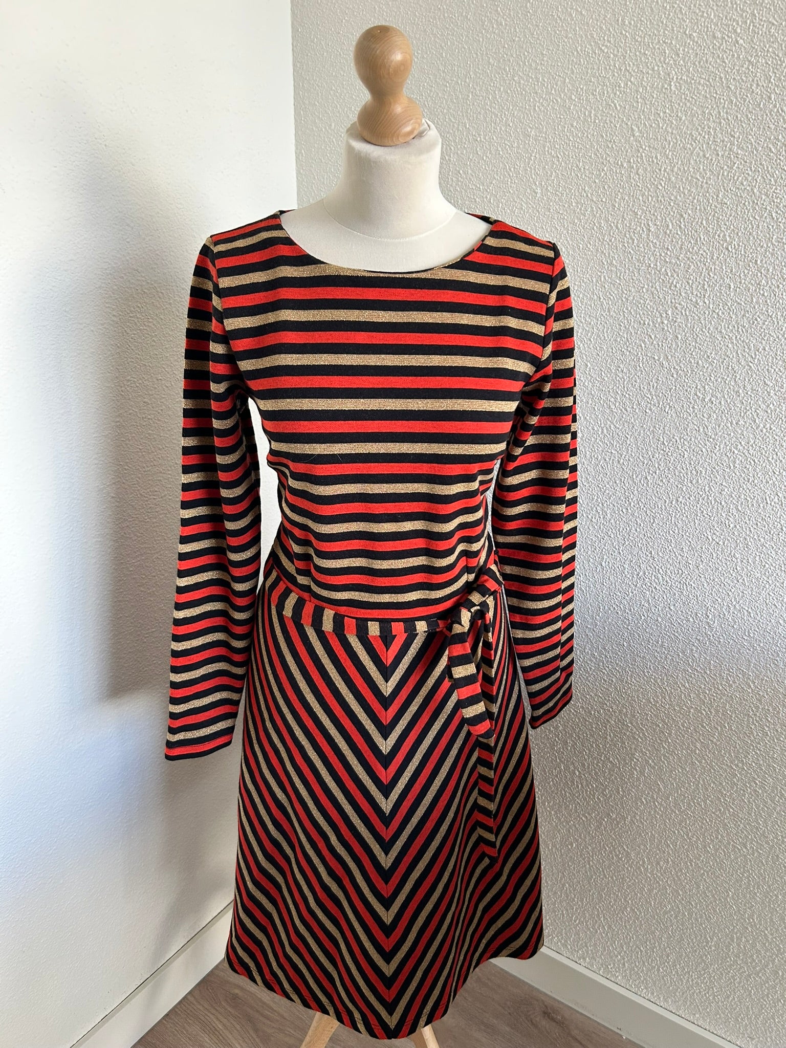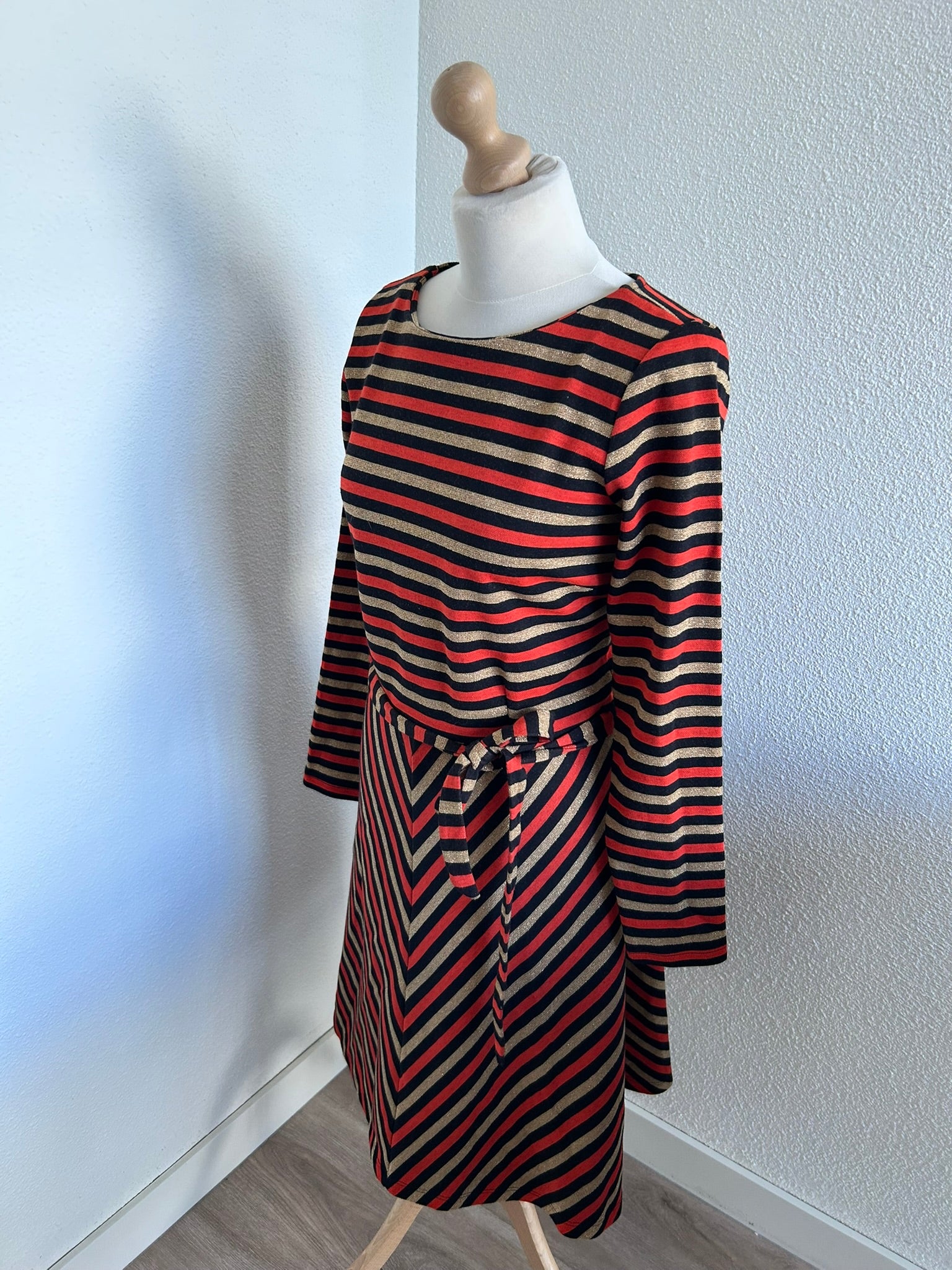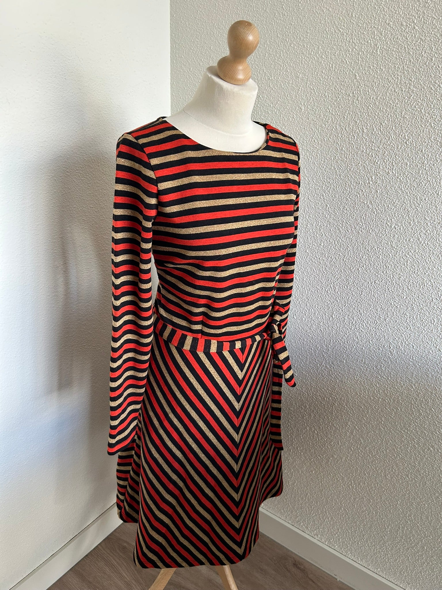 - Leuke najaars jurk in zwart, koraal-rood en gouden strepen, glitter