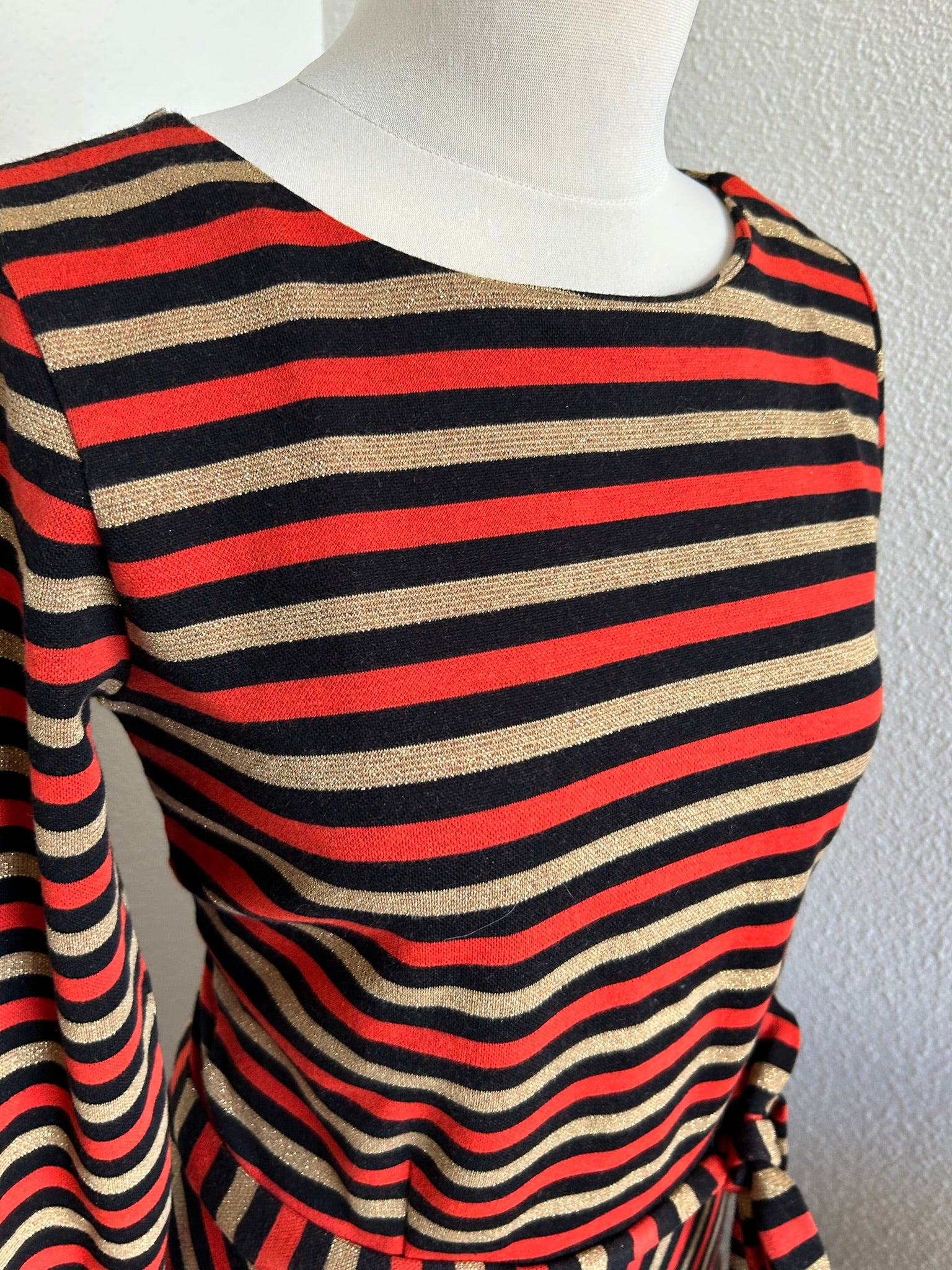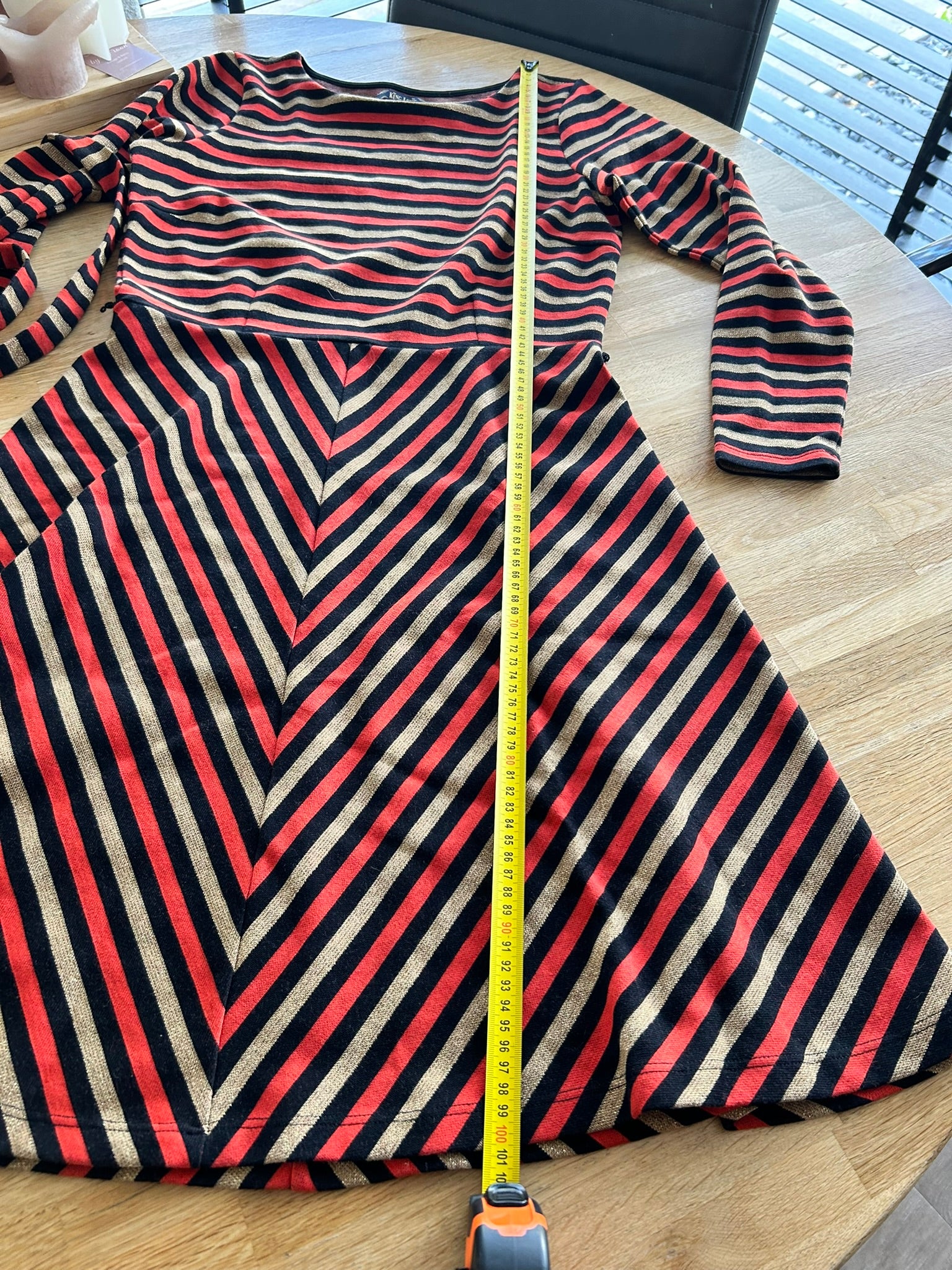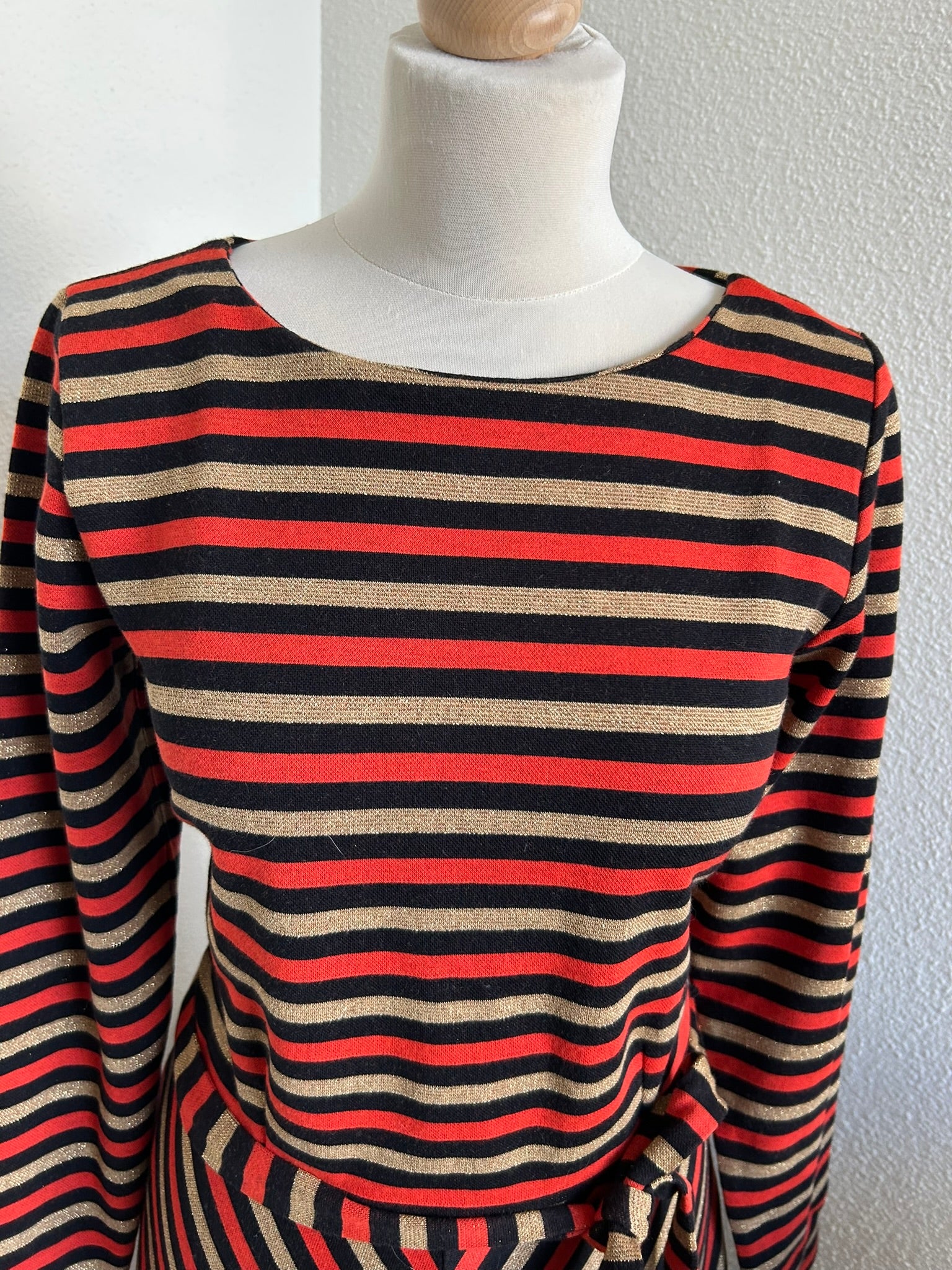- Leuke najaars jurk in zwart, koraal-rood en gouden strepen, glitter