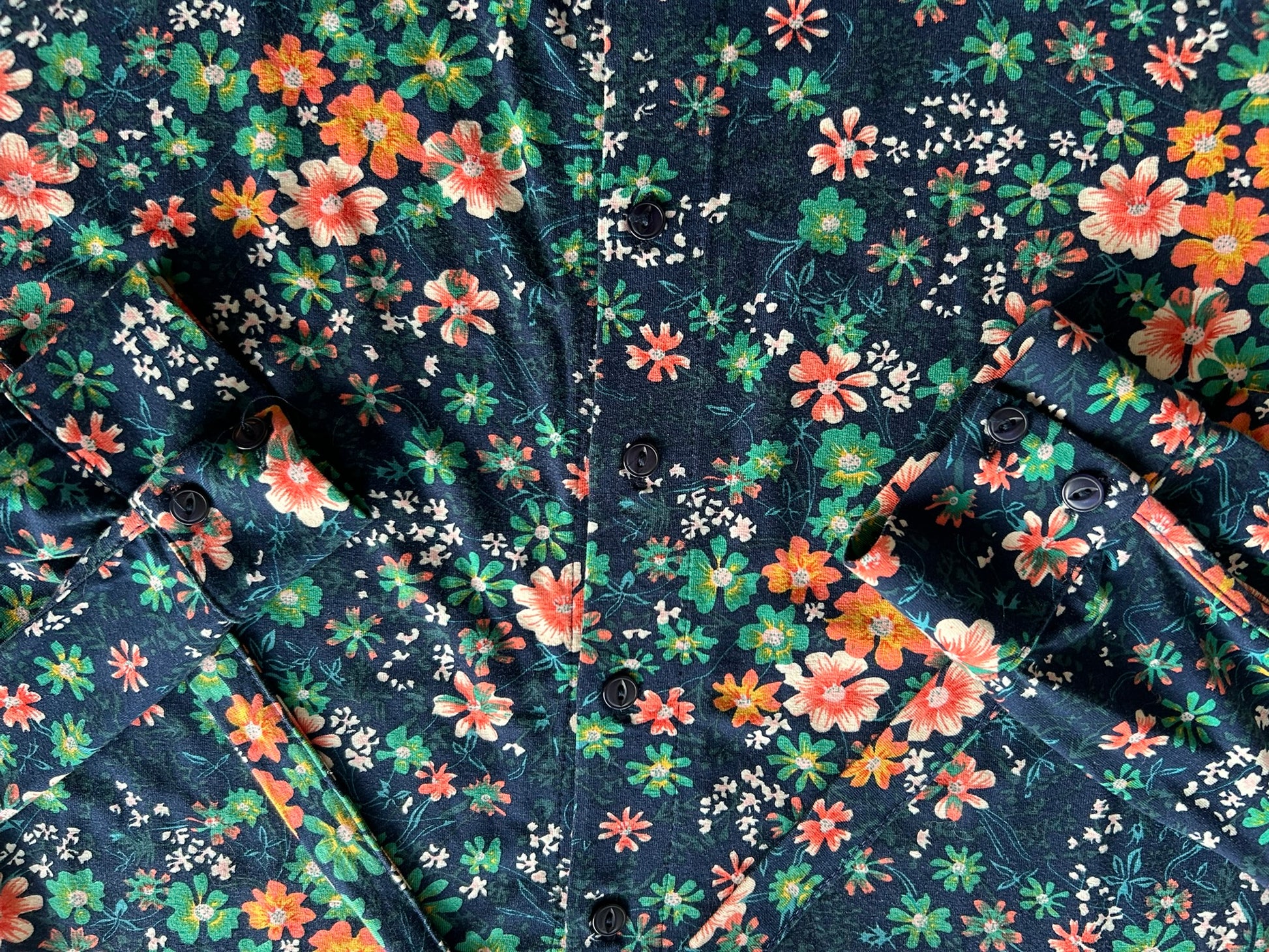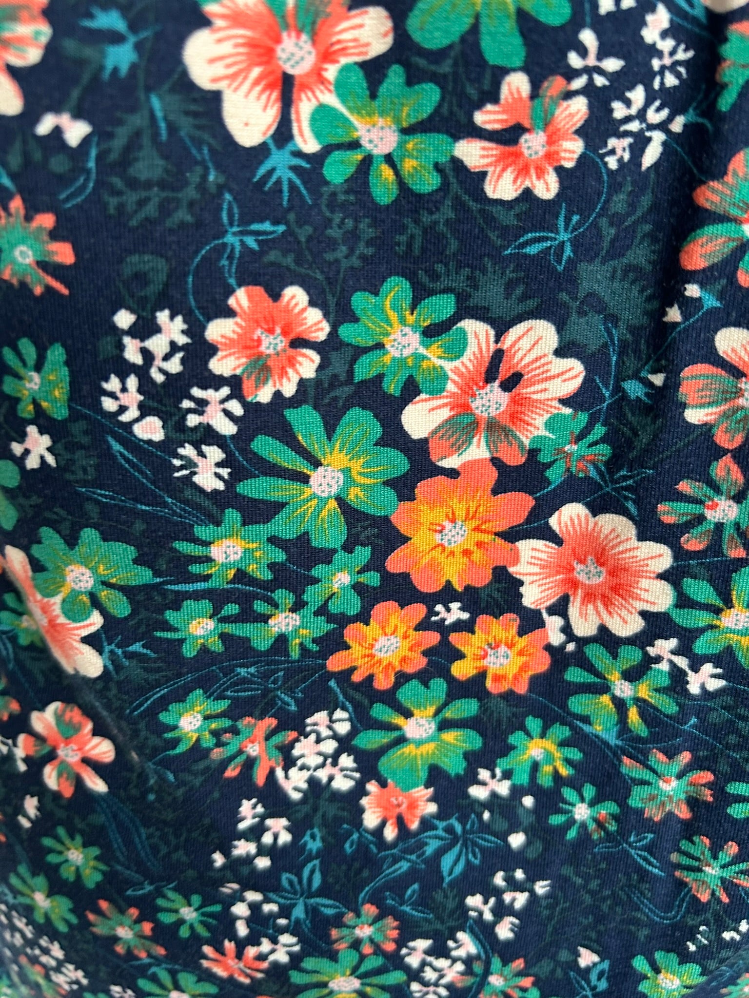 - Donkerblauw met beige/creme, wit, koraal-oranje, roze geel en groene retro lieve bloemetjes print