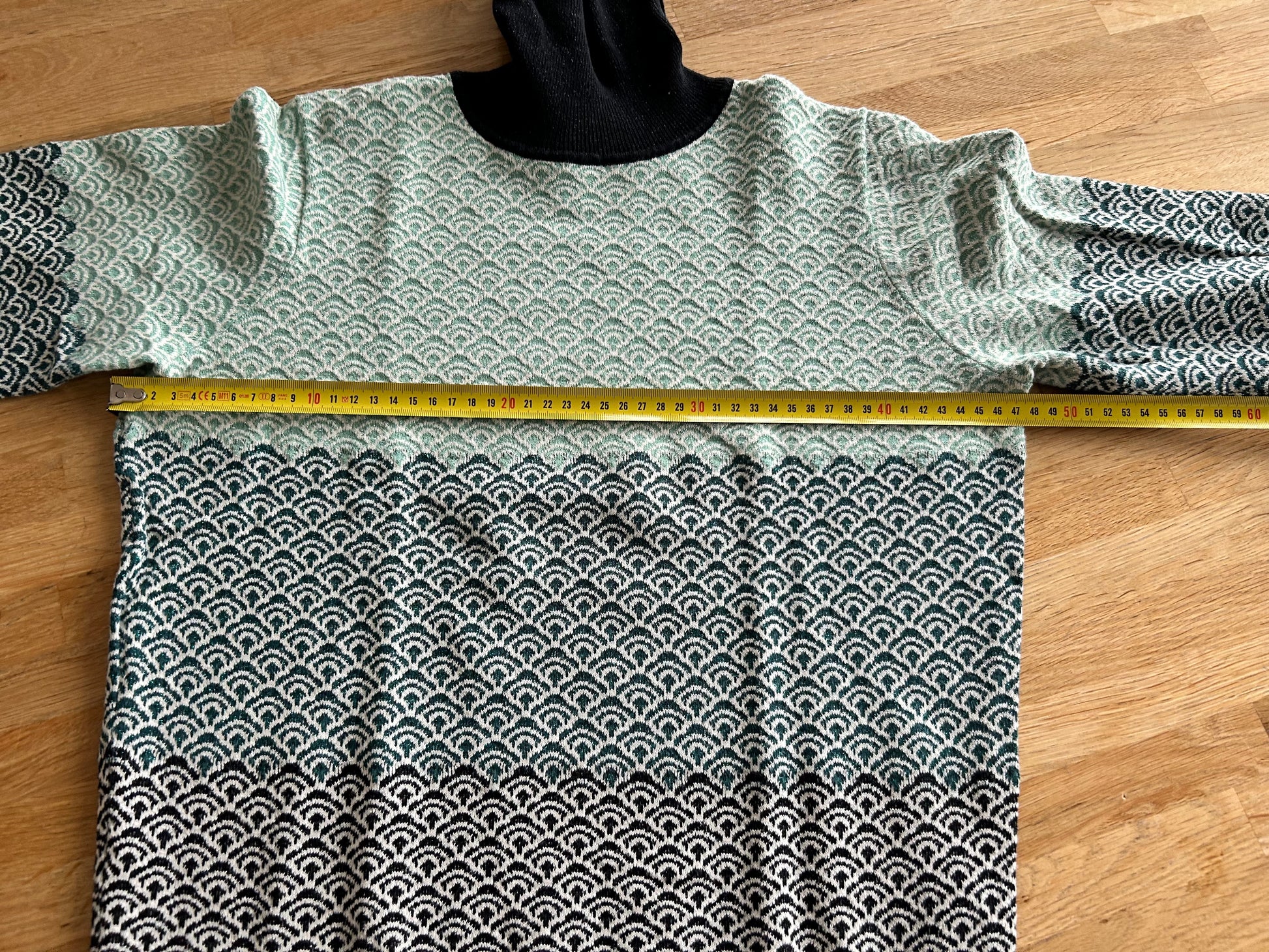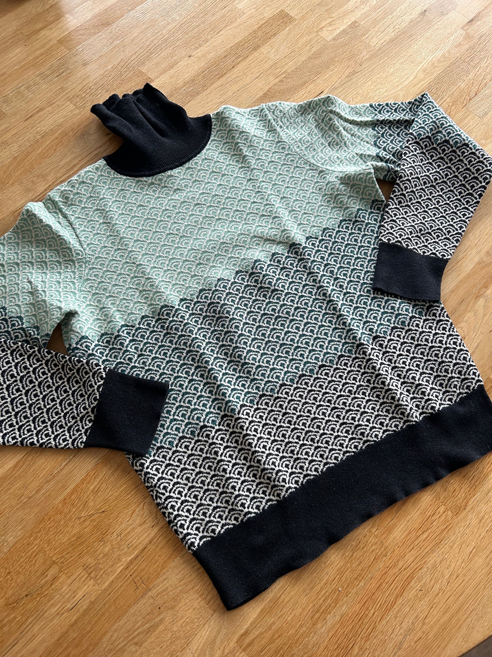 - Leuke zwarte trui met wit groene turquoise blauwe retro print en subtiele glitter all-over