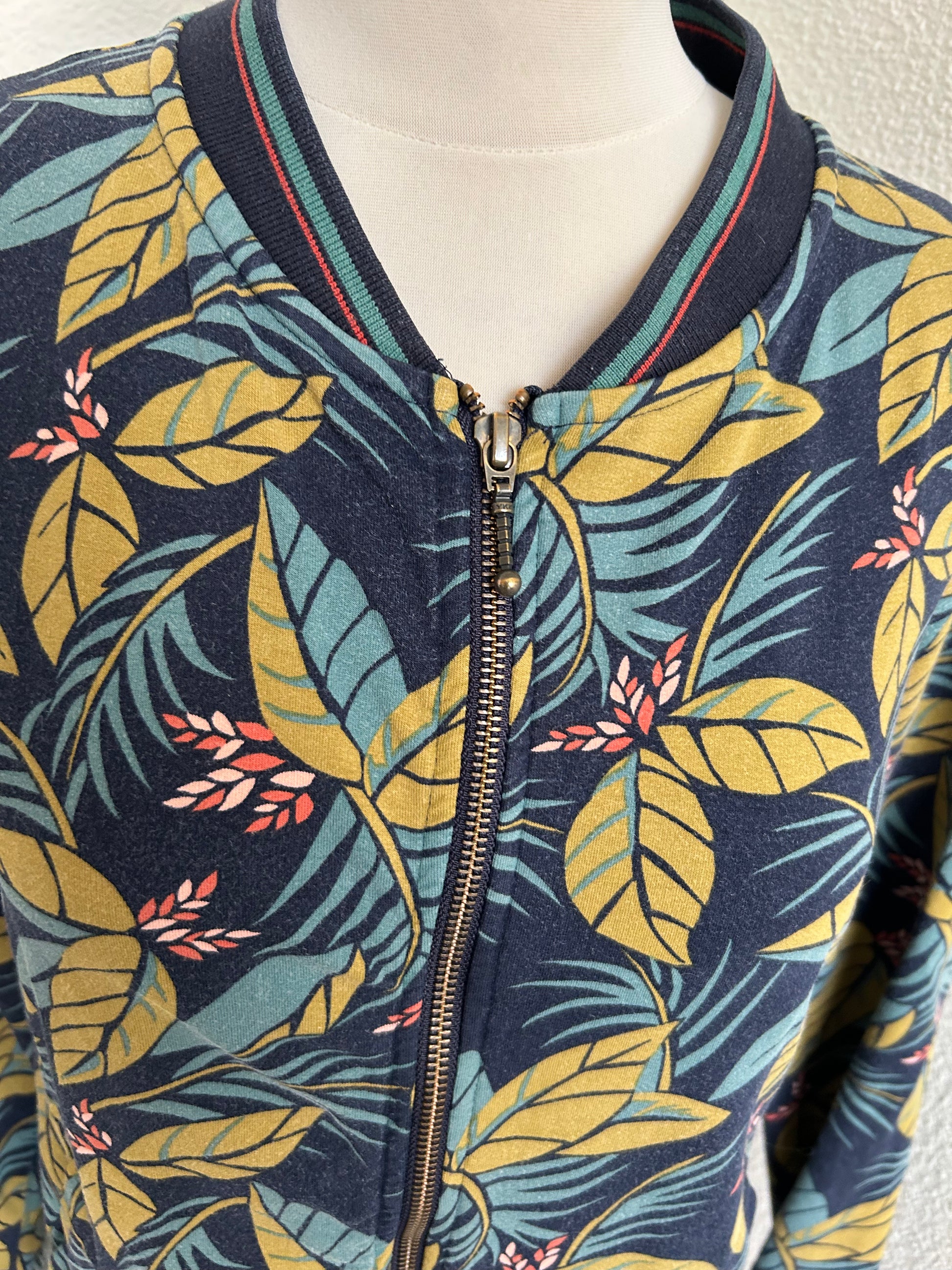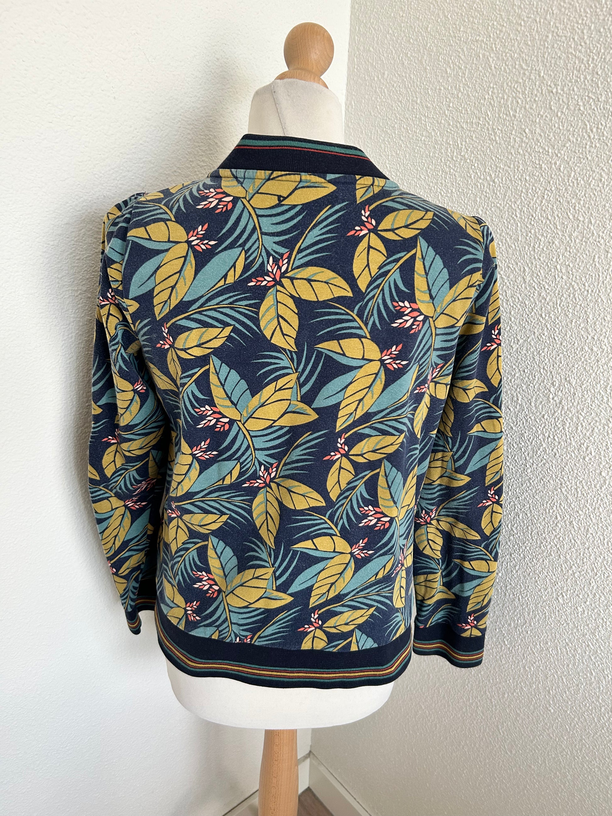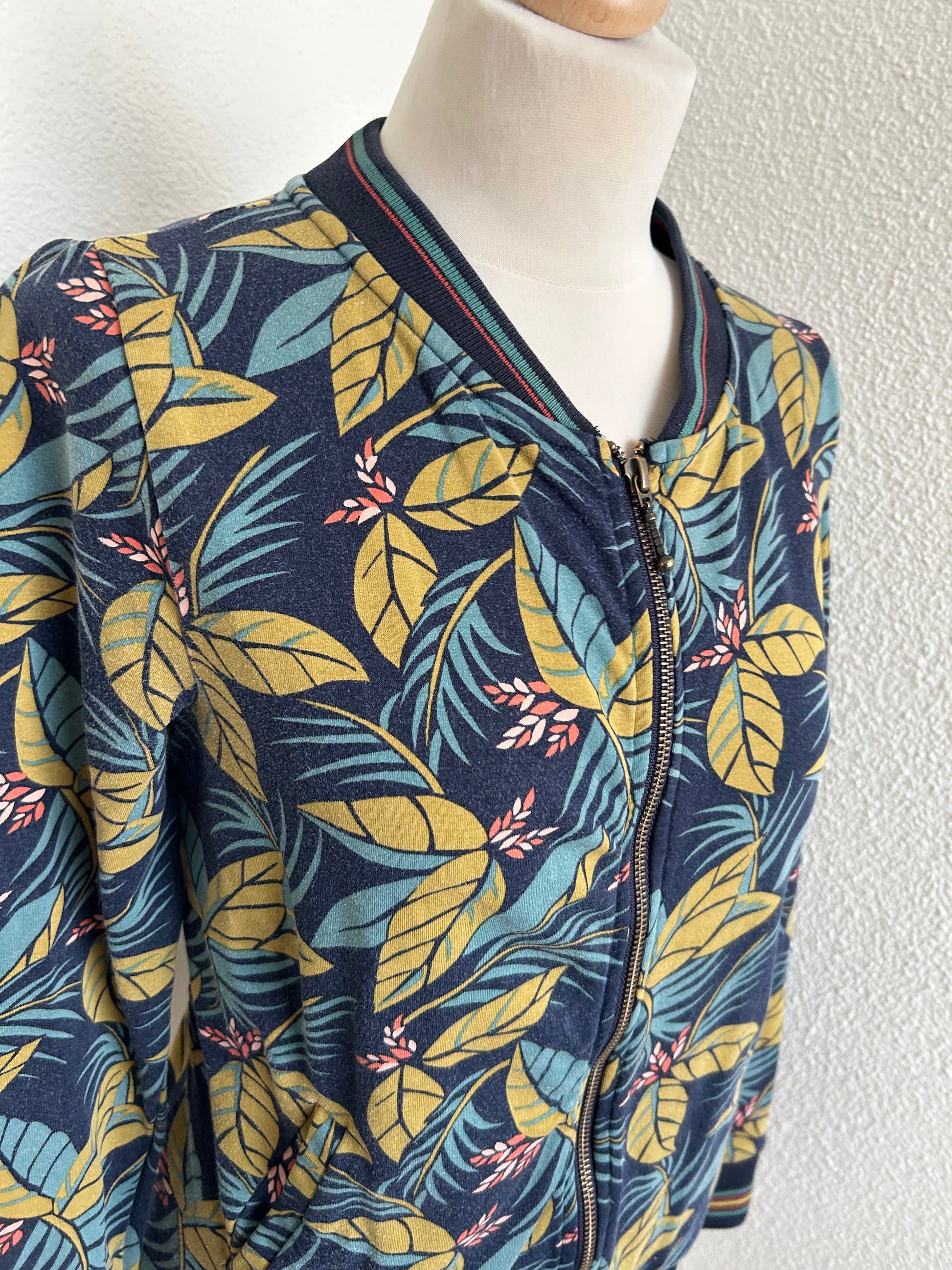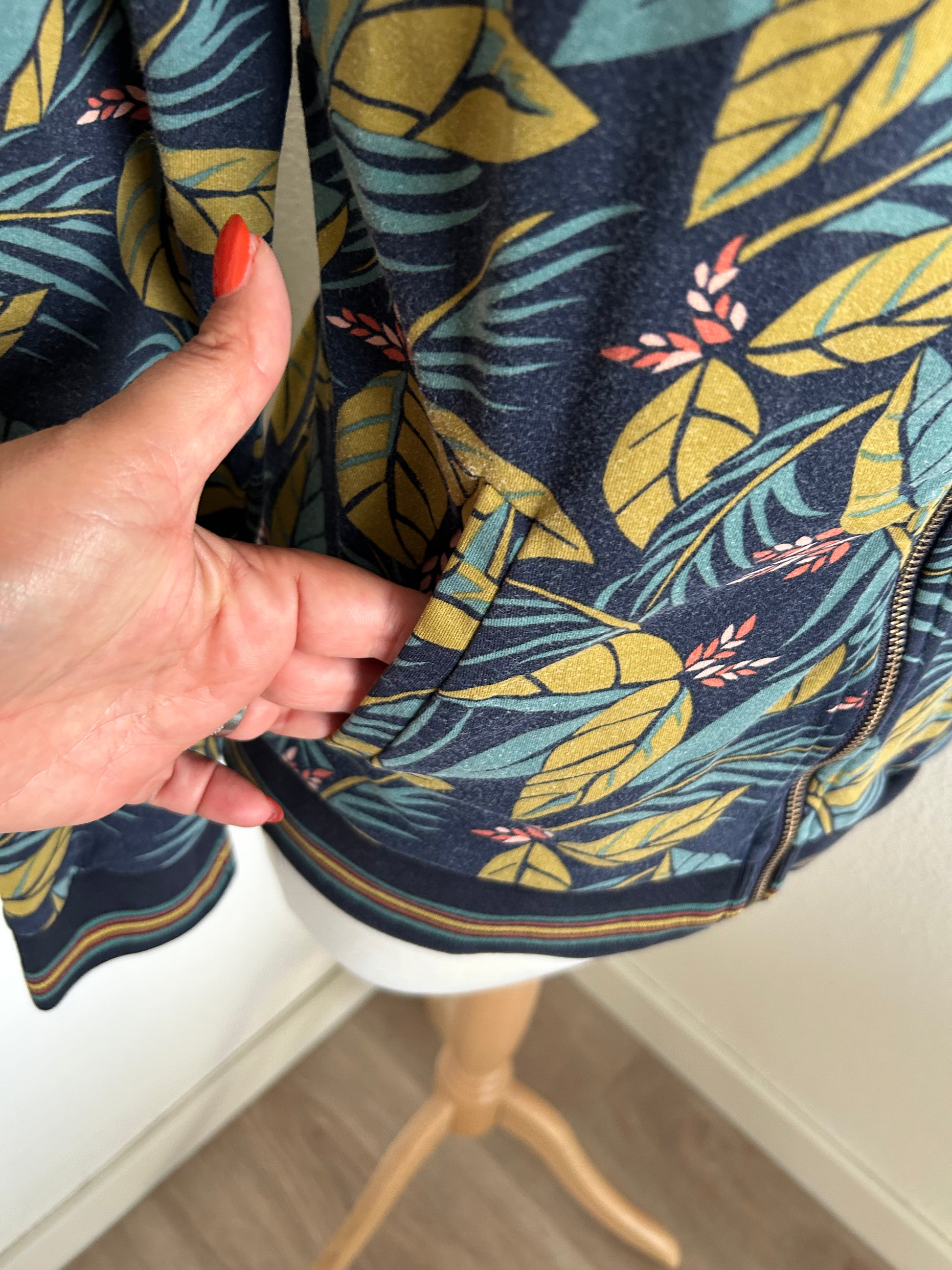 - Donkerblauw / marine blauw met groene en wijnrode tropische bladeren print