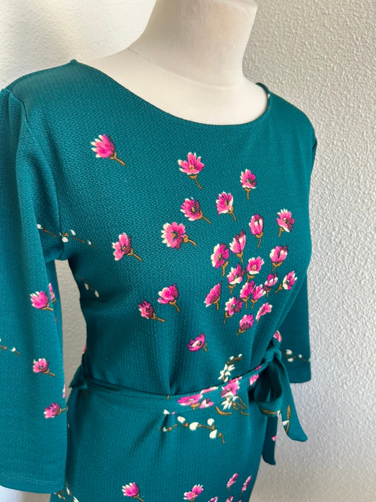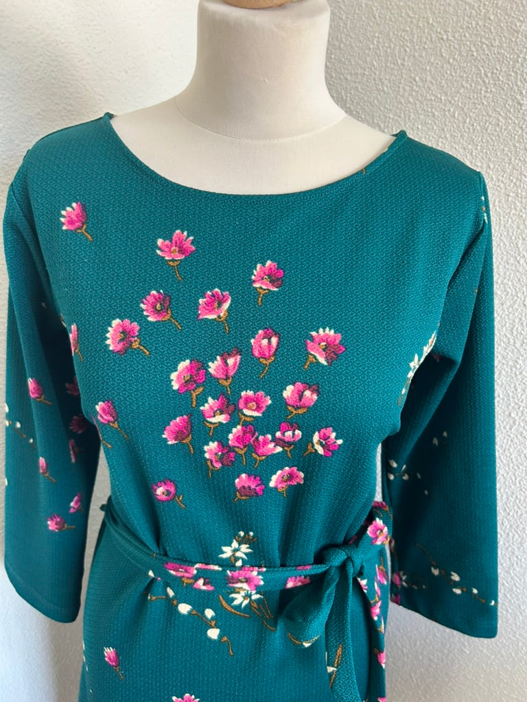 - Mooie boot-halslijn, lange mouwen, getailleerd met knooplintje rond het middel