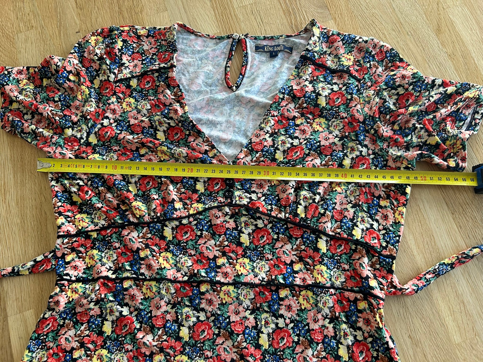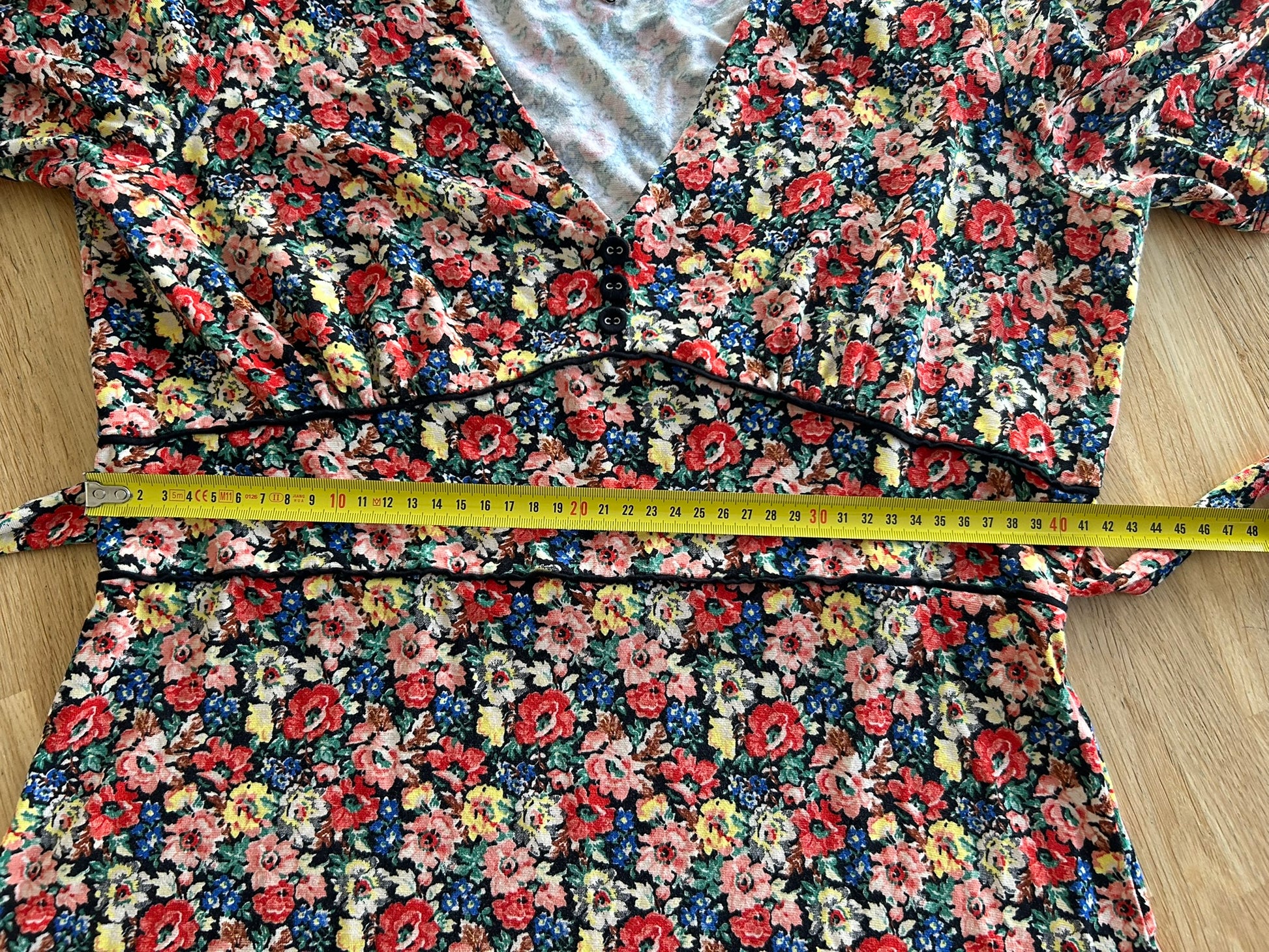 - Mooie v- halslijn met knoopjes op de borst, korte mouwen, getailleerd met tailleband en vaste striklinten op de rug