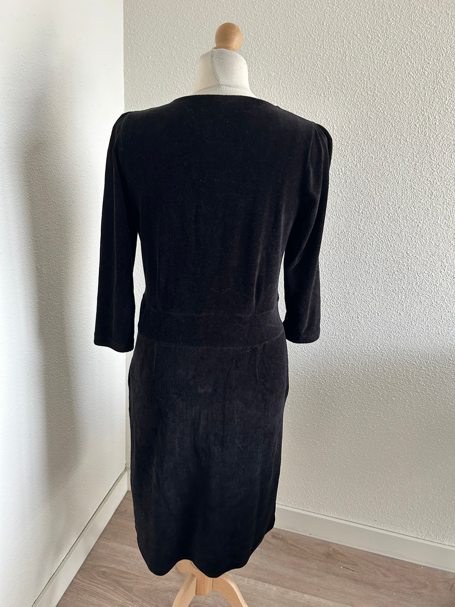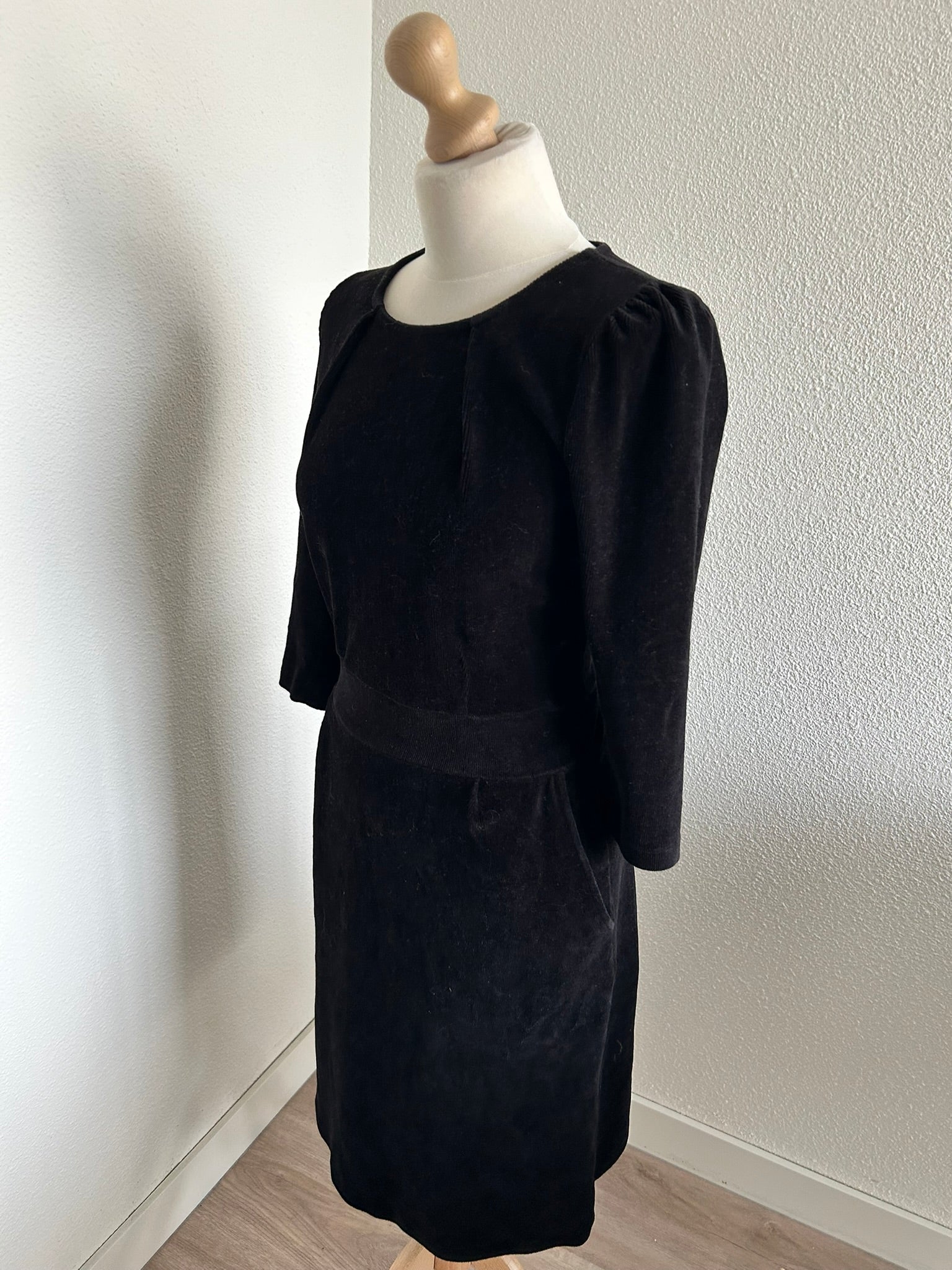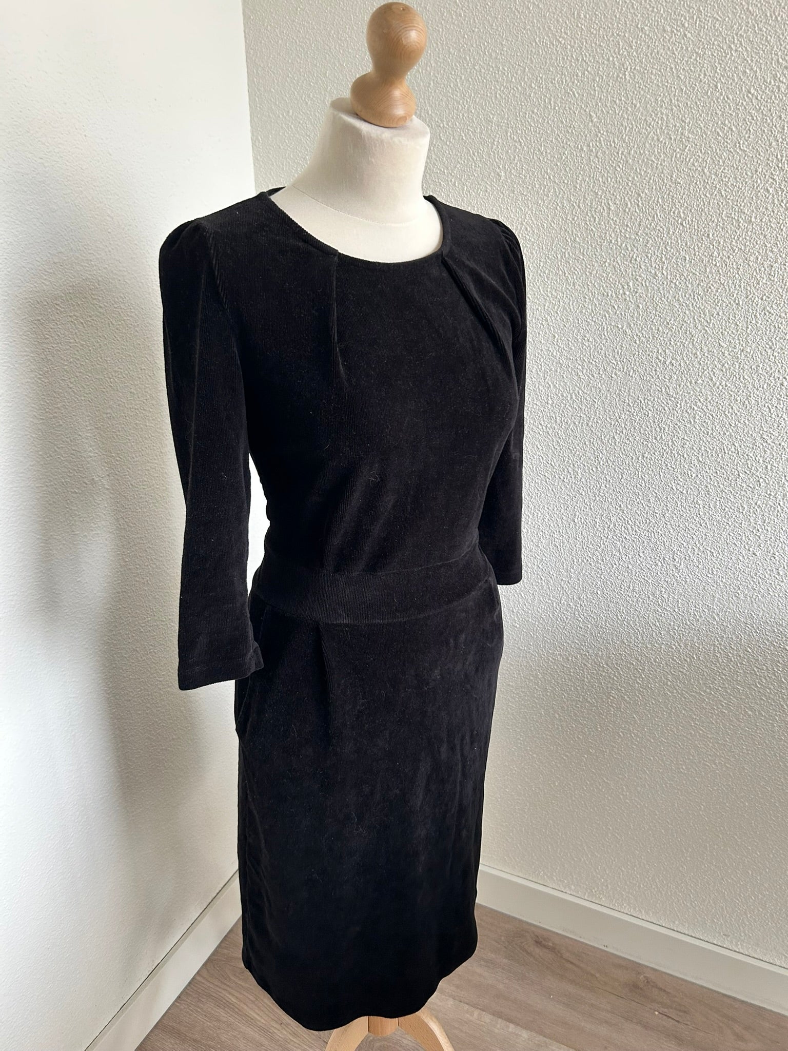 - Mooie ronde halslijn met plooien op de borst, lange mouwen, getailleerd door brede tailleband en steekzakken