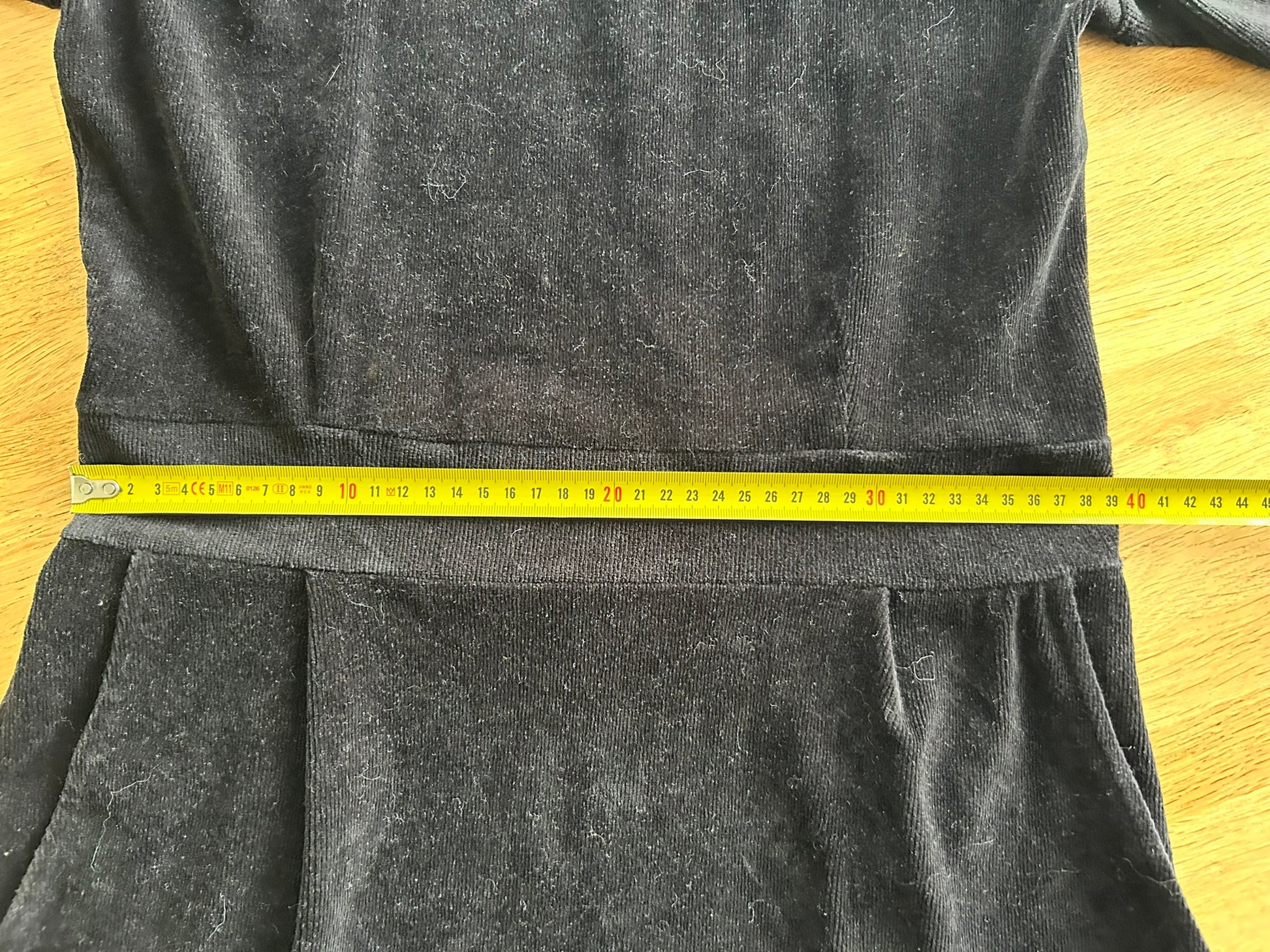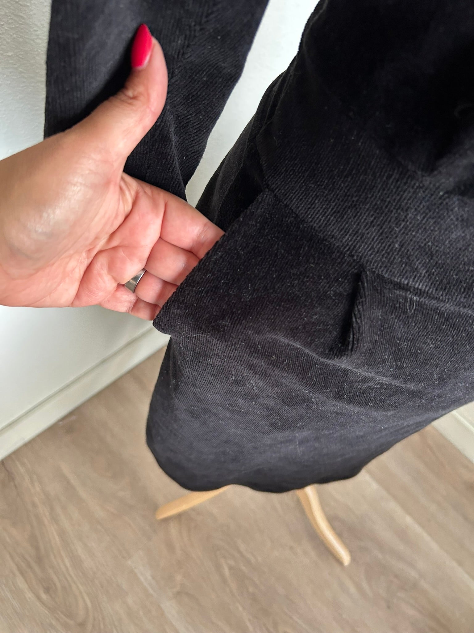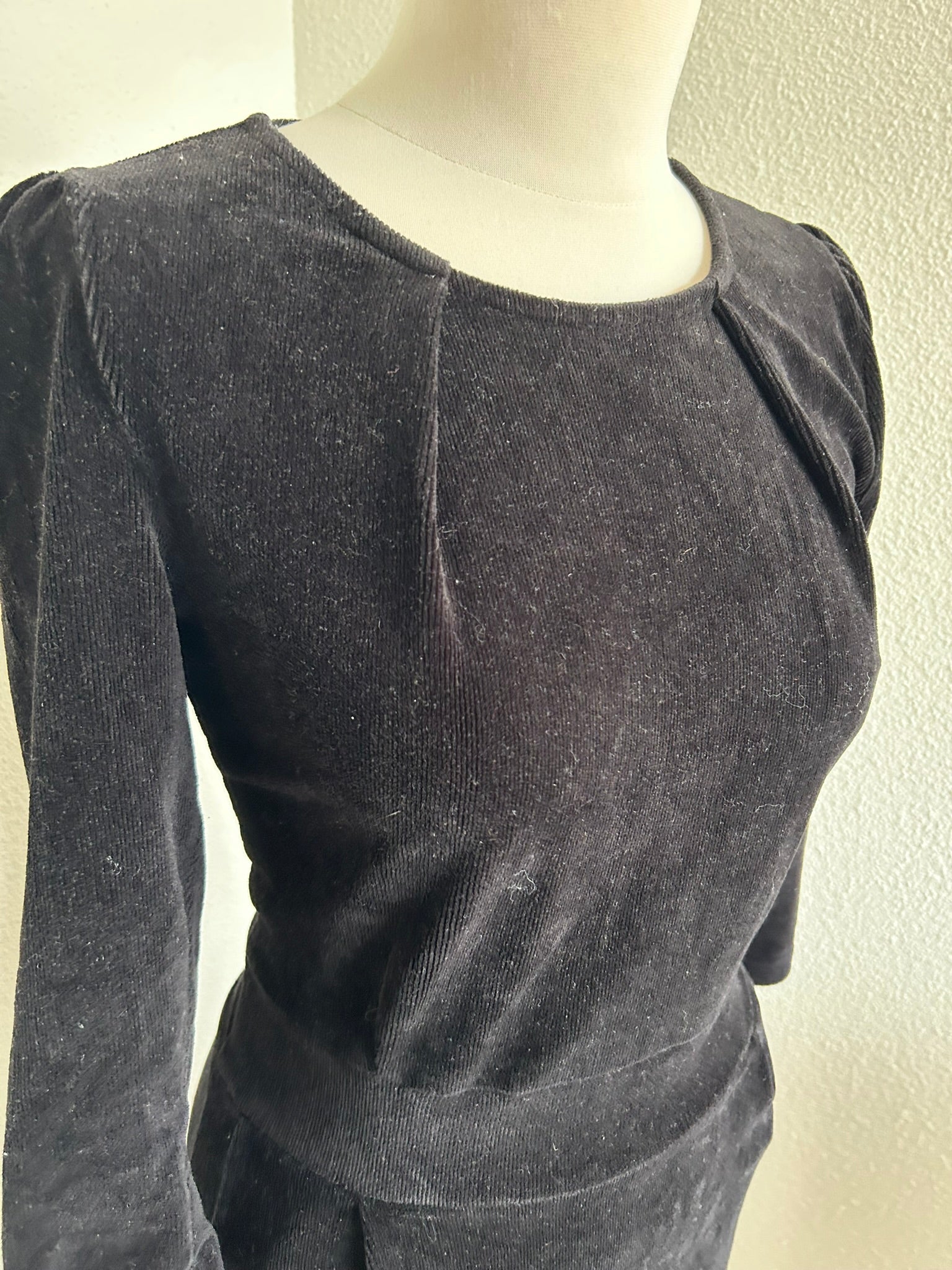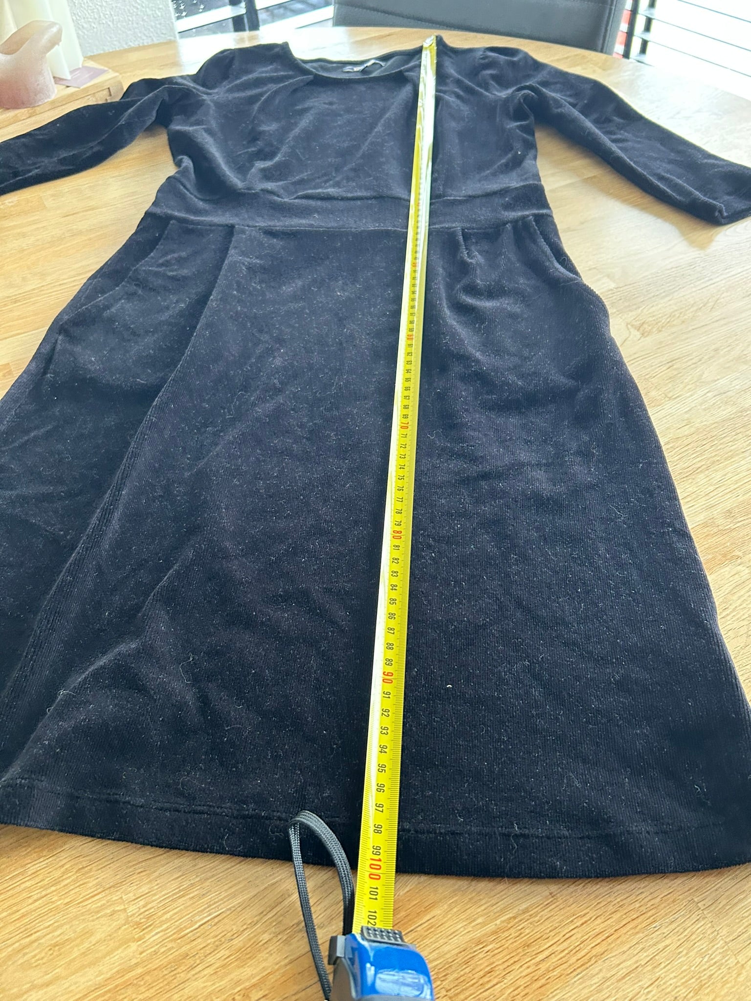 - Mooie ronde halslijn met plooien op de borst, lange mouwen, getailleerd door brede tailleband en steekzakken