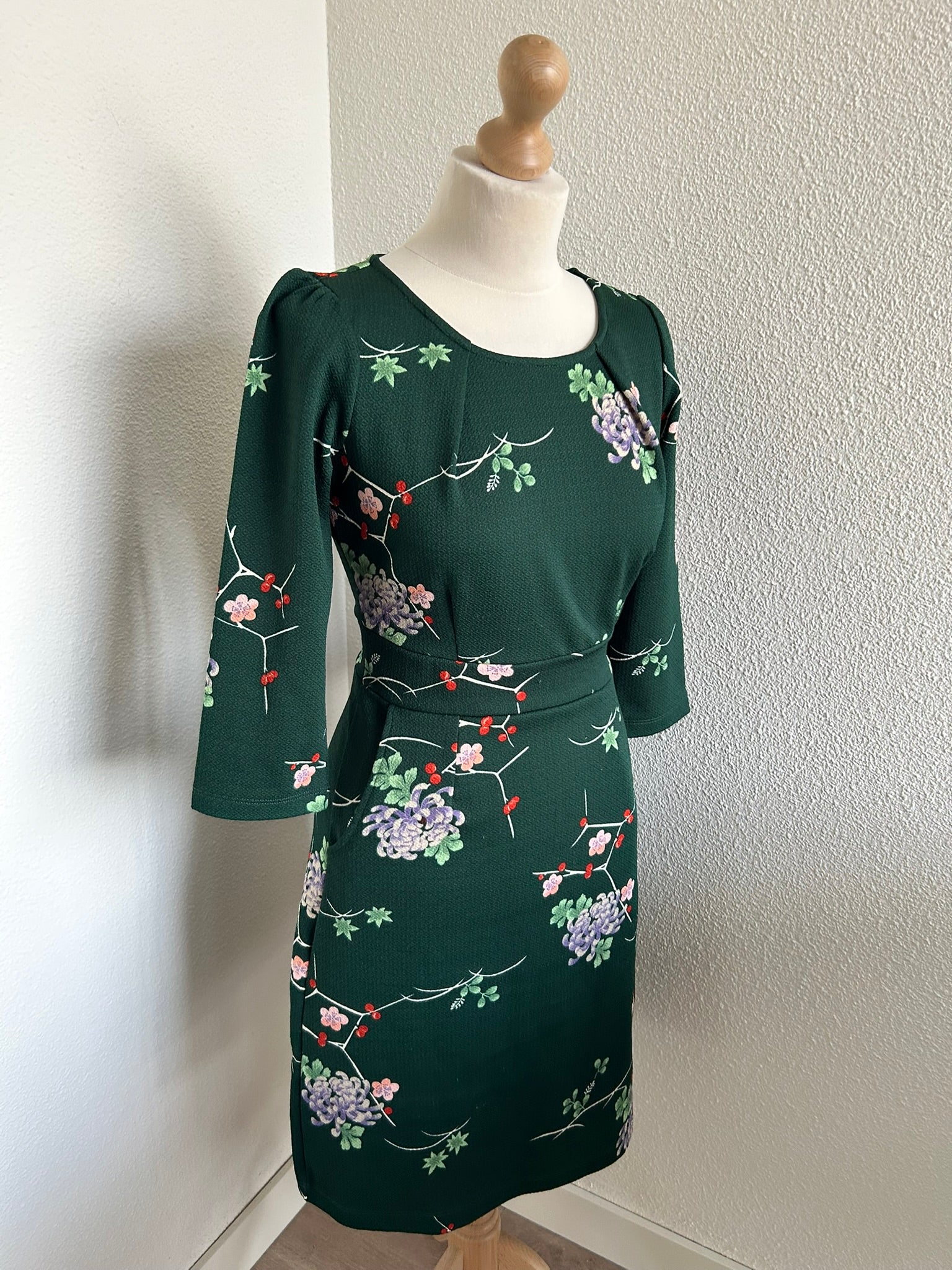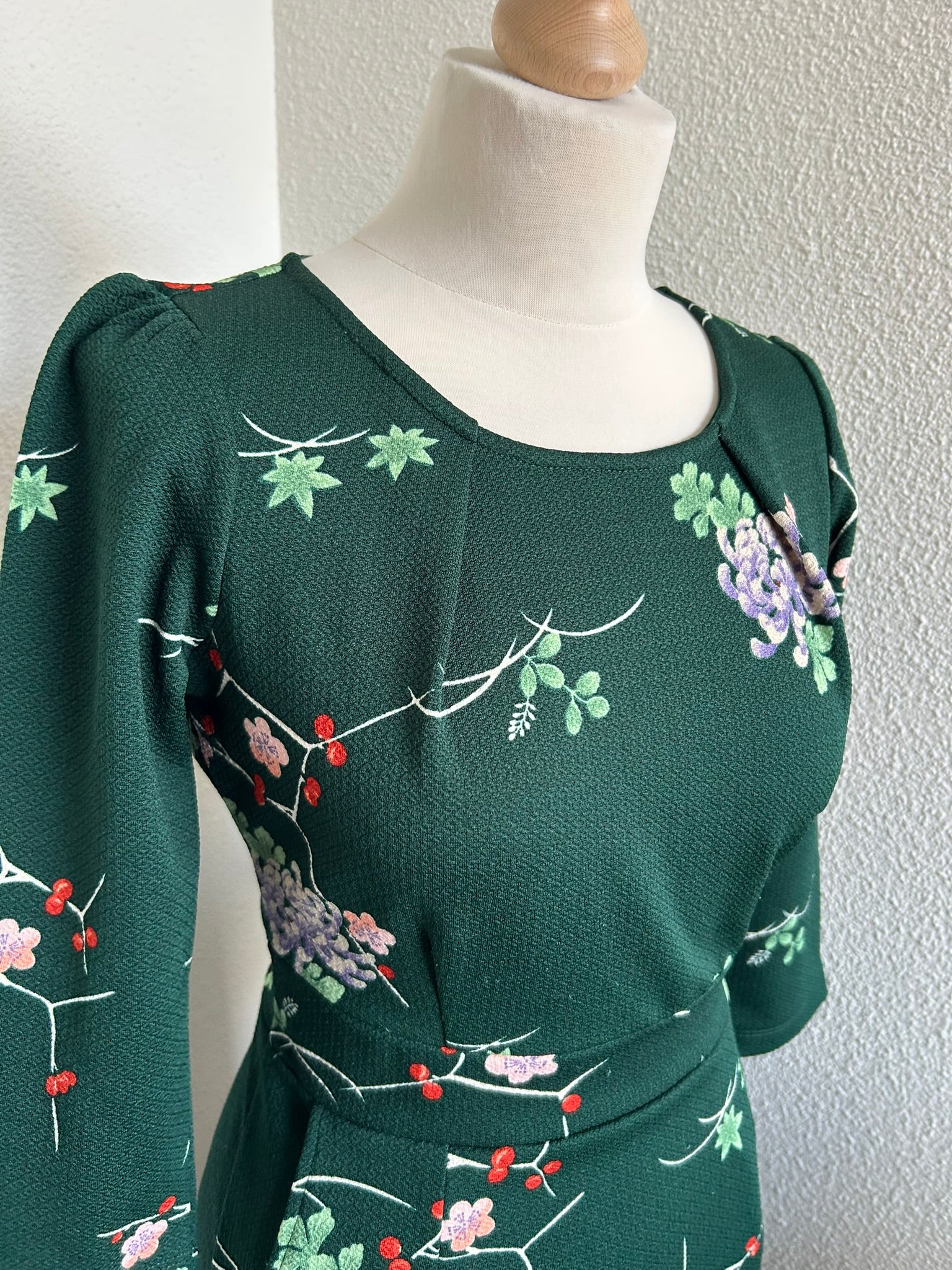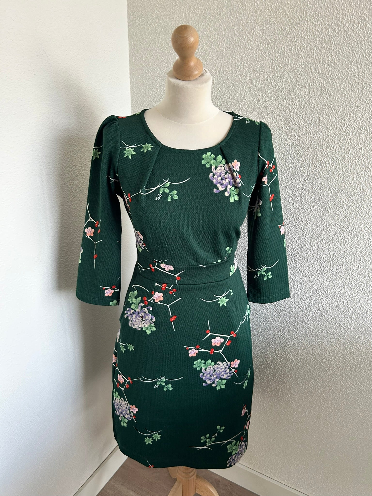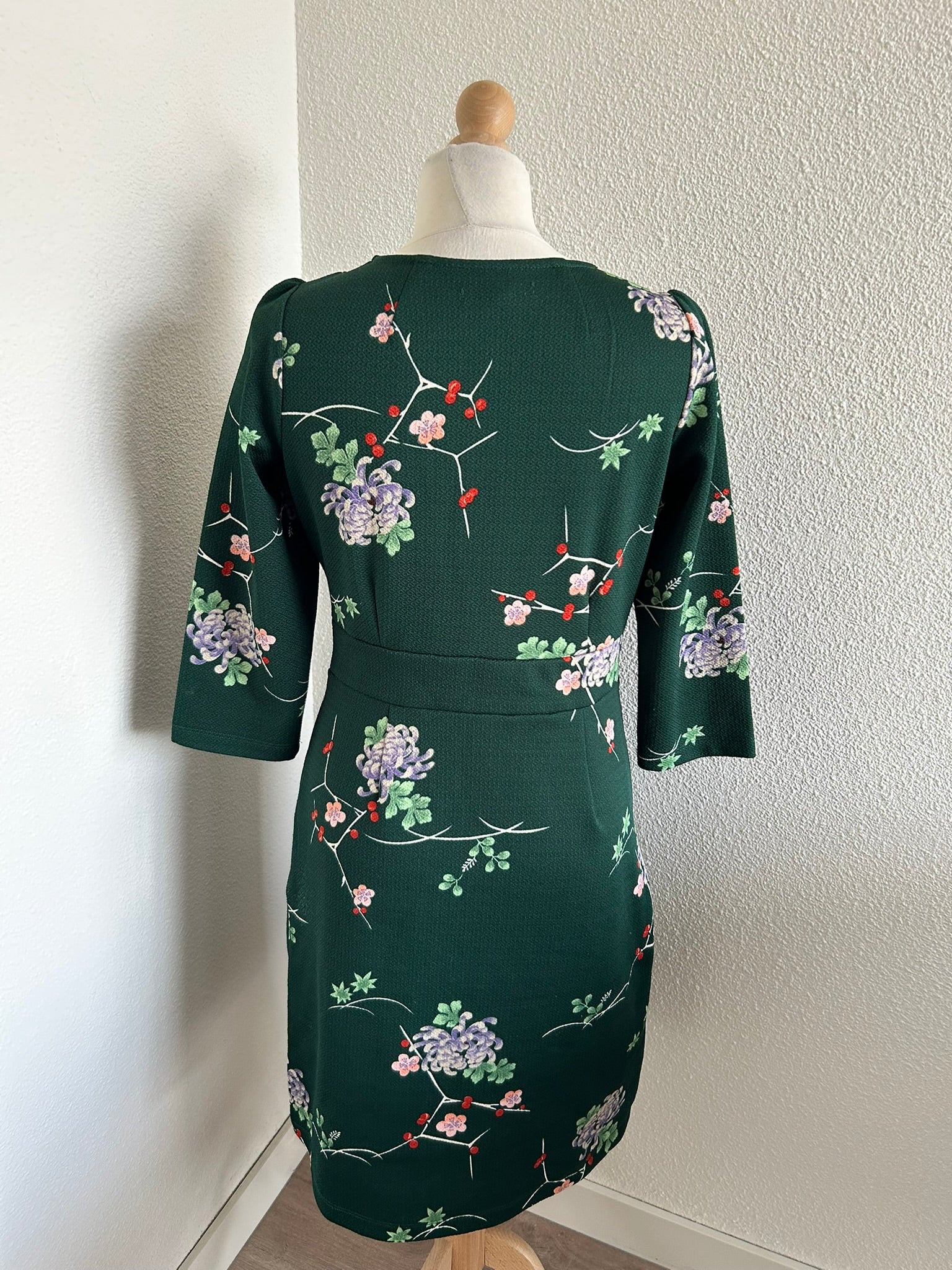 - Leuke jurk in donkergroen met bloemen print in blauw wit en paars rood roze