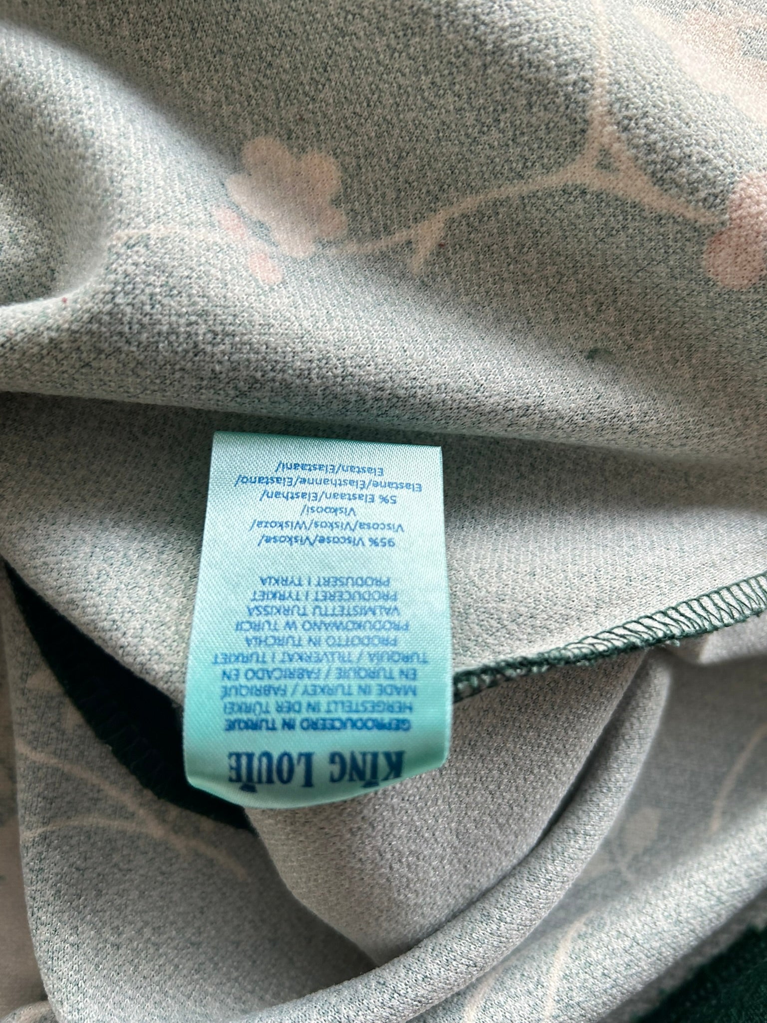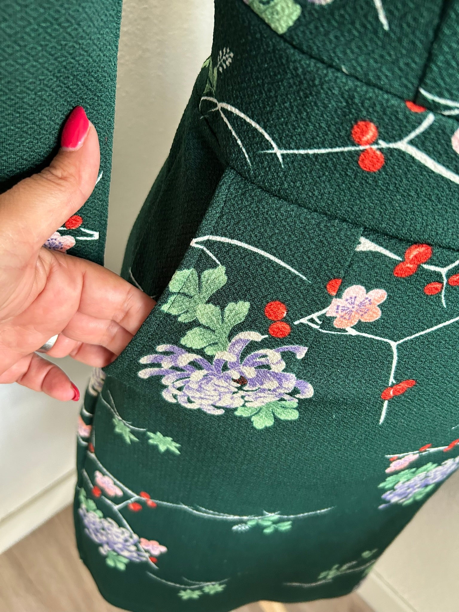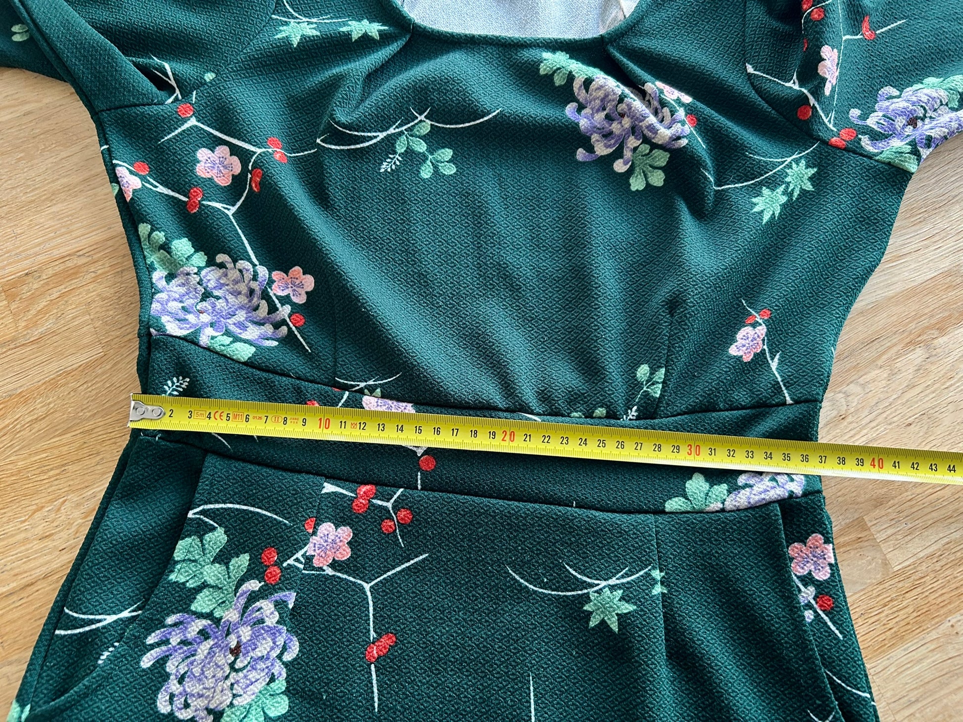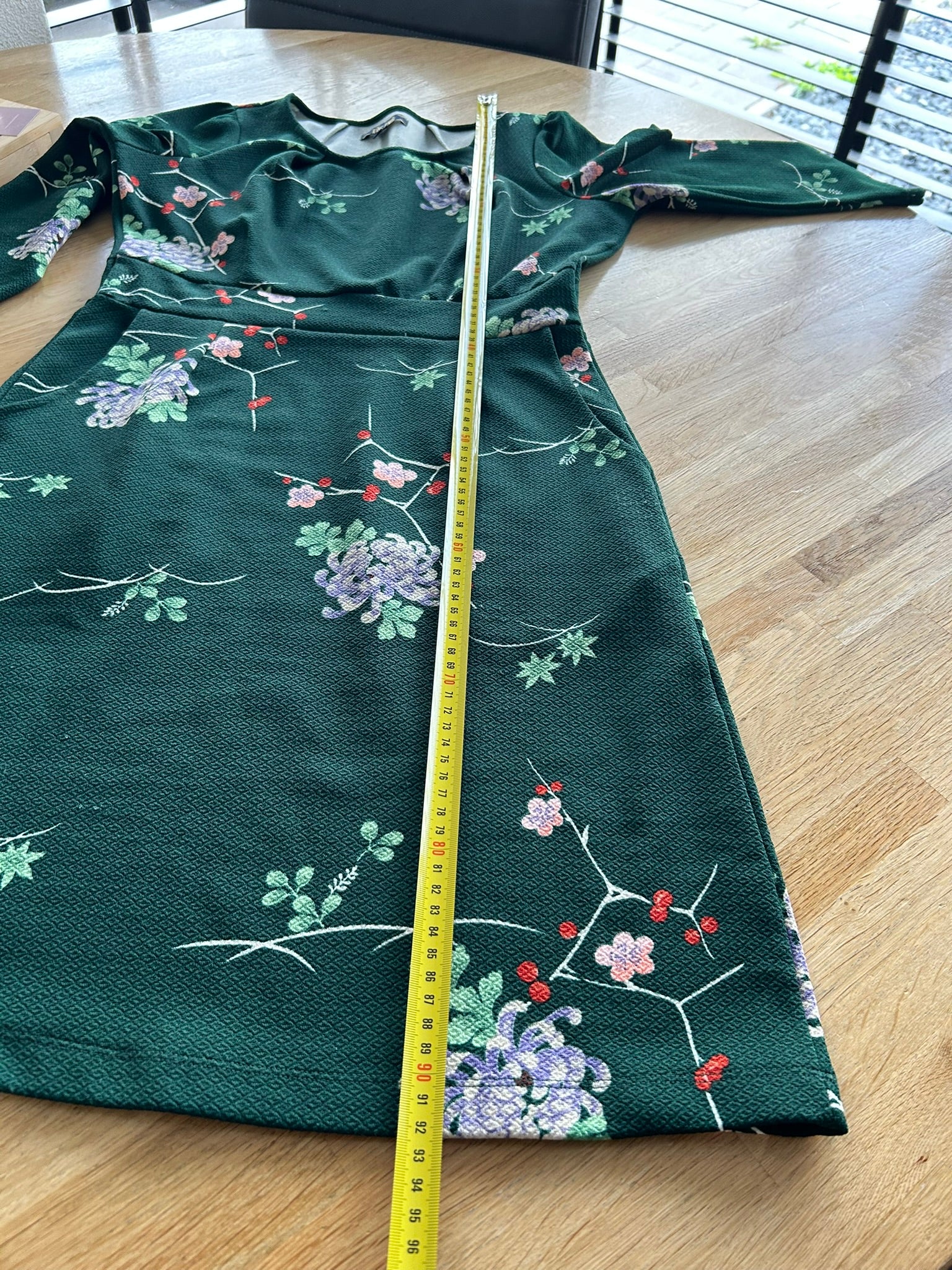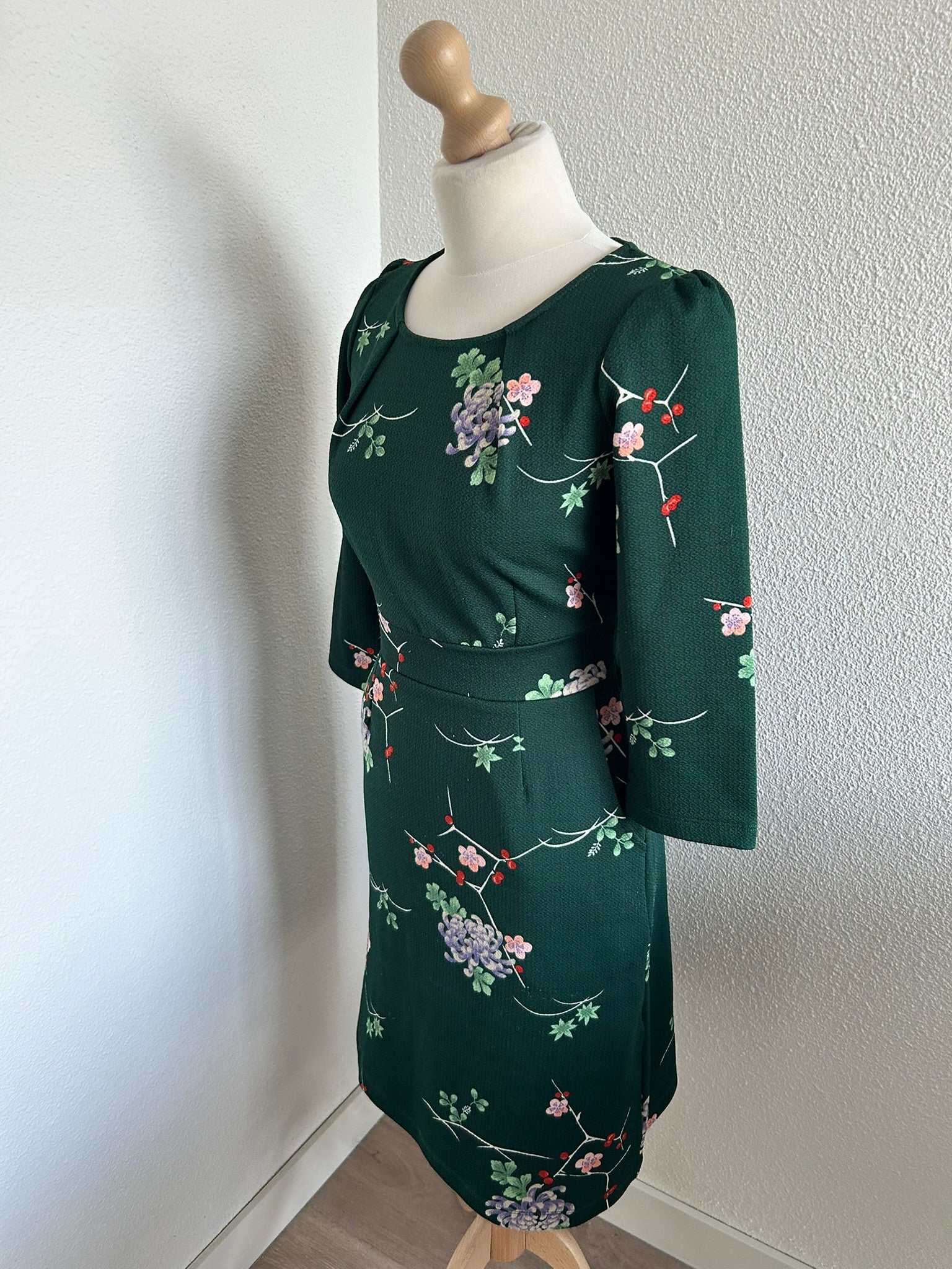 - Leuke jurk in donkergroen met bloemen print in blauw wit en paars rood roze