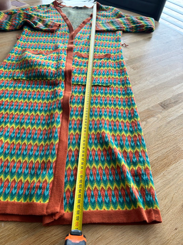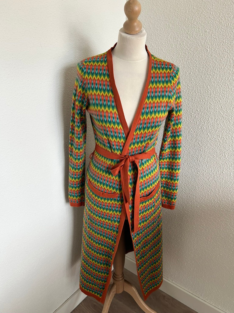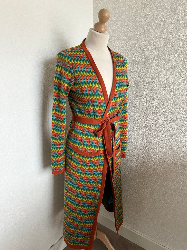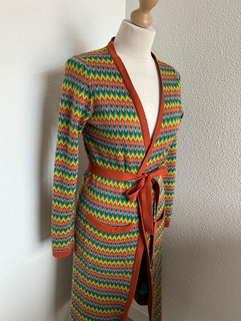 - Mooie v- halslijn, lange mouwen, getailleerd met knooplint rond het middel, steekzakken