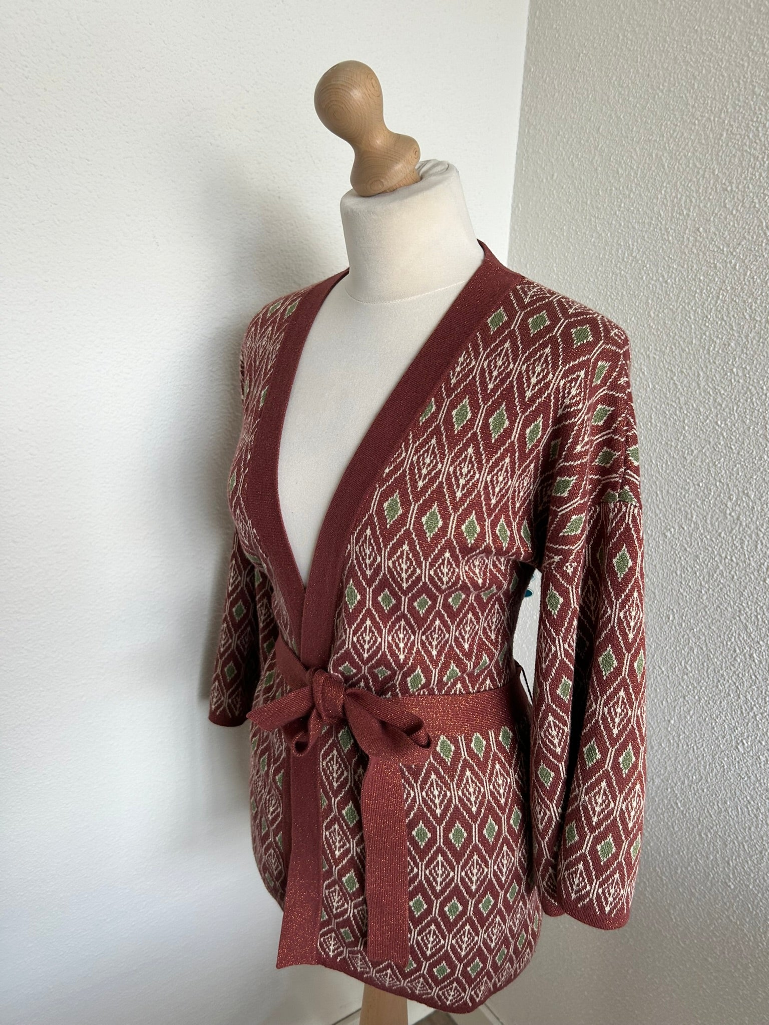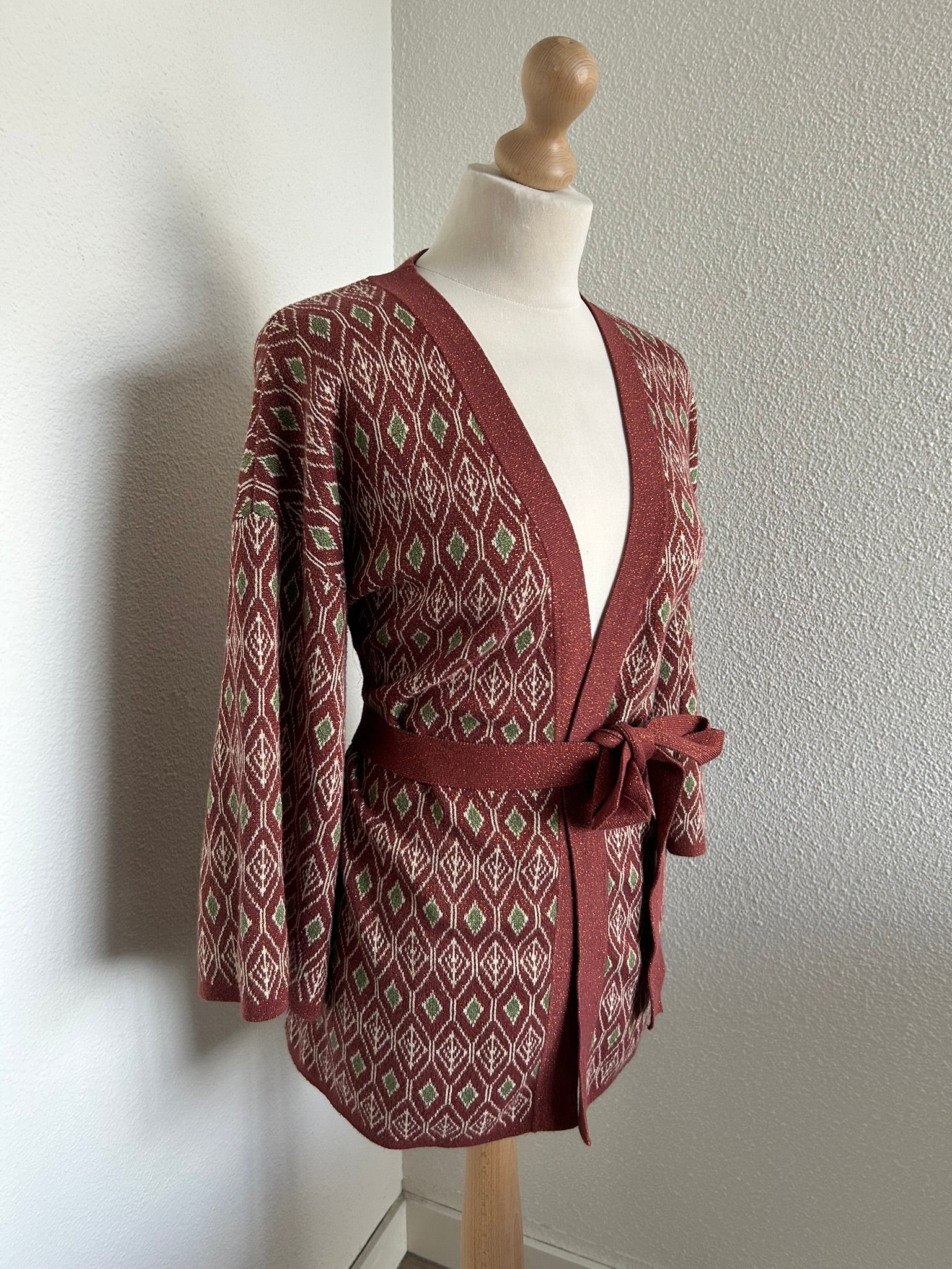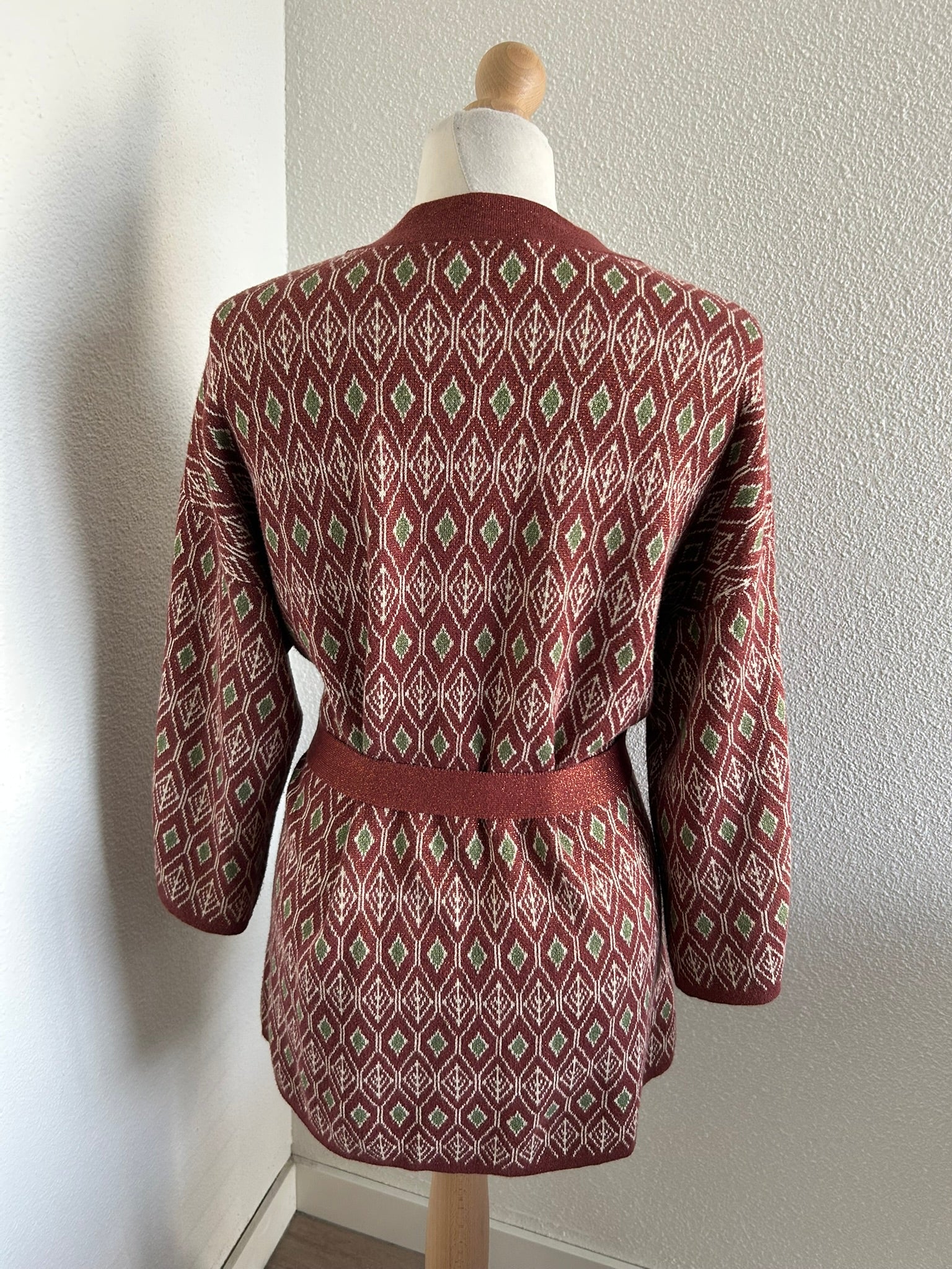 - Leuk vest met glitter allo-over in roestbruin, karamel met creme wit en groene beetje geruit retro patroon