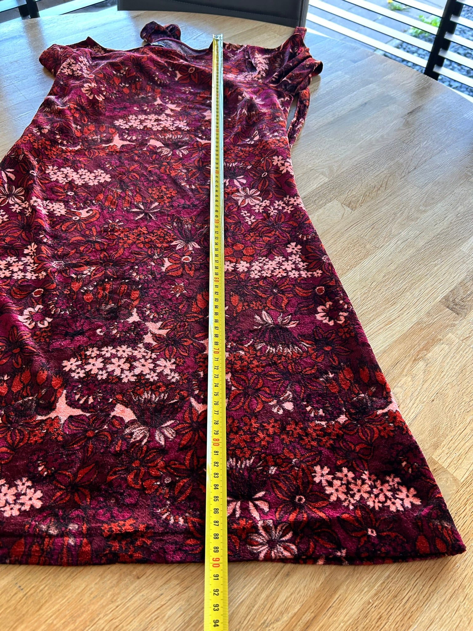 - Leuke jurk in wijnrood/donkerrood met rode paarse en roze bloemen retro print
