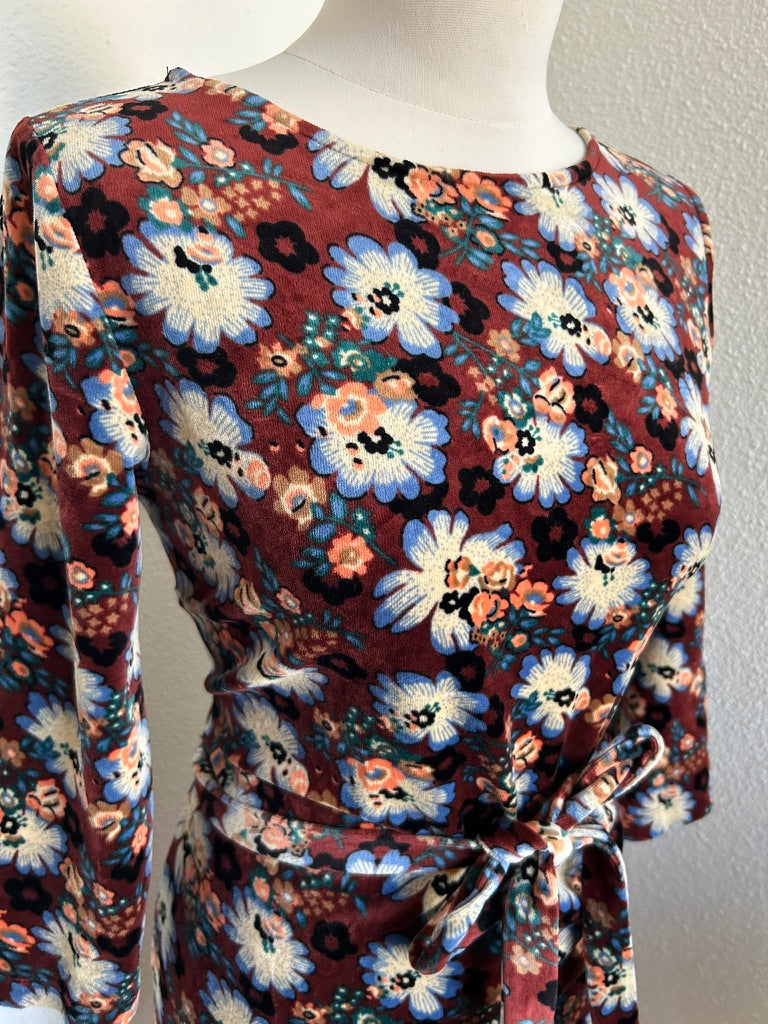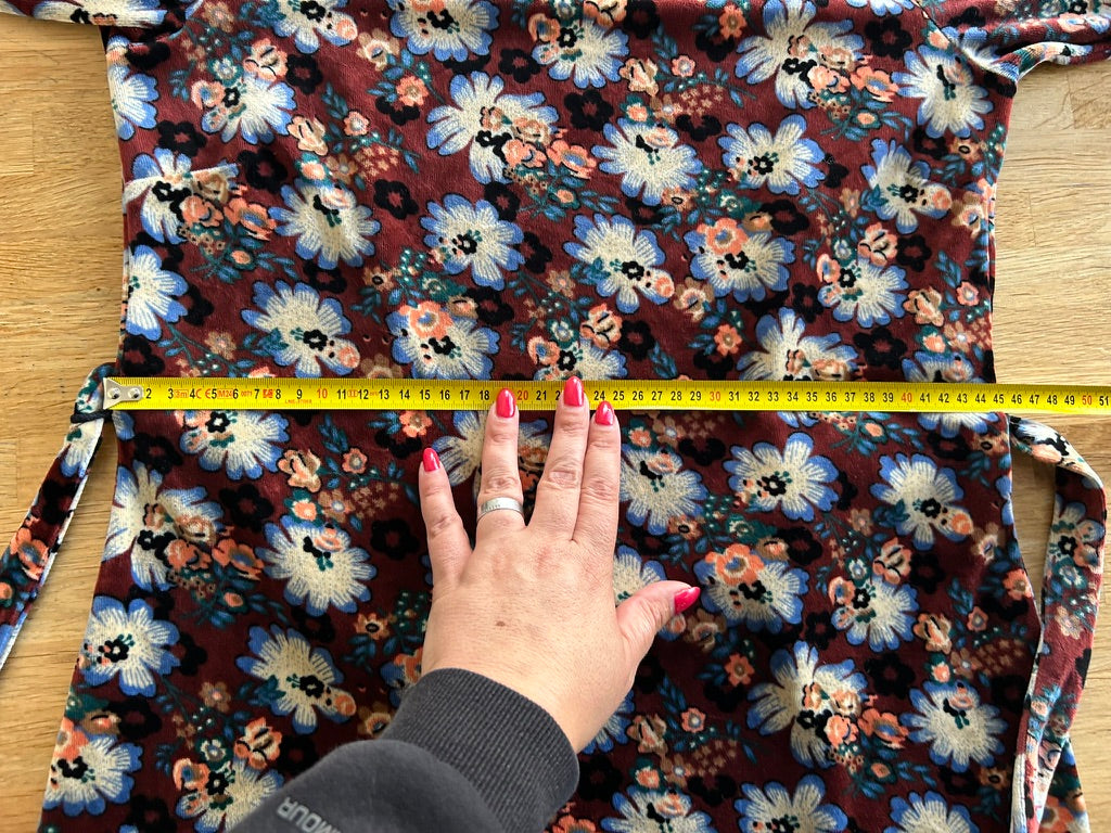 - Leuke jurk in bruin met witte blauwe oranje en zwarte retro bloemen print