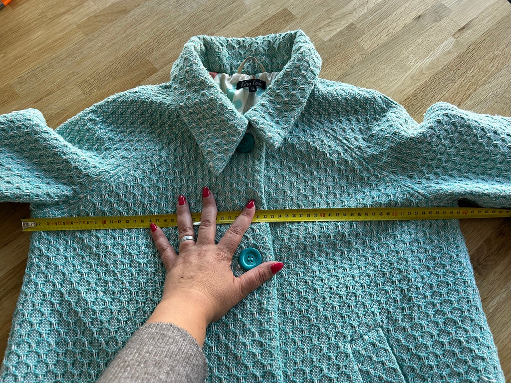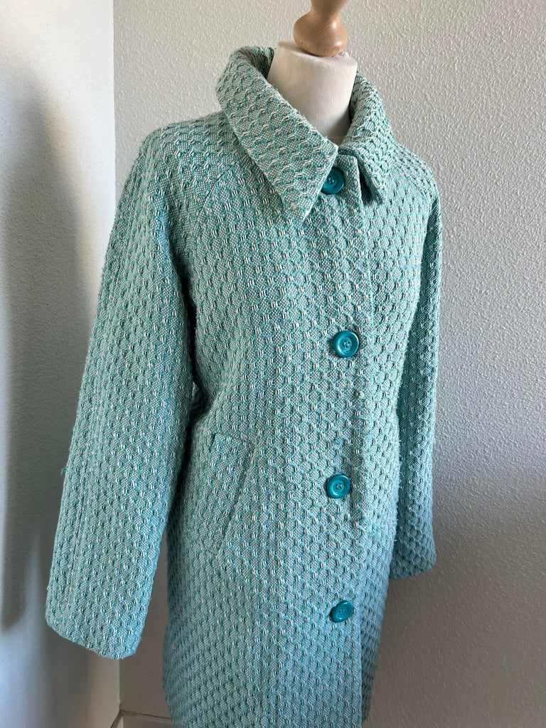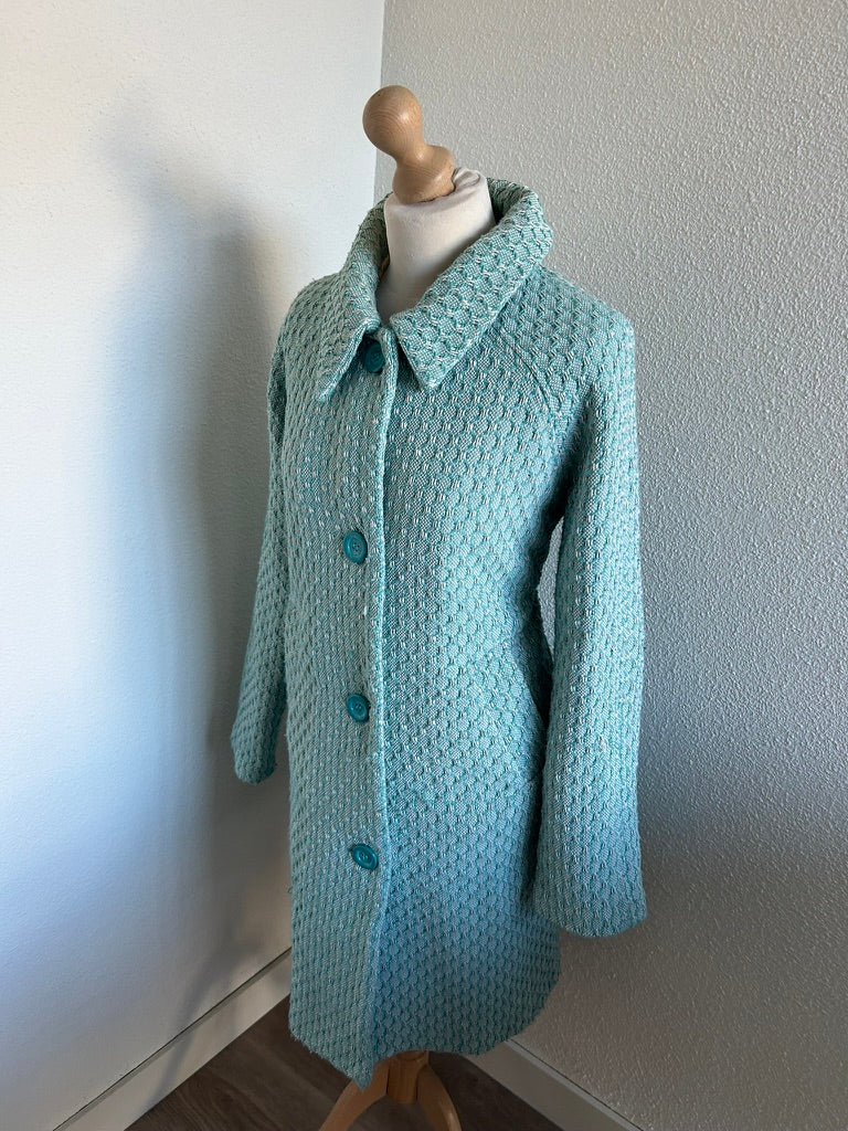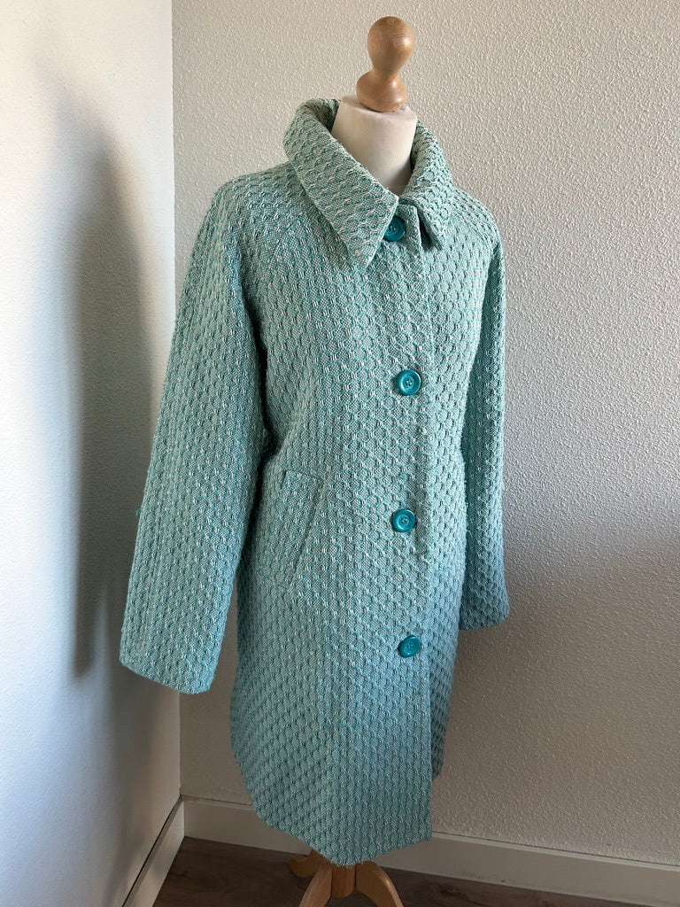 - Mooie halslijn met kraagje, rij grote retro knopen, steekzakken, middellang model
