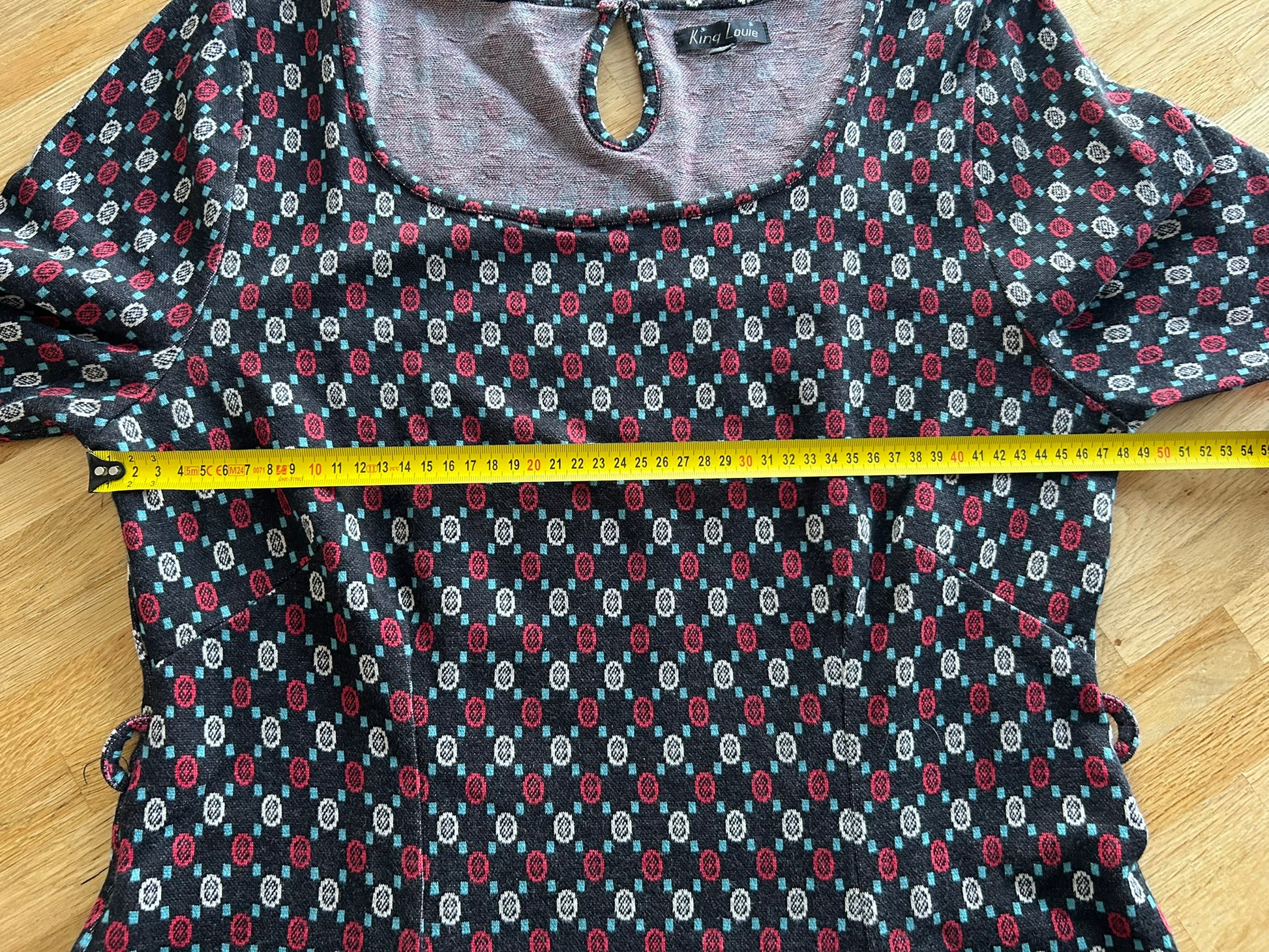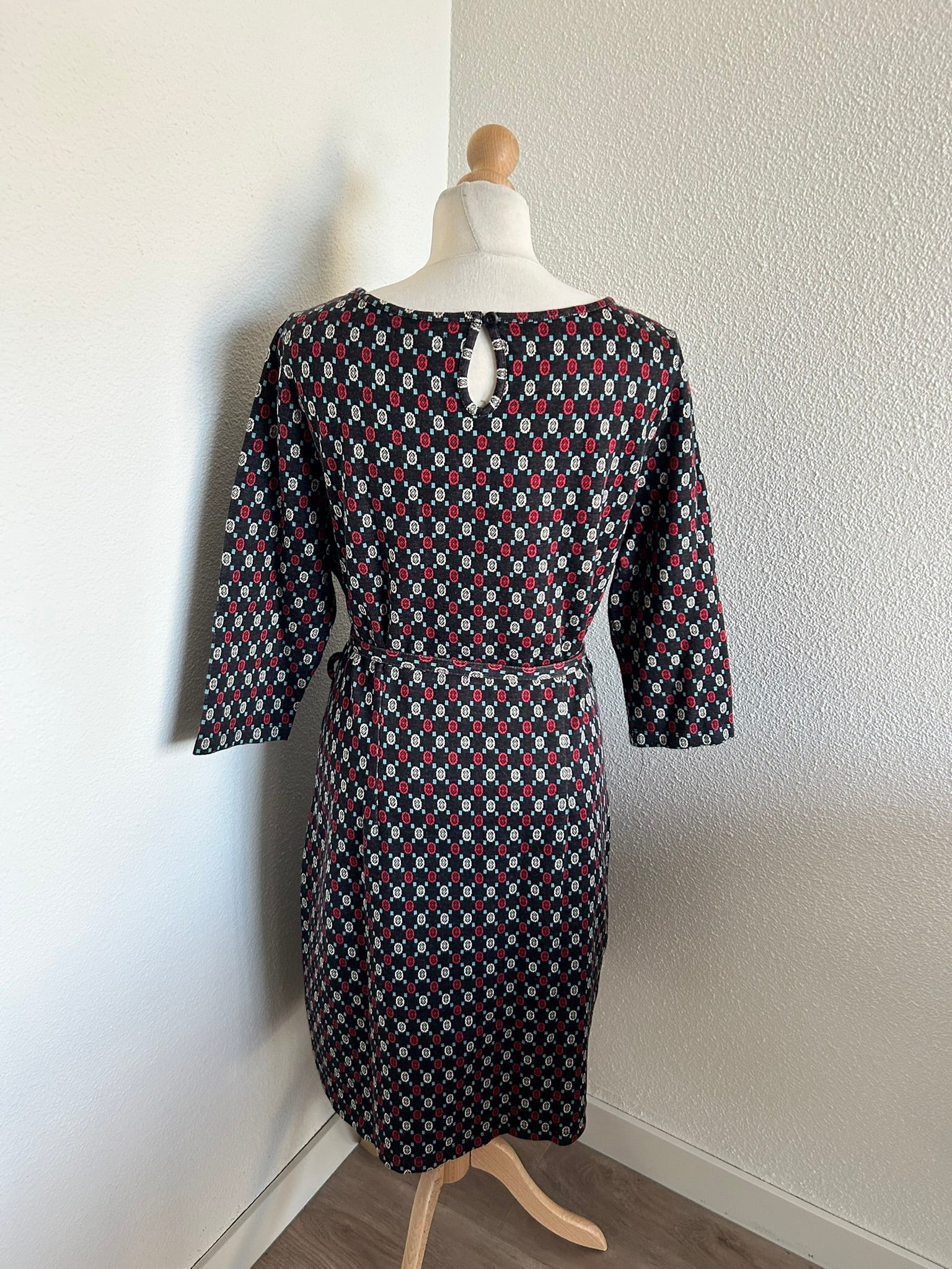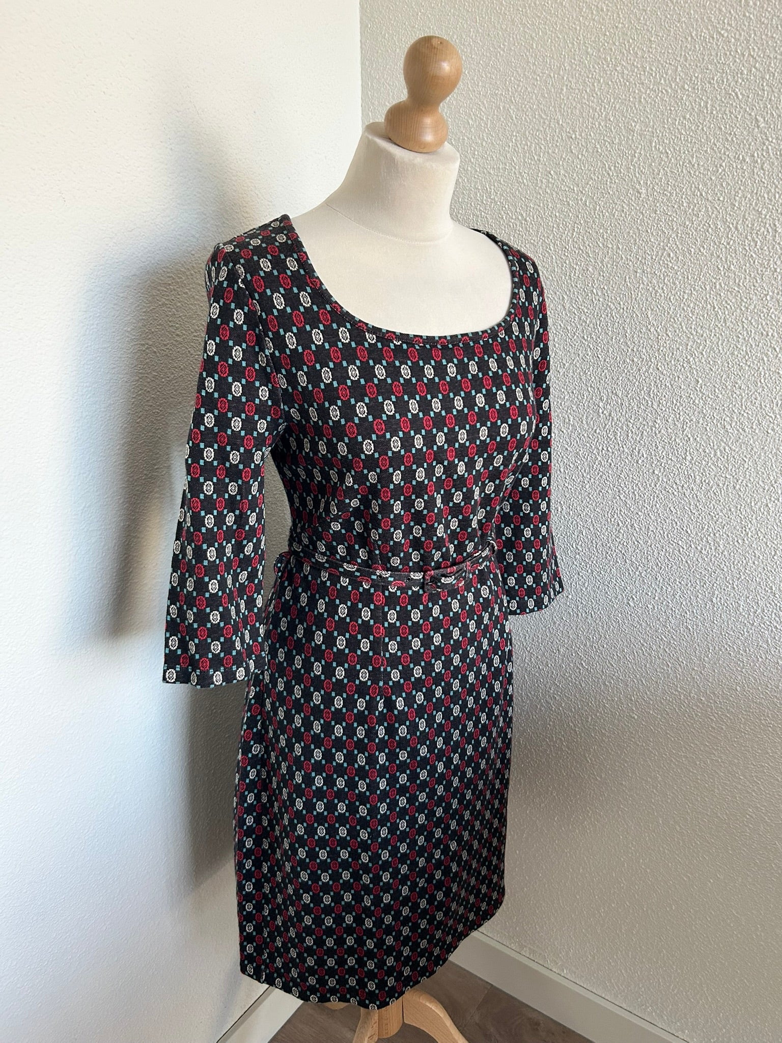 - Mooie ronde halslijn, lockhole met knoopje in de nek, 3/4 mouwen, getailleerd met riempje