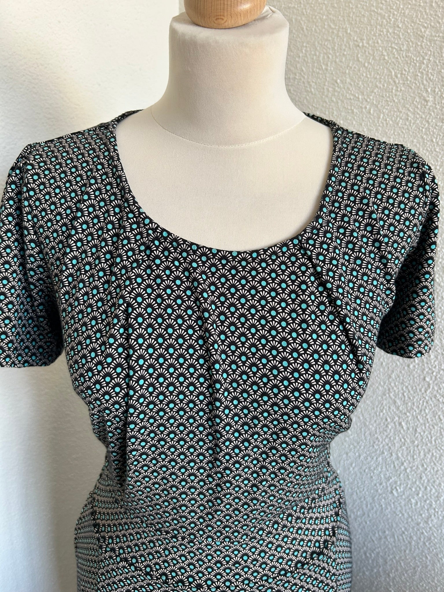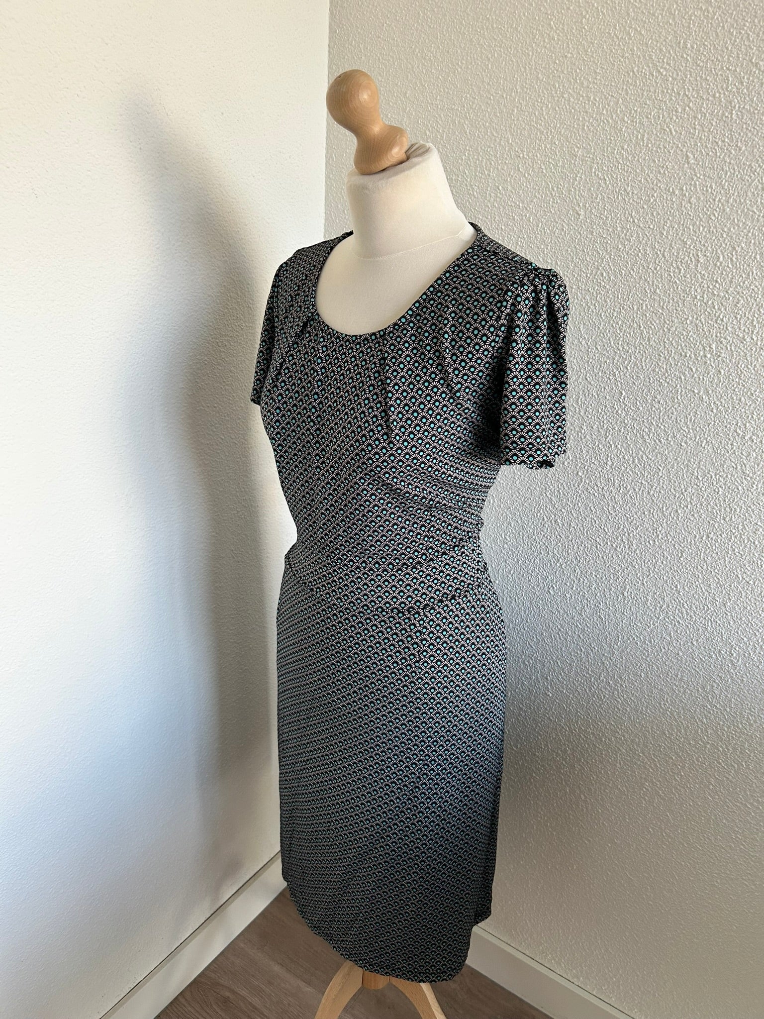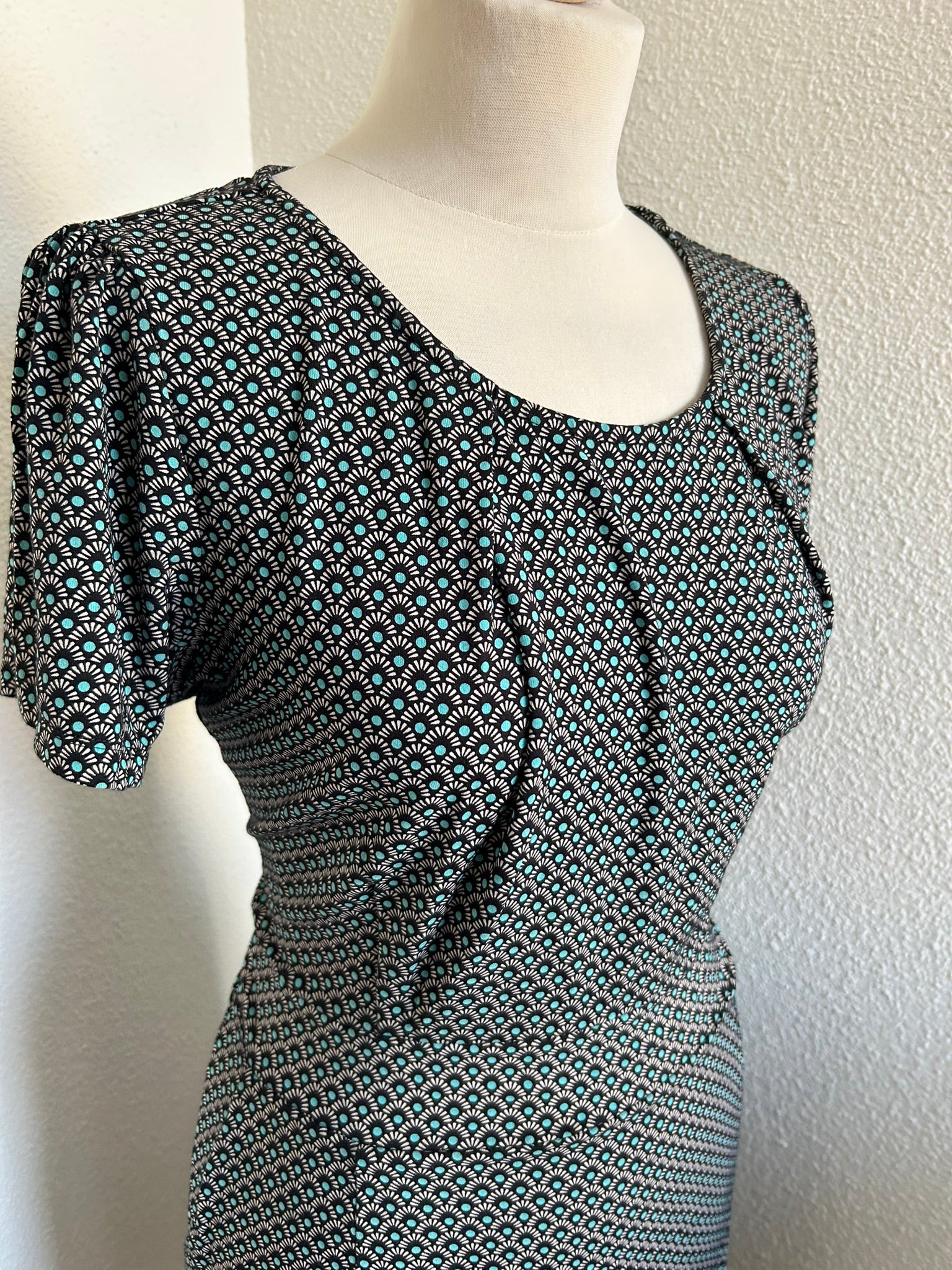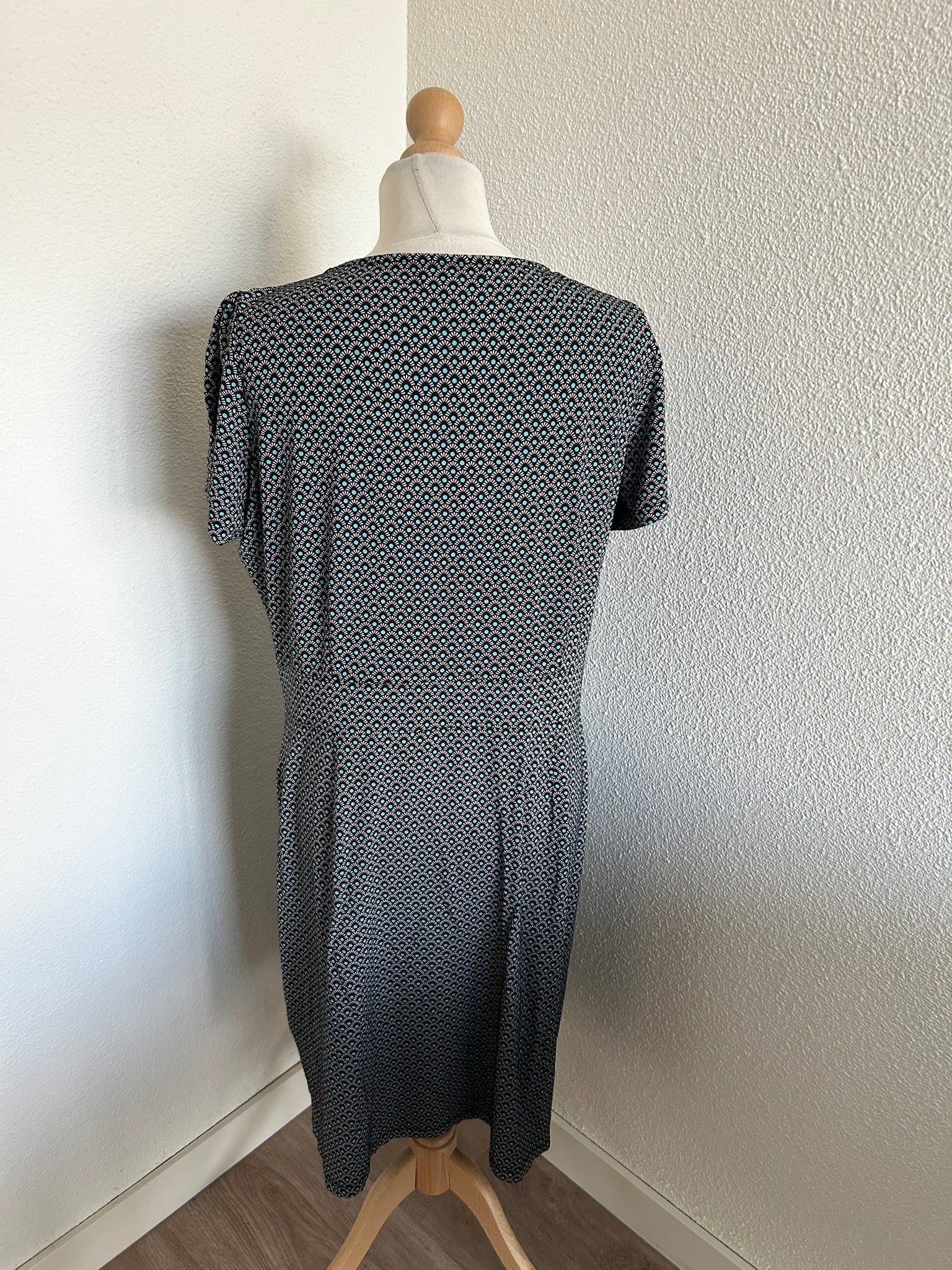 - Leuke jurk met retro print in zwart wit en turquoise blauw