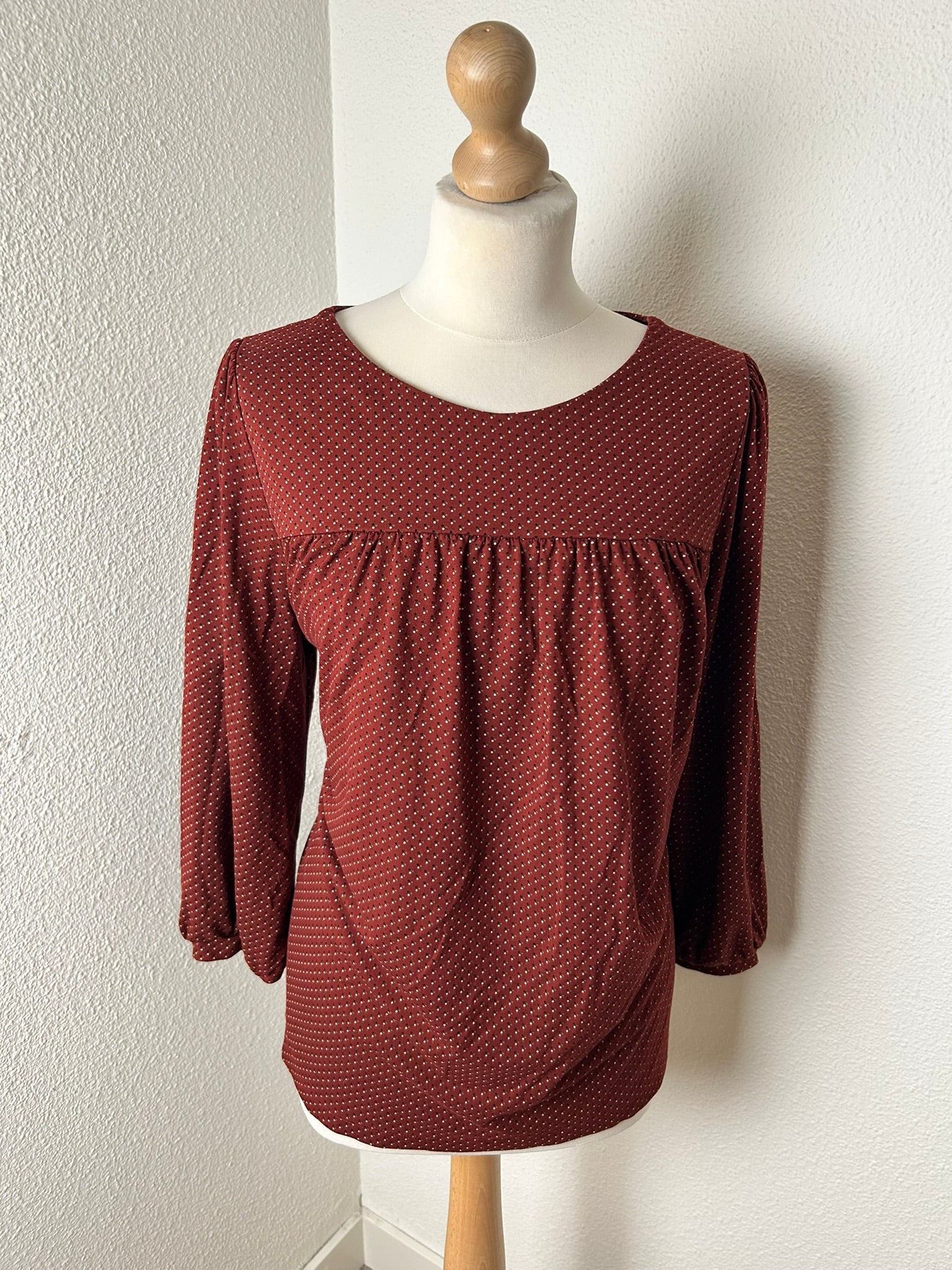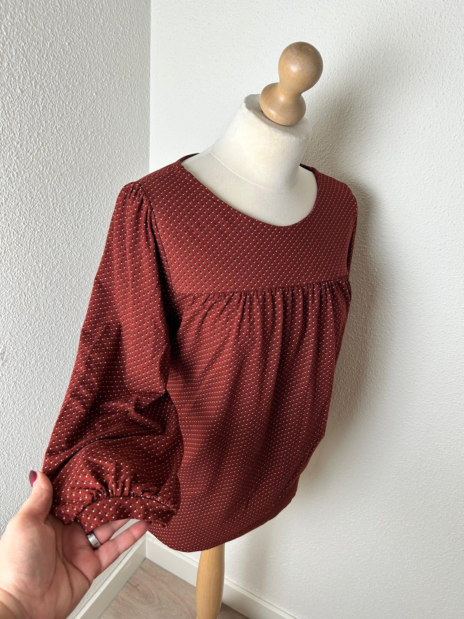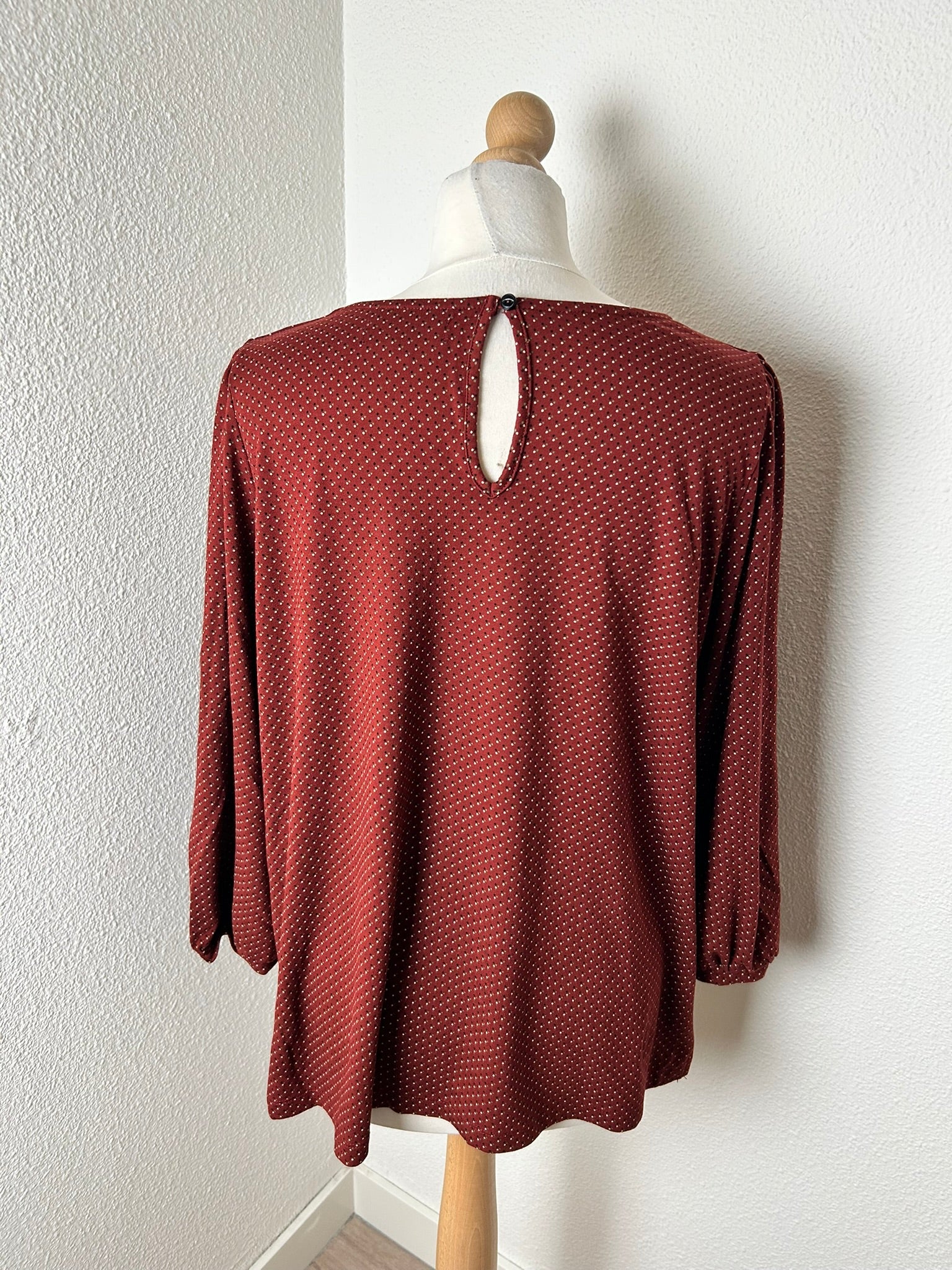 - Mooie ronde halslijn, lockhole met knoopje in de nek, 3/4 mouwen, plooien op de borst, los model